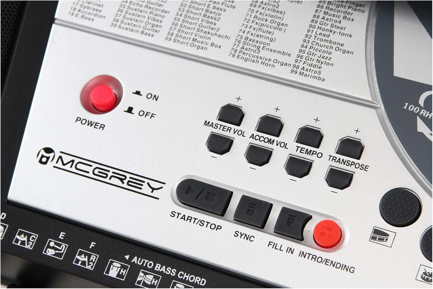 La tastiera geniale per principianti con 61 tasti, display LED, tanti timbri e ritmi fantastici, leggio (agganciabile), microfono e inclusi supporto tastiera e panca Disponibili in totale 100 suoni, 100 ritmi, 8 suoni percussione e varie opzioni di regolazione come la Rhythm Programming Function, registrazione e riproduzione Nessun funzionamento complicato, ma molto semplice e intuitivo per selezionare tutti i suoni e funzioni o per usare lo strumento Grazie alle dimensioni compatte, al peso ridotto e all’alimentazione indipendente (sei batterie AA), la tastiera può essere portata ovunque. Sono naturalmente presenti anche le connessioni per cuffie, uscita stereo (2x3,5 mm jack), microfono e alimentazione (l’adattatore di rete è incluso).