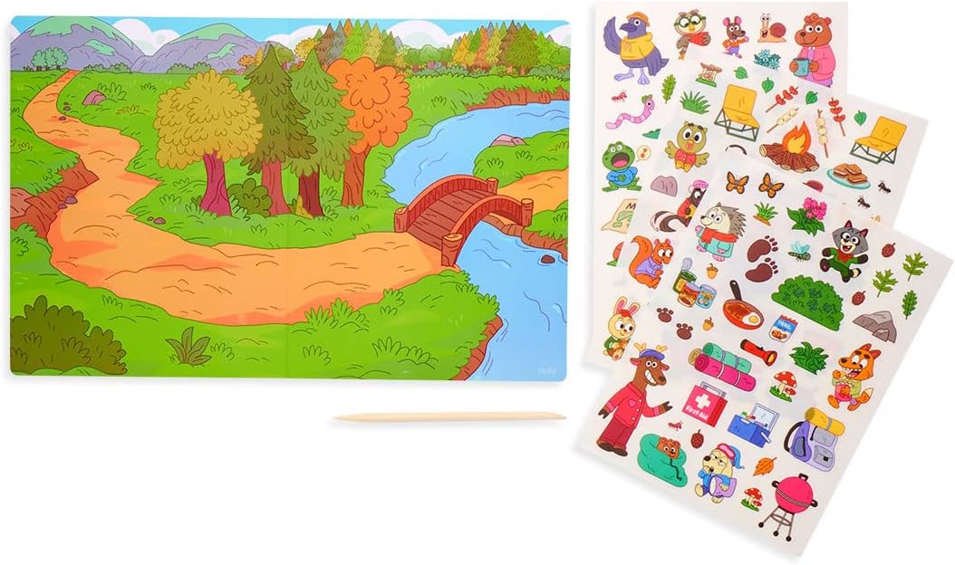 Set il kit adesivi a tema campeggio Scene Include 1 tavola da campeggio fronte/retro (21,6 x 33 cm) Dispone di 60 adesivi di trasferimento per impostare la tua storia in campeggio Include uno strumento di trasferimento in legno per strofinare gli adesivi sulla tavola da gioco Adatto a bambini dai 3 anni in su