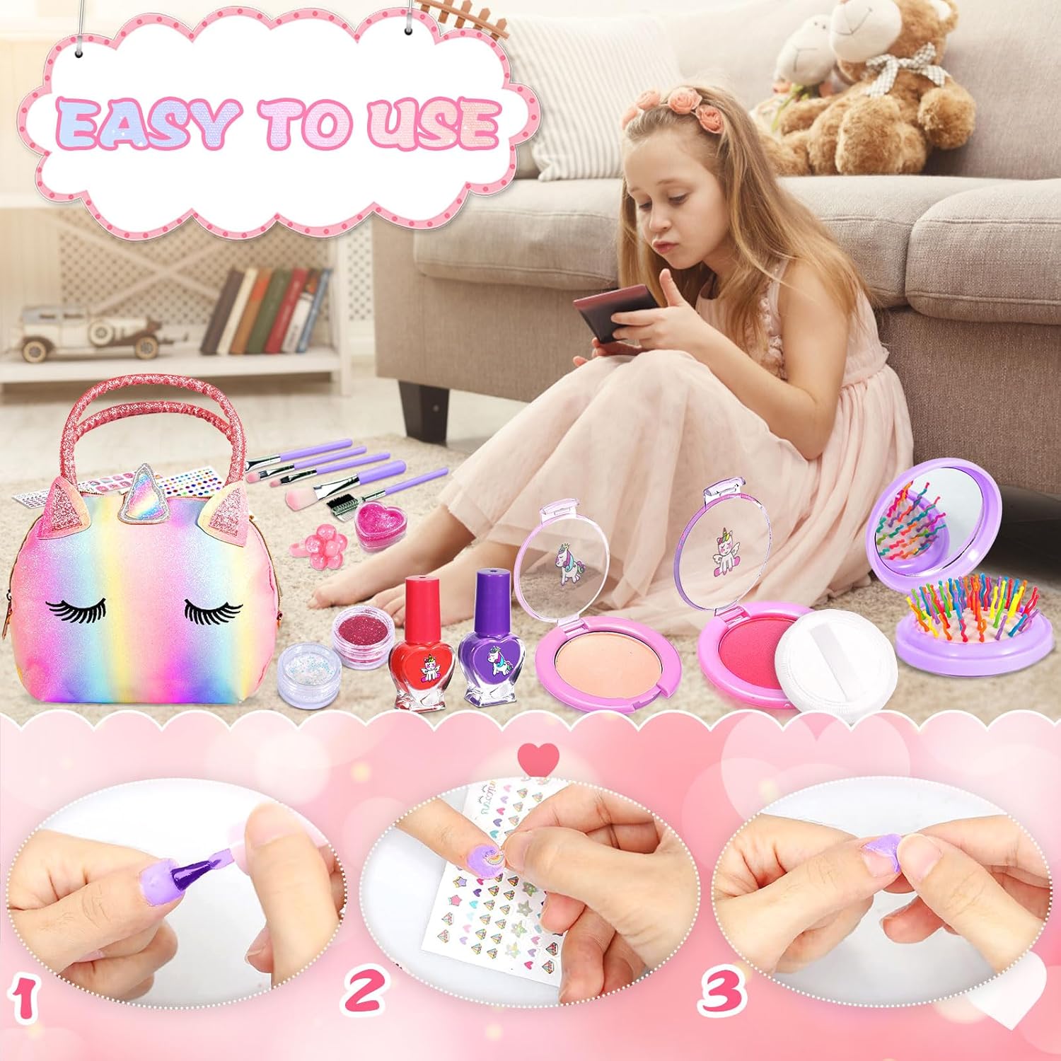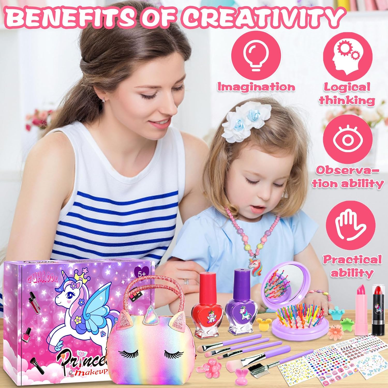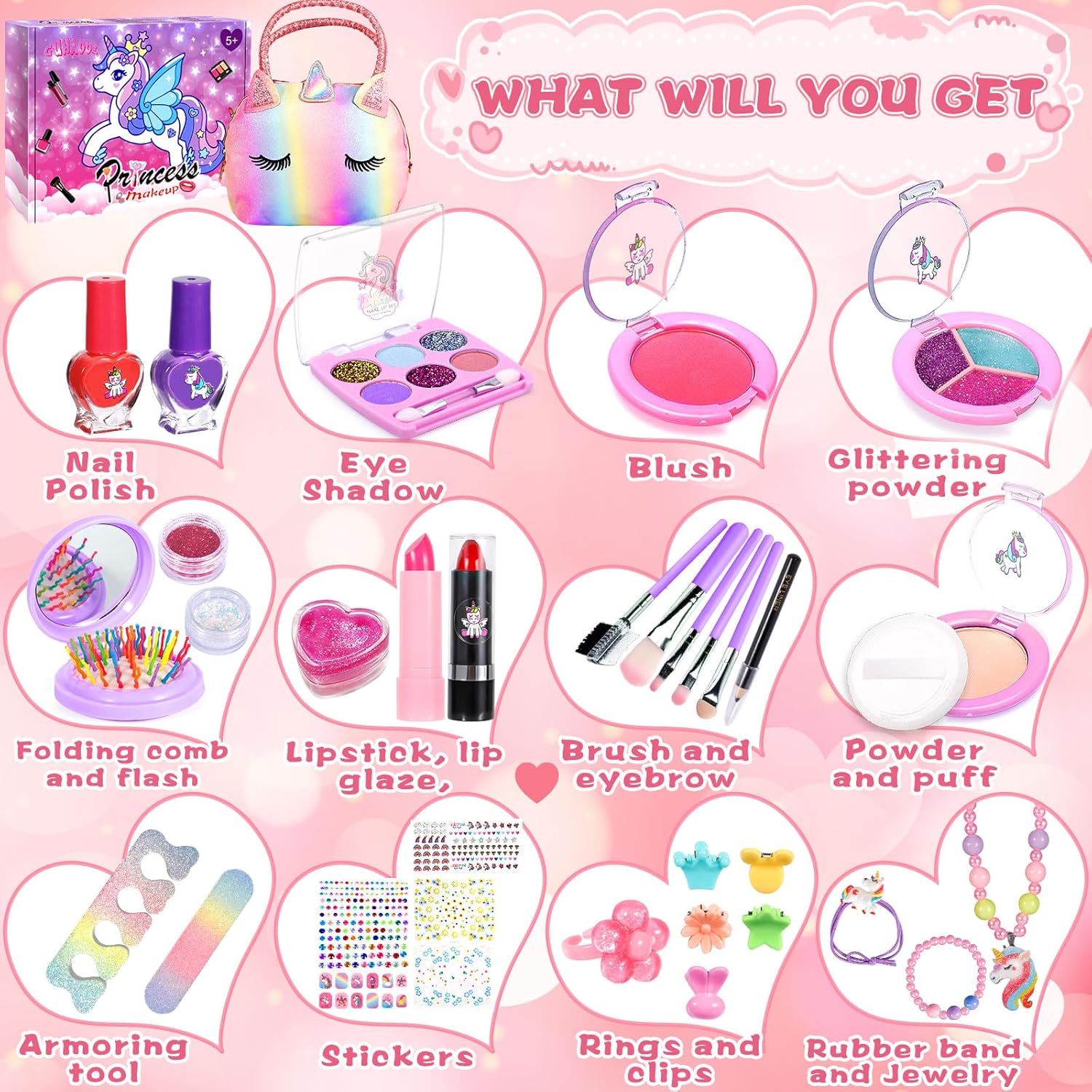 💍【Materiali sicuri e lavabili】 La sicurezza dei prodotti è sempre al nostro centro. La custodia per il trucco per bambine utilizza una formula solubile in acqua, senza conservanti aggiunti, delicata e non irritante, senza alcun peso sulla pelle. Può essere lavato direttamente con acqua, facile da pulire. Cosmetici lavabili, sicuri, non tossici e adatti ai bambini permettono alla tua piccola principessa di godersi il trucco senza preoccupazioni. 💄【Borse per il trucco per ragazze】Incluso: borsa per cosmetici*1,rossetto*2,lucidalabbra*1, pennello per trucco*5, ombretto perlato a tre colori*1,ombretto a sei colori*1,glitter fini*1,glitter perlati*1,pettine *1,fard *1, polvere pressata *1,piumino da cipria *1,matita per sopracciglia *1,lime per unghie *1,separatore per dita *1, 2 smalti per unghie,1 collana,1 braccialetto,adesivi con strass *1,adesivi per unghie *1.Stile casuale: forcina * 5, adesivi *3, anello *1, fascia per capelli *1. 🦄【Giocattoli Educativi per Ragazze】Il nostro set di bellezza per ragazze non solo contiene tutti gli accessori essenziali per il trucco, ma viene fornito anche con una bellissima borsetta per il trucco. Le bambine possono seguire il loro cuore per creare le proprie scatole per il trucco, ma anche coltivare le proprie capacità estetiche, prendersi cura dei propri giocattoli e allenare la consapevolezza della conservazione. 💝【Regalo perfetto per ogni occasione】 Ogni ragazza ha un sogno da principessa. È un regalo perfetto per ogni occasione, compleanno, gioco di ruolo, feste da principessa, appuntamenti di gioco, Natale, ecc. Dopo essersi truccati magnificamente, scoprirai che diventano più sicuri e allegri. Un regalo ideale per il set trucco per ragazze dai 5 anni in su. 👛 【Incoraggiare la creatività e l'intrattenimento】 Amare la bellezza è nella natura di tutti e i bambini non fanno eccezione. Il trucco da gioco può aiutare il bambino a migliorare le capacità motorie, può soddisfare la curiosità e la bellezza dei bambini promuovendo e migliorando la creatività, l'immaginazione e la capacità di apprendimento dei bambini divertendosi. Fornire alla famiglia momenti interattivi e divertenti.