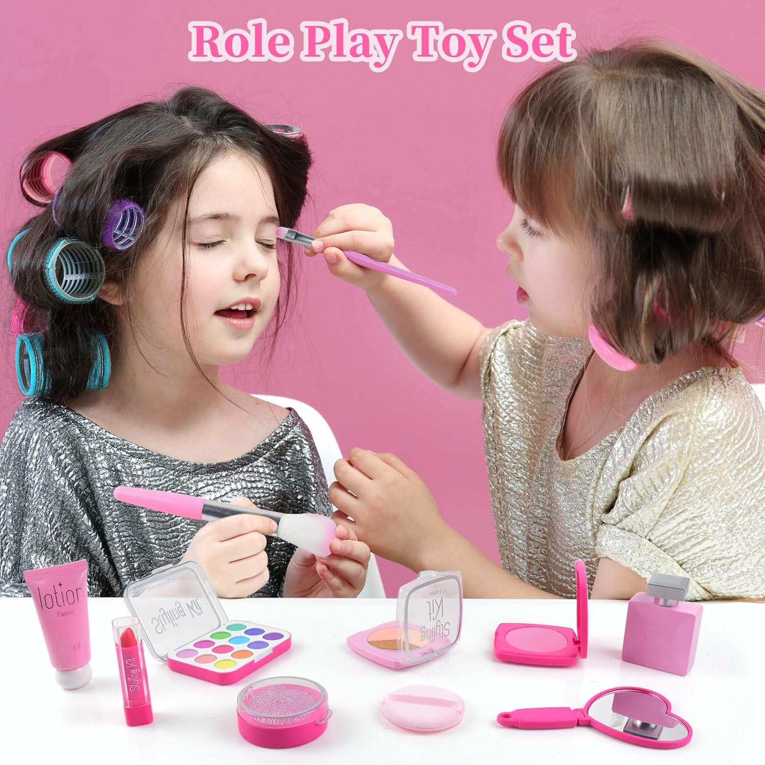 Gioca a un set di trucchi dal design realistico: questo set di trucchi per bambini contiene 11 accessori come rossetto, ombretto, fard e altro ancora. Gli accessori sembrano veri trucchi ma non hanno una vera applicazione: sicuri e divertenti per i bambini. Incoraggia il gioco di ruolo creativo: perfetto per il gioco di ruolo in cui i bambini praticano la creatività, le abilità sociali e lo sviluppo cognitivo imitando il "gioco degli adulti". Sicuro e innocuo: realizzato in acrilico ecologico di alta qualità, il set è durevole, non tossico e adatto a bambini dai 3 anni in su. Set completo per un divertimento senza fine: include 2 pennelli, 1 rossetto, 1 tavolozza di ombretti, 1 flacone spray, 1 fard, 1 piumino da cipria, 1 specchio, 1 polvere per contorni, 1 compatto di cuscino e 1 detergente: tutto per un'esperienza di trucco realistica. REGALO IDEALE PER RAGAZZE: un regalo perfetto per compleanni, Natale o occasioni speciali. Questo set di trucchi incoraggia il gioco fantasioso e delizia le ragazze dai 3 anni in su.