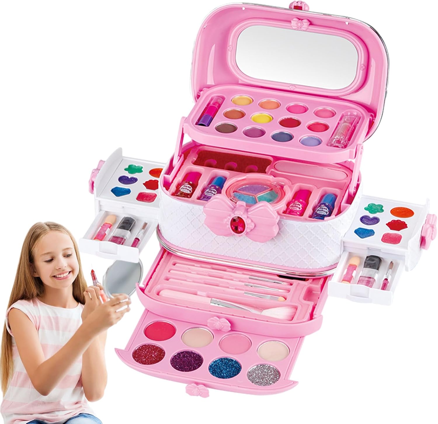 Formula delicata sulla pelle: contiene sottili texture delicate e sostanze compatibili con la pelle in formulazione delicata per ridurre il rischio di irritazione durante l'applicazione Pulizia rapida: la texture liscia consente di rimuovere facilmente il kit di trucco per bambini, facilita la pulizia e minimizza lo sforzo per i genitori stressati Set di trucco: offre ricche possibilità di combinazione con diversi articoli per il trucco, ispirati a giochi di ruolo fantasiosi e consente di sperimentare in sicurezza il divertimento dell'imitazione del trucco Competenza creativa: sviluppa capacità di concentrazione e abilità pratiche attraverso un gioco di trucco che stimola la fantasia, stimola la creatività e favorisce l'apprendimento attivo nei bambini Design principessa: il design accattivante della principessa aumenta il fascino del set, risveglia l'interesse dei bambini e rende il trucco divertente visivamente accattivante.