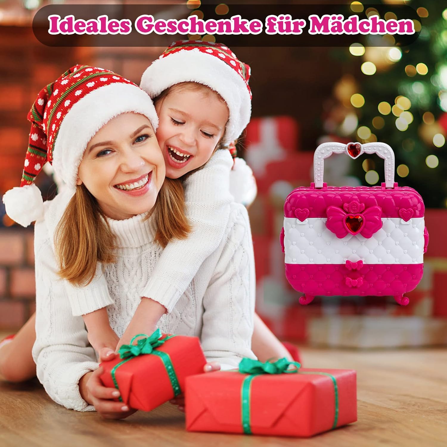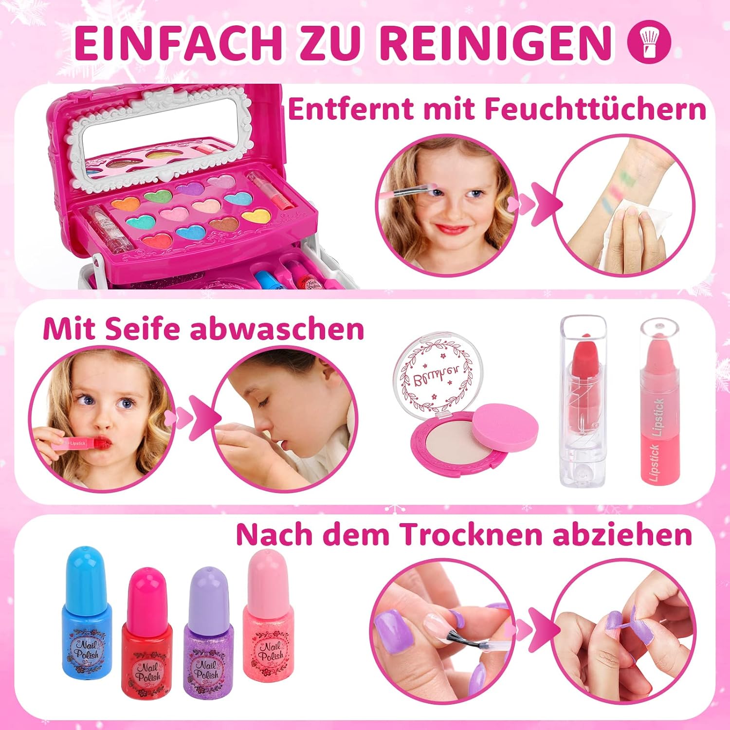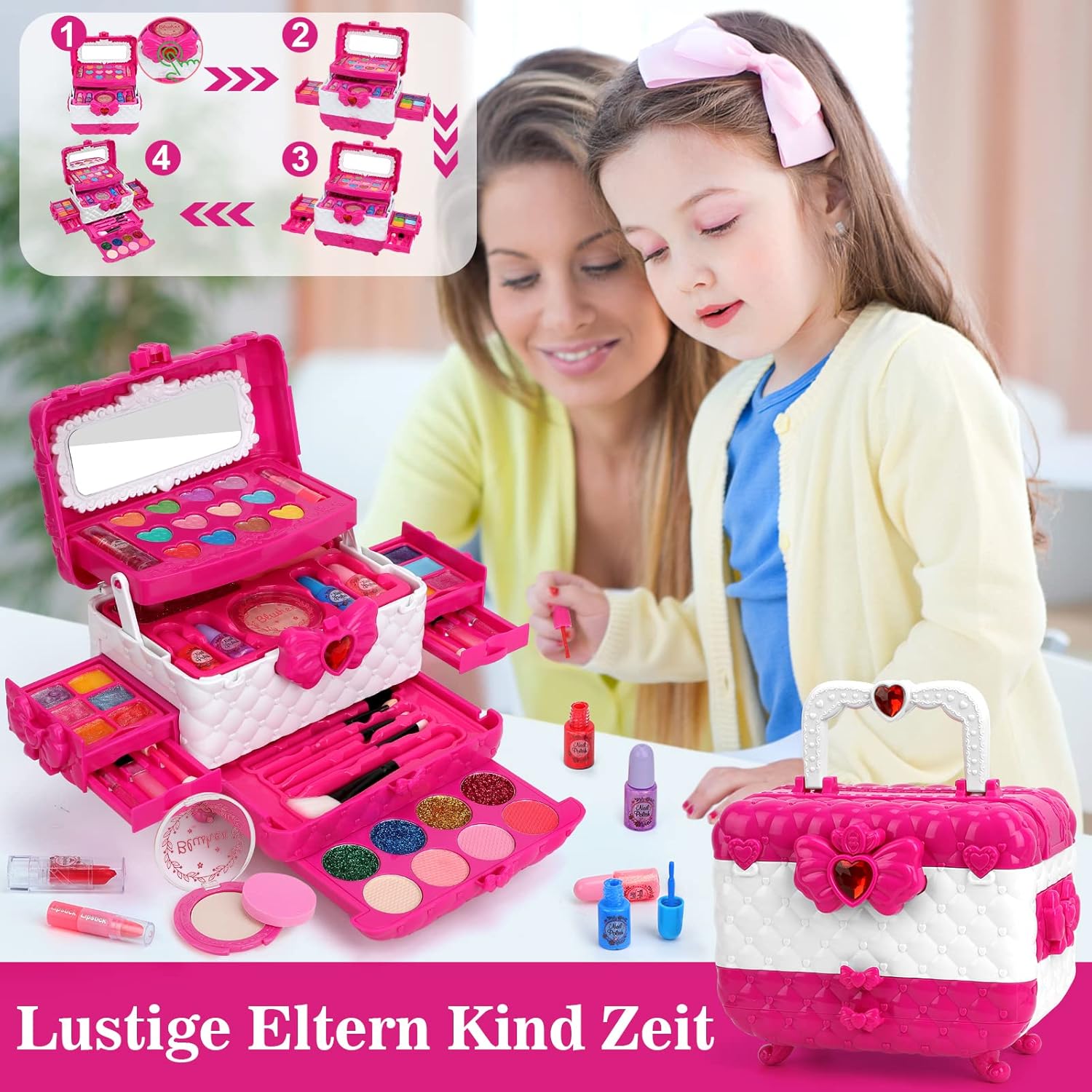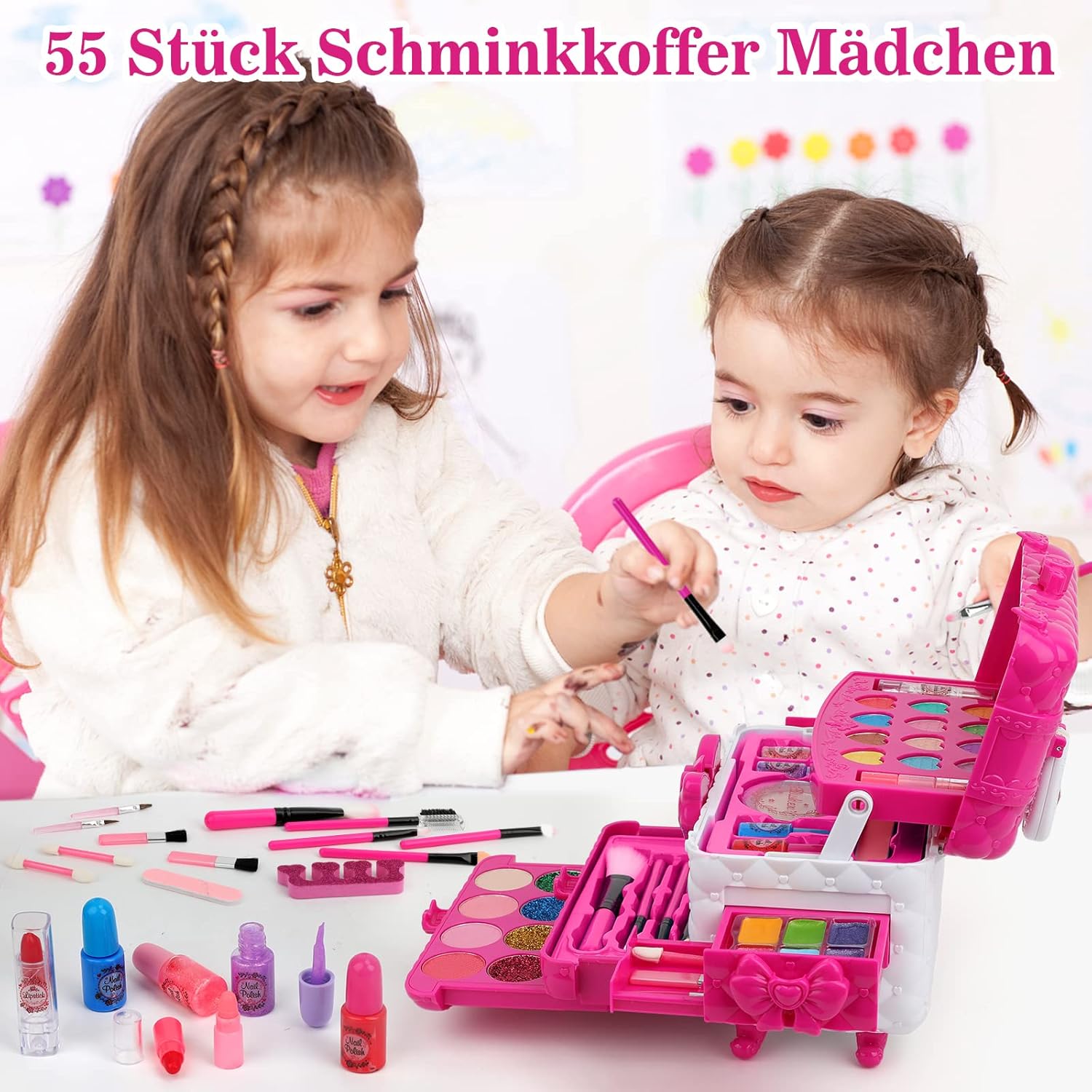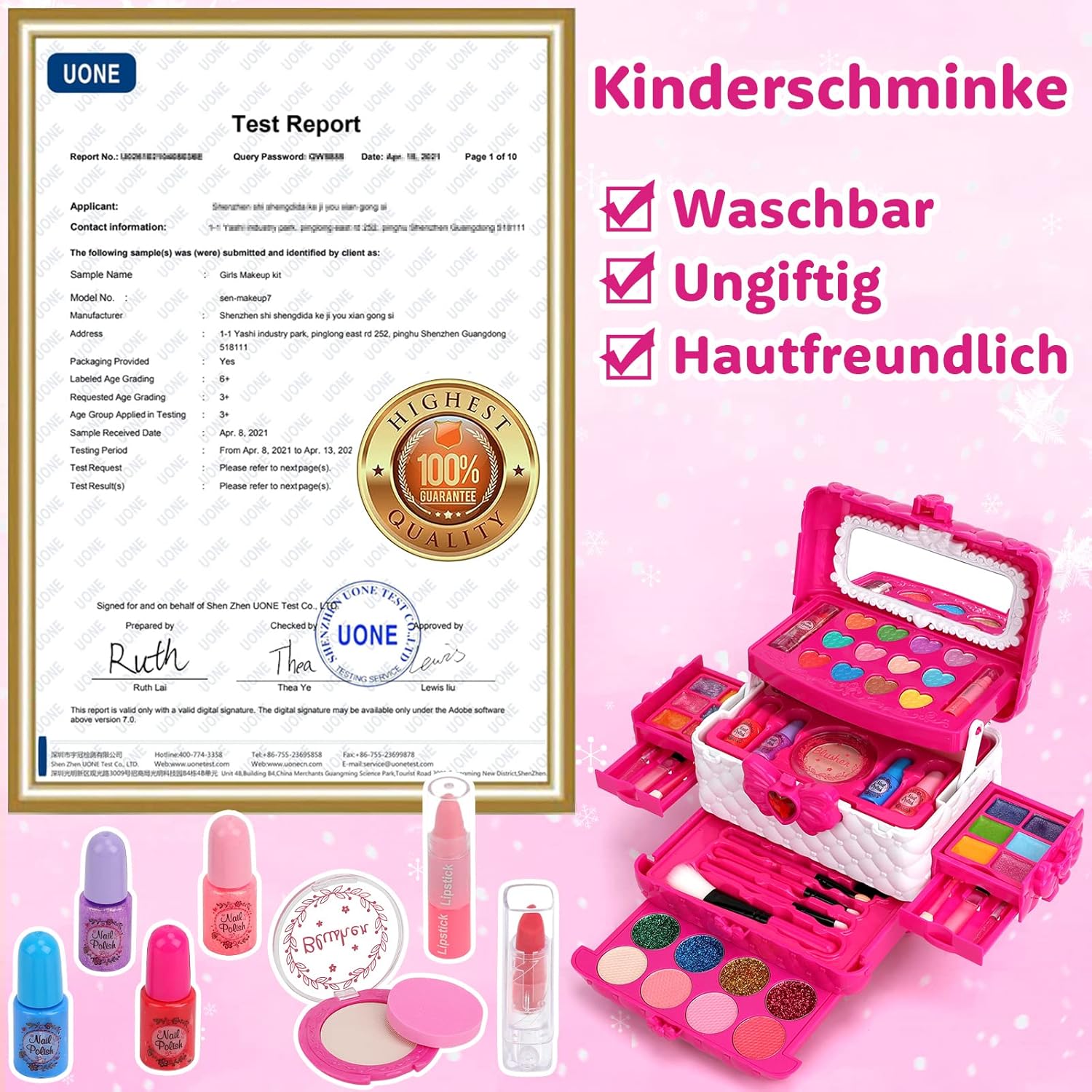 【Focus sulla sicurezza dei bambini - Materiale sicuro e di alta qualità】 Il set per il trucco per bambini è realizzato con ingredienti delicati, non tossici, lavabili e di lunga durata e ha superato la certificazione di sicurezza europea per i giocattoli per bambini. Sicuro e protetto, facile da pulire. 【Giocattolo set trucco per bambini per ragazze】: questo set trucco lavabile per ragazze ha 55 accessori. Include rossetto/cipria compatta/ombretto/fard in polvere/smalto per unghie/pennelli per trucco/sbuffo/separatore per infradito... che si tratti di un bellissimo trucco o di una manicure, può essere utilizzato per il piacere delle ragazze con un vero divertimento nel vestirsi. Lascia che la bambina realizzi il sogno della principessa.,Piccola e leggera, facile da trasportare: la custodia per trucchi per ragazza aperta misura 35 x 14 x 22 cm. Lo stato chiuso è 20*17*11 cm. Può essere giocato a casa ed è anche un must per le vacanze in famiglia con la tua principessa. 【Ispira l'immaginazione dei bambini】 Questo set completo di trucchi per bambini e giocattoli per ragazze può soddisfare tutto ciò di cui i bambini hanno bisogno per il trucco, come la loro madre. Inoltre, evita che i tuoi piccoli distruggano i tuoi costosi prodotti per il trucco. 【Regalo ideale per ragazze】 Se stai ancora pensando a quale regalo scegliere per la tua bambina, non esitare, scegli il nostro giocattolo per il trucco per ragazze, la tua bambina sarà felice e sorpresa. Che si tratti di un compleanno, di Natale, di Halloween o di altre festività, un set di trucchi per bambini è il regalo ideale per le ragazze di 5, 6, 7, 8, 9, 10 o 11 anni.