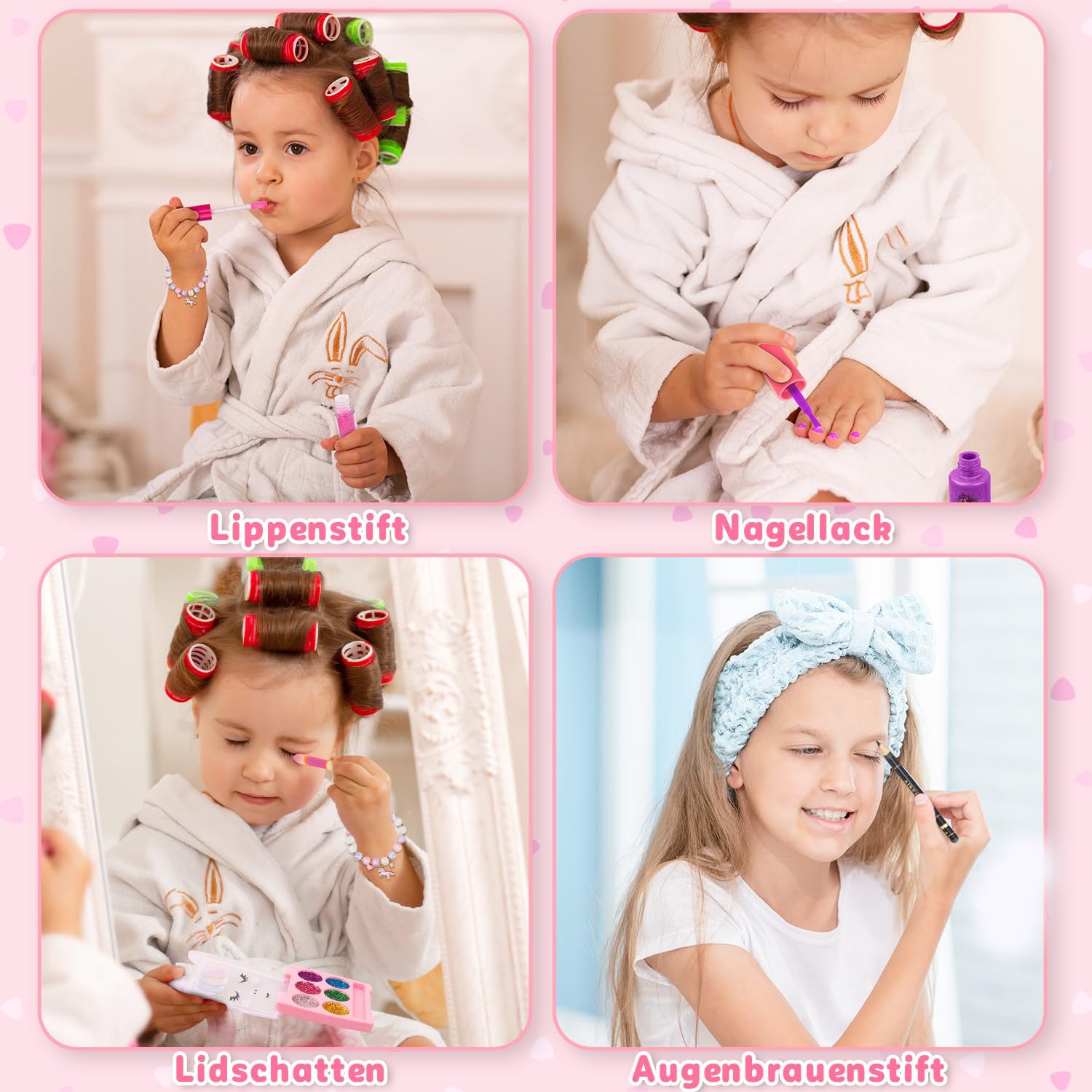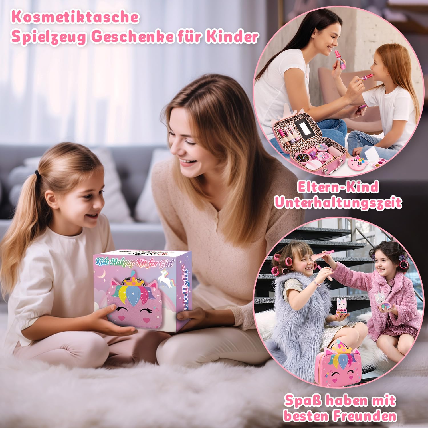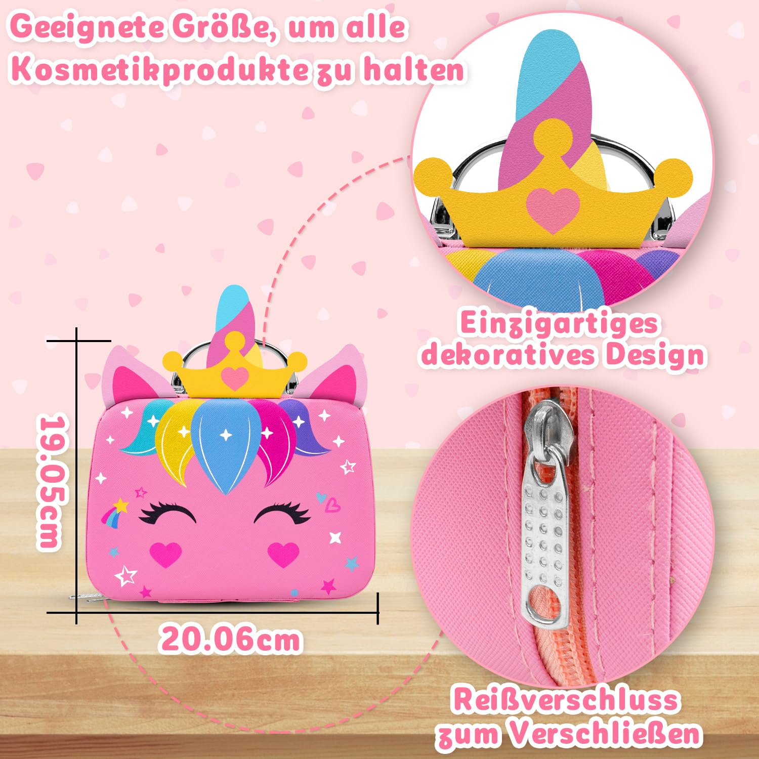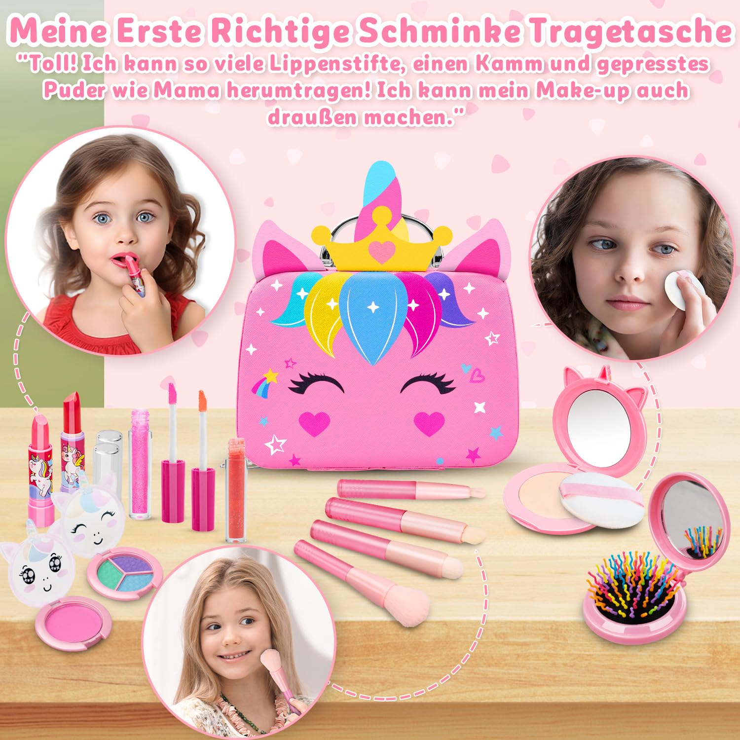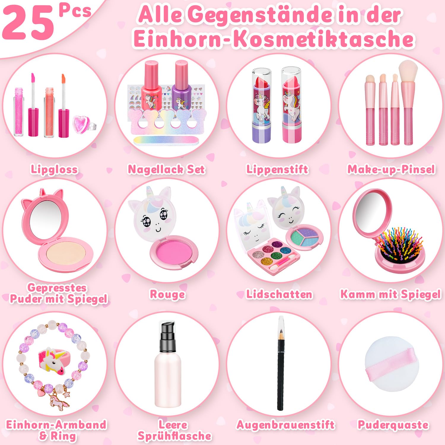 【Vero set di trucchi per bambini per ragazze】: tutti i cosmetici e gli strumenti per smalti sono pronti! Il portafoglio unicorno contiene tutti gli oggetti. Il trucco da 25 pezzi include 2 rossetti, 2 lucidalabbra, 1 lucidalabbra ad anello, 1 polvere pressata con specchio, 1 fard, 1 ombretto trio, 1 ombretto lucido a 6 colori con pennello, 1 matita per sopracciglia, 1 piumino da cipria, 2 smalti, 1 separatore per dita, 1 lima per unghie, 1 set di adesivi per unghie, 1 flacone spray vuoto, 4 pennelli per trucco, 1 pettine con specchio, 1 anello con unicorno, 1 braccialetto con unicorno. 【Borsa per unicorno aggiornata dal design unico】: la custodia per il trucco di unicorno con la migliore praticità in base alle preferenze della ragazza per i viaggi. Con 4 rossetti o lucidalabbra, pettine con specchio, matita per sopracciglia e così via, le ragazze possono portare con sé strumenti per il trucco come mamma. Metti squisiti rossetti nella borsa dei bambini e soddisfa la curiosità di tutte le ragazze riguardo al trucco senza distruggere i cosmetici della mamma! 【Giocattolo per il trucco dei bambini sicuro e lavabile】: gli ingredienti cosmetici che sono sicuri e non causano irritazione alla pelle del bambino sono la nostra prima considerazione. Tutti gli articoli del set trucco per ragazze sono delicati, lavabili e facili da rimuovere. Dopo aver superato il test cutaneo per diversi tipi di pelle. Tu e il tuo bambino potrete divertirvi e giocare con sicurezza! Facile da riporre e trasportare: promuove la consapevolezza dei bambini sulla conservazione e la cura dei giocattoli fin dalla tenera età. La dimensione adatta della borsa tote unicorno per ragazze per contenere tutti i cosmetici e gli strumenti per unghie, insegna ai bambini a riporre i giocattoli e a conservarli ordinatamente. La custodia della borsa per unicorno è comoda anche per il trasporto. Goditi il tempo per l'imitazione del trucco con la famiglia e gli amici. 【Set trucco per bambini】: realizza i sogni da principessa delle ragazze! Il set per il trucco può migliorare le capacità estetiche delle ragazze, stimolare il pensiero sulle armonie dei colori e sulla creatività e rafforzare le loro abilità pratiche. Fornisce infinite ore di interazione genitore-figlio. Il bellissimo aspetto e le ricche parti interne lo rendono un regalo di Natale, Festa dei bambini e compleanno per ragazze di 3, 4, 5, 6, 7, 8, 9, 10, 11, 12+ anni!