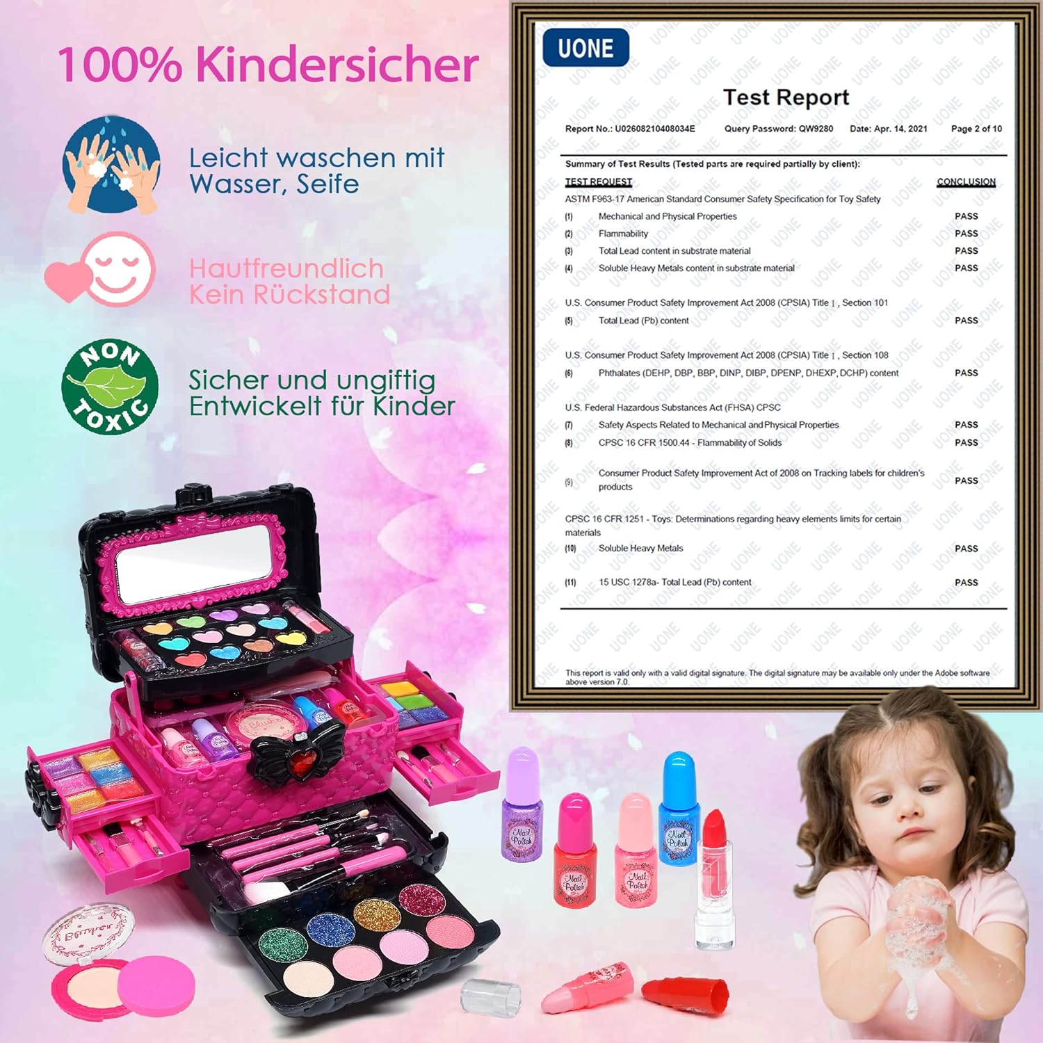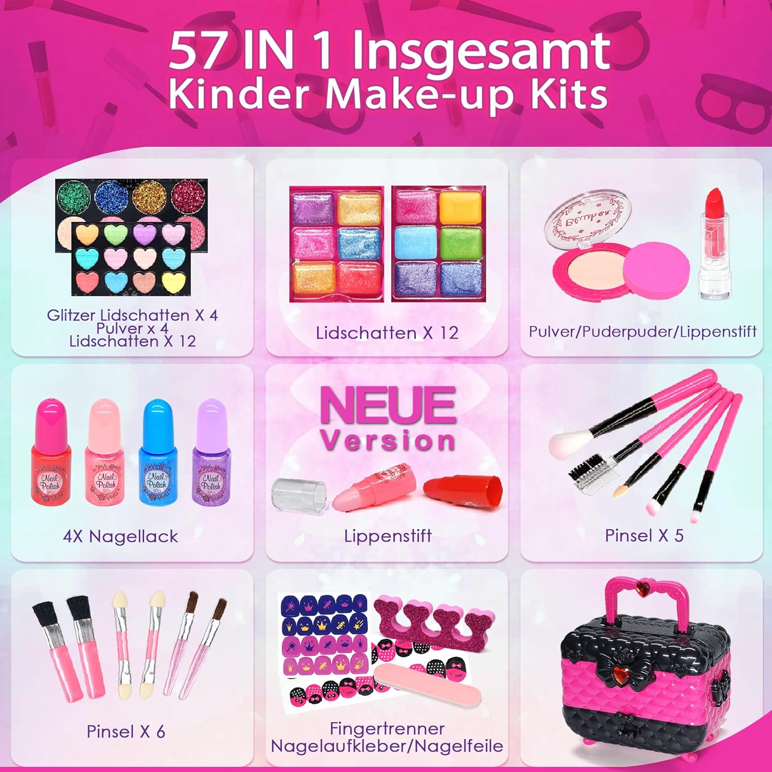 🎊Giocattoli per ragazze adatti ai bambini - Quando si sceglie un set per il trucco per ragazze, è importante assicurarsi che i prodotti siano adatti all'età e sicuri da usare per i bambini. I giocattoli per il trucco Amerrly per ragazze sono giocattoli per il trucco sicuri, non tossici e lavabili. Quando il divertimento è finito, puoi semplicemente lavare via il trucco che tuo figlio ha usato con acqua e sapone. 🎊 Set di trucchi per bambini - Il nostro set di trucchi per bambini da 57 pezzi è un ottimo set per iniziare per i tuoi piccoli. Contiene tutto ciò che una bambina può desiderare per il trucco. Ombretto, fard, rossetto, smalto, fondotinta, pennello per il trucco, lima per unghie, separatore per unghie, adesivo per unghie, 4 palette di ombretti e fard con 32 colori. Il trucco dei nostri bambini è un "vero trucco" e sicuramente delizierà i più piccoli. 🎊Incoraggia il trucco creativo - Amerrly beauty case per bambine dai 4 ai 12 anni in colori molto graziosi che trasformano i momenti di gioco in un piacevole passatempo, ispirato alle fiabe e alle principesse, porta le ragazze in un magico mondo di fantasia e moda attraverso l'interazione con i vari accessori e oggetti disponibili. Giocare con l’immaginazione promuove la creatività, le abilità sociali e lo sviluppo cognitivo. 🎊Regalo perfetto per ragazze per ogni occasione - Il nostro set di trucchi per bambini non è solo un fantastico giocattolo con cui le bambine possono giocare, ma è anche un ottimo regalo. Che si tratti di un compleanno o di un'altra occasione speciale, il nostro set di trucchi per bambine è il regalo perfetto per le ragazze che amano vestirsi e sperimentare look diversi. 🎊Custodia per il trucco a sorpresa per ragazze: una borsa tote carina e compatta con una varietà di scomparti per tenere occupate le tue piccole dive! Ci sono così tanti livelli e argomenti che è molto interessante. Tutto il trucco si inserisce in una custodia per il trucco lucida facile da trasportare. La valigia ha un design divertente, ispirato alle principesse, che delizierà ogni bambina e costituirà una fantastica aggiunta alla sua collezione di giocattoli.