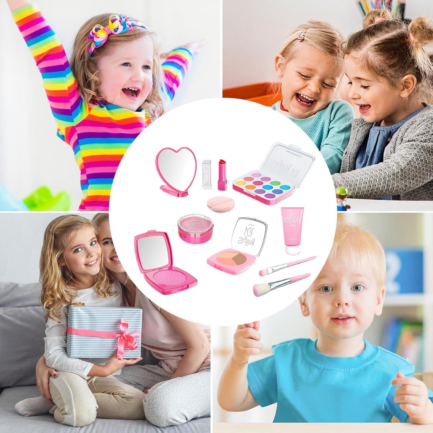 SERVIZIO SICURO: Con il nostro set di trucchi per bambini, i tuoi bambini potranno divertirsi con i giochi di ruolo in sicurezza e senza preoccupazioni perché utilizziamo materiali sicuri. I genitori possono stare certi che i loro figli sono al sicuro. SODDISFA LE TUE ESIGENZE CREATIVE: I nostri kit trucco per bambini offrono ai bambini l'opportunità di esprimersi attraverso il trucco, con una varietà di strumenti e accessori facili da usare e sicuri per la pelle giovane. Nessun problema di pulizia: il nostro set di trucchi per bambini è la soluzione perfetta per i genitori che vogliono lasciare che i propri figli giochino liberamente senza preoccuparsi del disordine. Progettato appositamente per i bambini, questo semplice set per il trucco non richiede un trucco serio e non richiede molta pulizia. MIGLIORA IL GIOCO SOCIALE: lascia correre l'immaginazione di tuo figlio con il set di trucchi per bambini. Questo set divertente e sicuro simula scene di trucco migliorando le abilità di gioco di ruolo. Inoltre promuove la comunicazione, migliora l'interazione con gli amici, aiuta i bambini a sviluppare abilità sociali e aumenta la fiducia in se stessi e la creatività. OTTIMO REGALO PER BAMBINI: incoraggia l'immaginazione di tuo figlio con questo set di trucchi per bambini, perfetto per incoraggiare l'espressione creativa e il gioco fantasioso. Con un trucco atossico e lavabile, questo set garantisce che la tua piccola principessa possa godersi più tempo in modo sicuro e divertente.