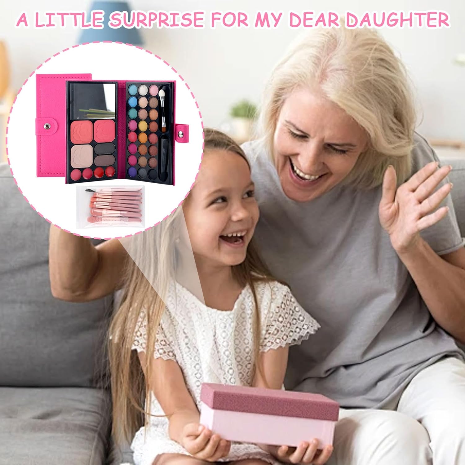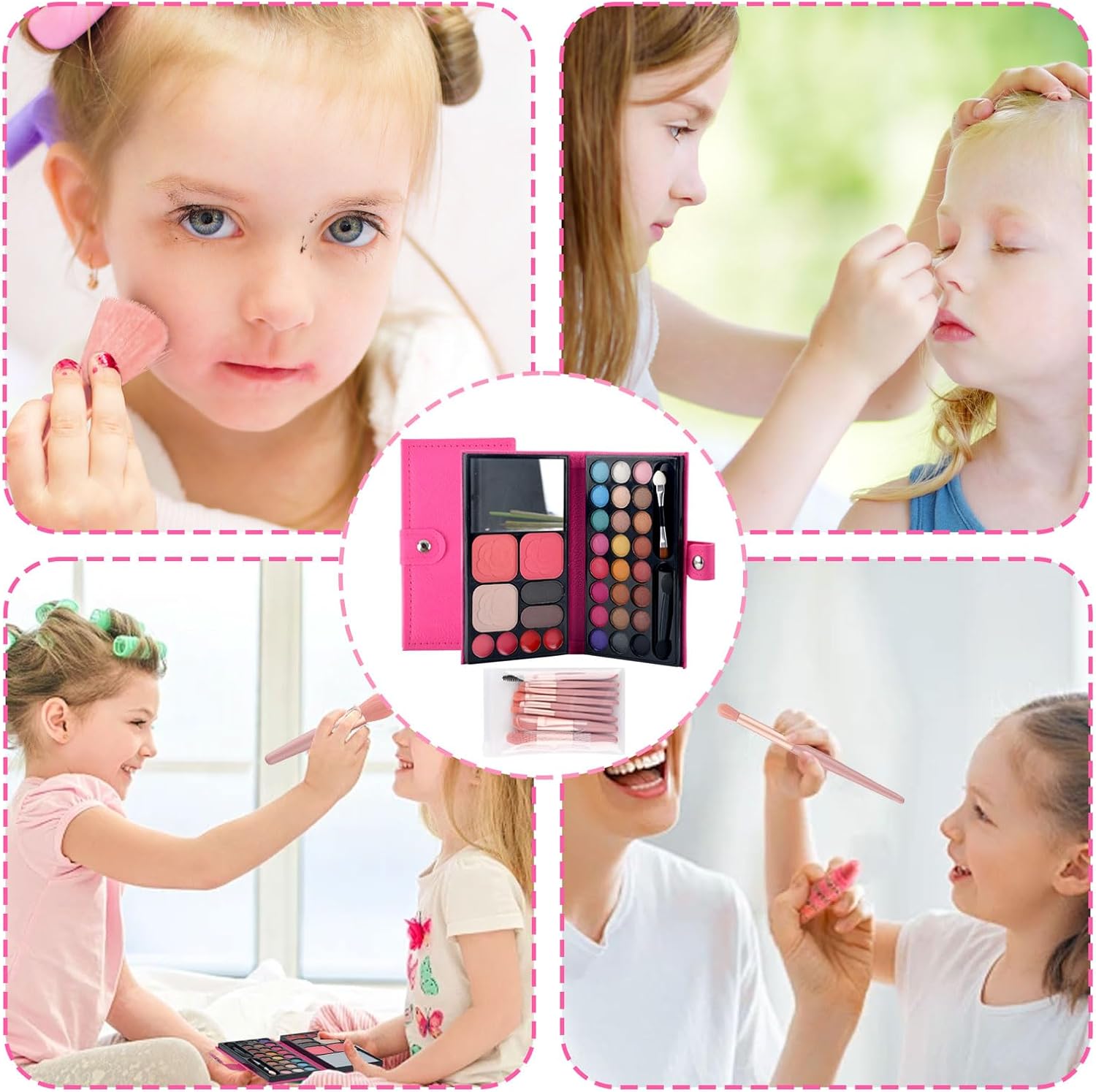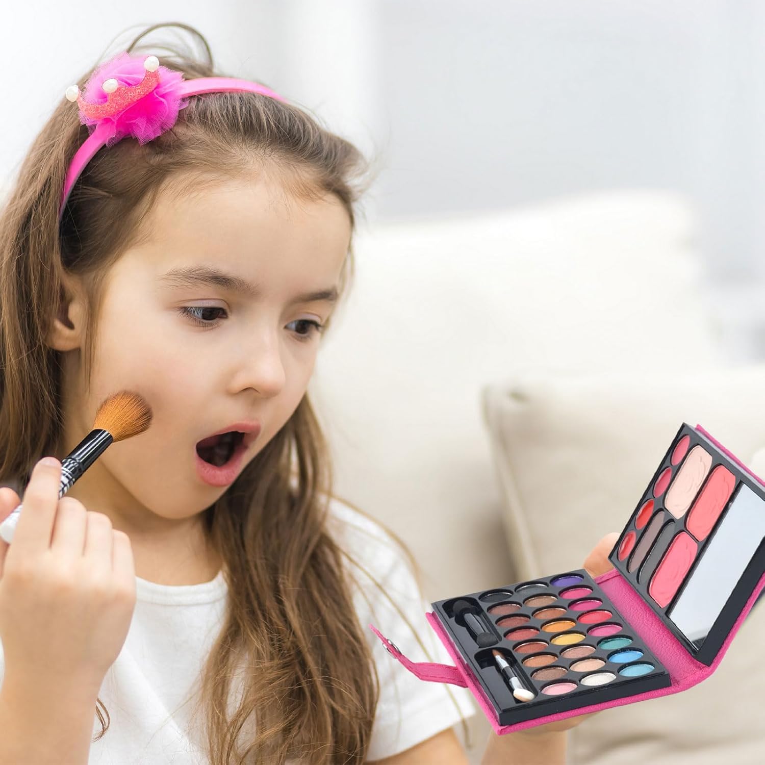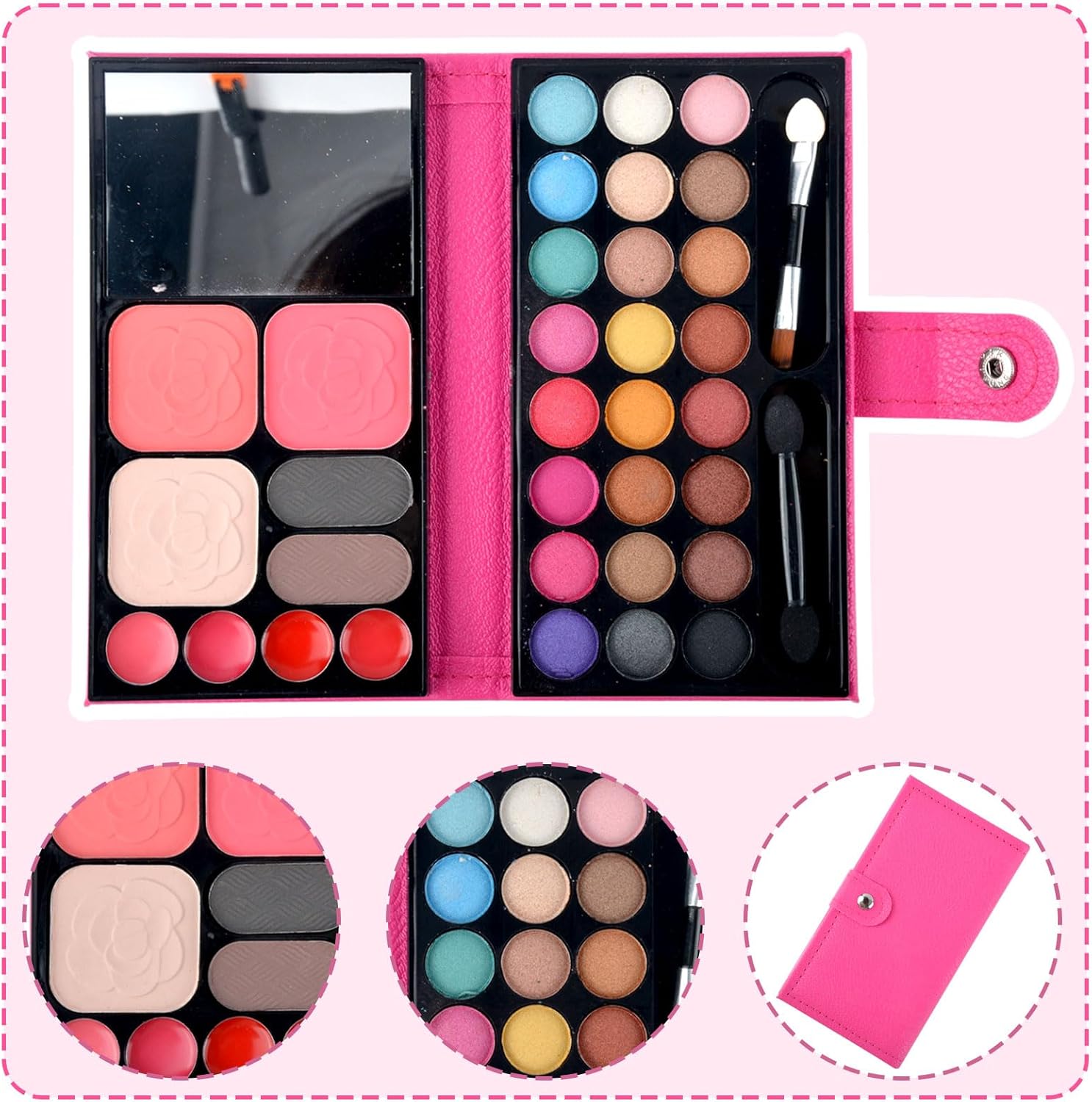 Set trucco per bambini: questo è un set di giocattoli per il trucco per piccole principesse, in cui riceverai 1 vassoio per trucco colorato da 33 colori e un set completo di 8 pennelli per trucco per bambini per soddisfare la curiosità e le esigenze del trucco dei bambini. Sicuro e non tossico: il nostro set per il trucco per ragazze e bambini è realizzato con materiali sicuri e solubili in acqua, che possono essere lavati con acqua tiepida. Non contiene conservanti ed è delicato e non irritante. Non devi preoccuparti che tuo figlio si sporchi il viso e i vestiti perché è facile da lavare. Ispira l'immaginazione dei bambini: tutte le piccole principesse sognano di avere i propri cosmetici, come le loro madri. Questo set completo di prodotti può soddisfare la loro curiosità sui cosmetici, stimolare la loro estetica e creatività e impedire ai bambini di danneggiare i tuoi costosi cosmetici. Portatile: il vassoio per il trucco per bambini è adatto alle bambine da utilizzare all'interno e all'esterno. Squisito e leggero, può essere riposto in una borsa. Adatto per le bambine da trasportare e può essere utilizzato in qualsiasi momento per varie occasioni come viaggi e riunioni. Ottimo regalo: è il miglior regalo per vacanze come Natale, Halloween, feste di compleanno, ecc. Le ragazze e i loro amici possono divertirsi insieme con i giocattoli per bambini truccati e la tua piccola principessa sarà sicuramente molto felice.