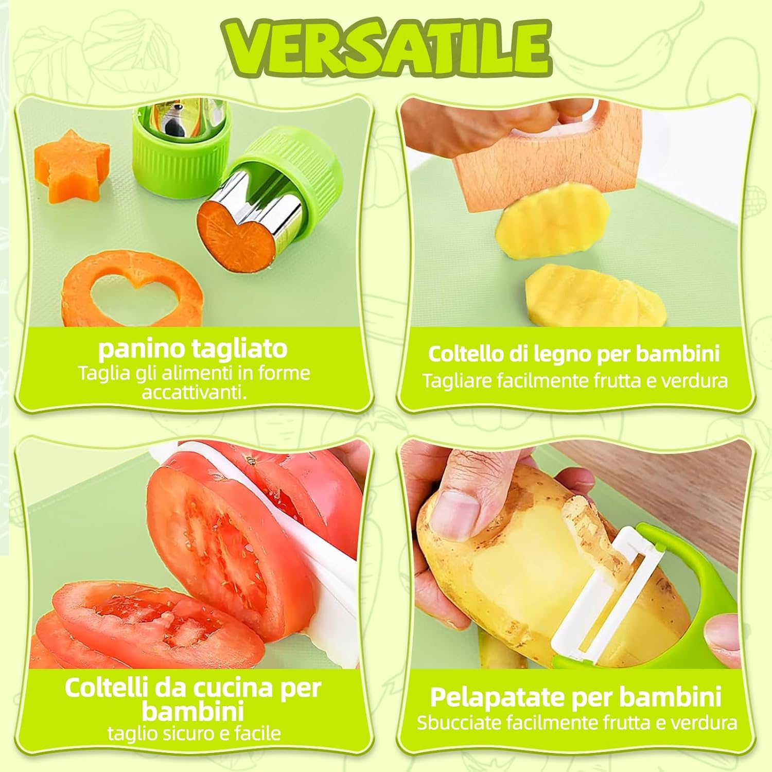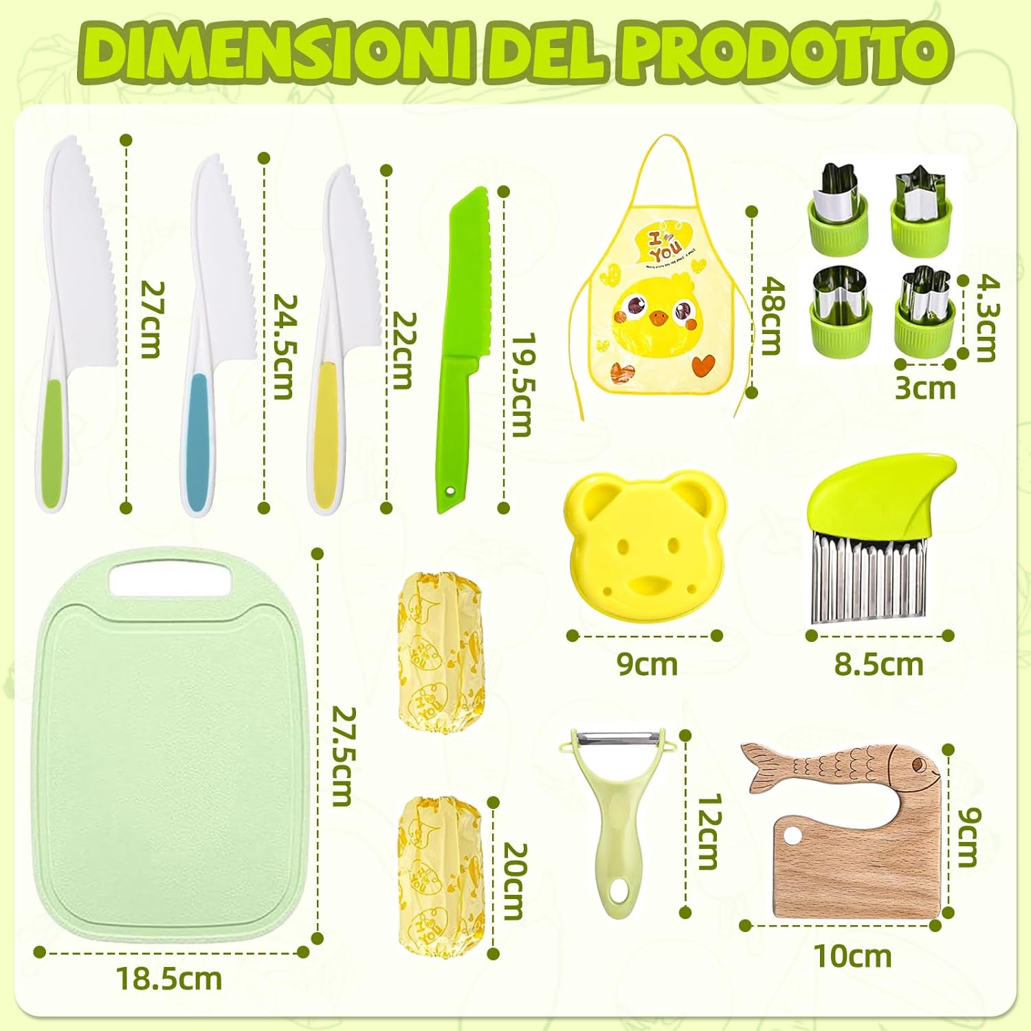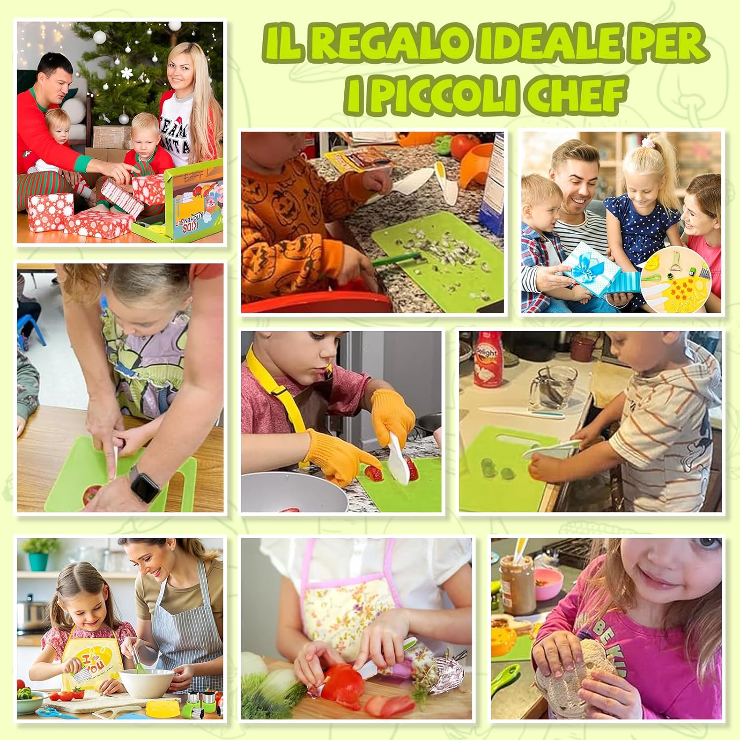 MATERIALI ROBUSTI: Ogni utensile è realizzato in materiale idoneo al contatto con alimenti, privo di BPA, resistente e senza odori. La superficie liscia e la lavorazione accurata permettono ai bambini di tagliare frutta e verdura in sicurezza, imparando a cucinare divertendosi come i grandi. SET COMPLETO: La confezione include 16 pezzi diversi: coltelli per bambini, pelapatate, coltello in legno, stampi per sandwich, pressa per toast, grembiule, copri maniche, tagliaverdure ondulato e tagliere. Ogni accessorio è studiato per insegnare i gesti base e rendere i bambini protagonisti in cucina. DESIGN A MISURA DI BAMBINO: Leggeri e decorati con motivi giocosi, gli utensili stimolano la curiosità dei più piccoli e li invogliano a partecipare. La lama seghettata taglia facilmente patate, carote, cetrioli o banane, mentre l’impugnatura ergonomica assicura comfort e sicurezza. STIMOLA LA CREATIVITÀ: Non è un semplice giocattolo: questo set trasforma la cucina in un ambiente educativo e divertente. I bambini sviluppano coordinazione, fiducia in sé stessi e creatività preparando le proprie ricette e vivendo esperienze indimenticabili. IDEA REGALO PERFETTA: Perfetto per compleanni, Natale, Halloween, feste o momenti in famiglia. Questo set entusiasma grandi e piccini, porta allegria e creatività in cucina e accende la passione dei piccoli chef in erba.