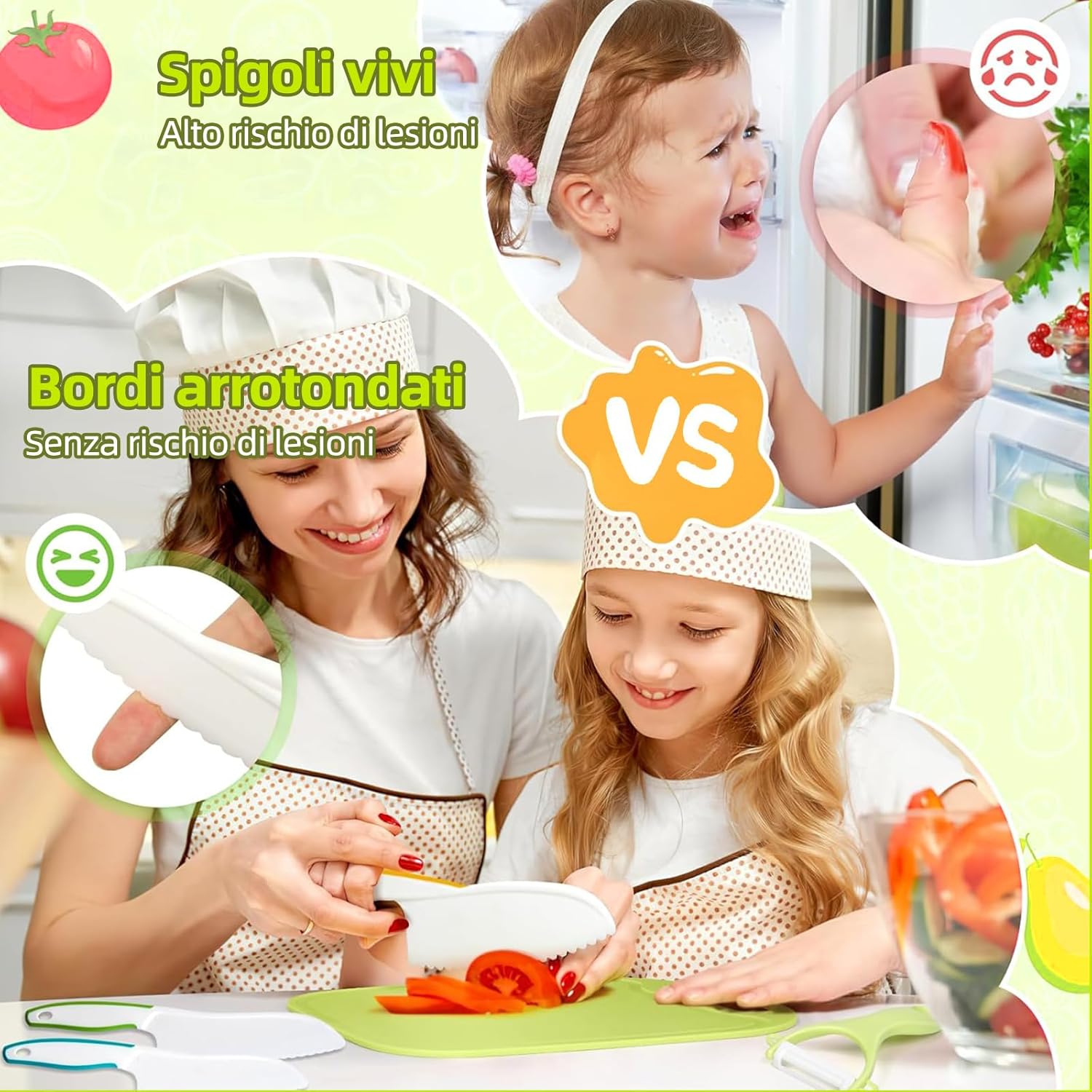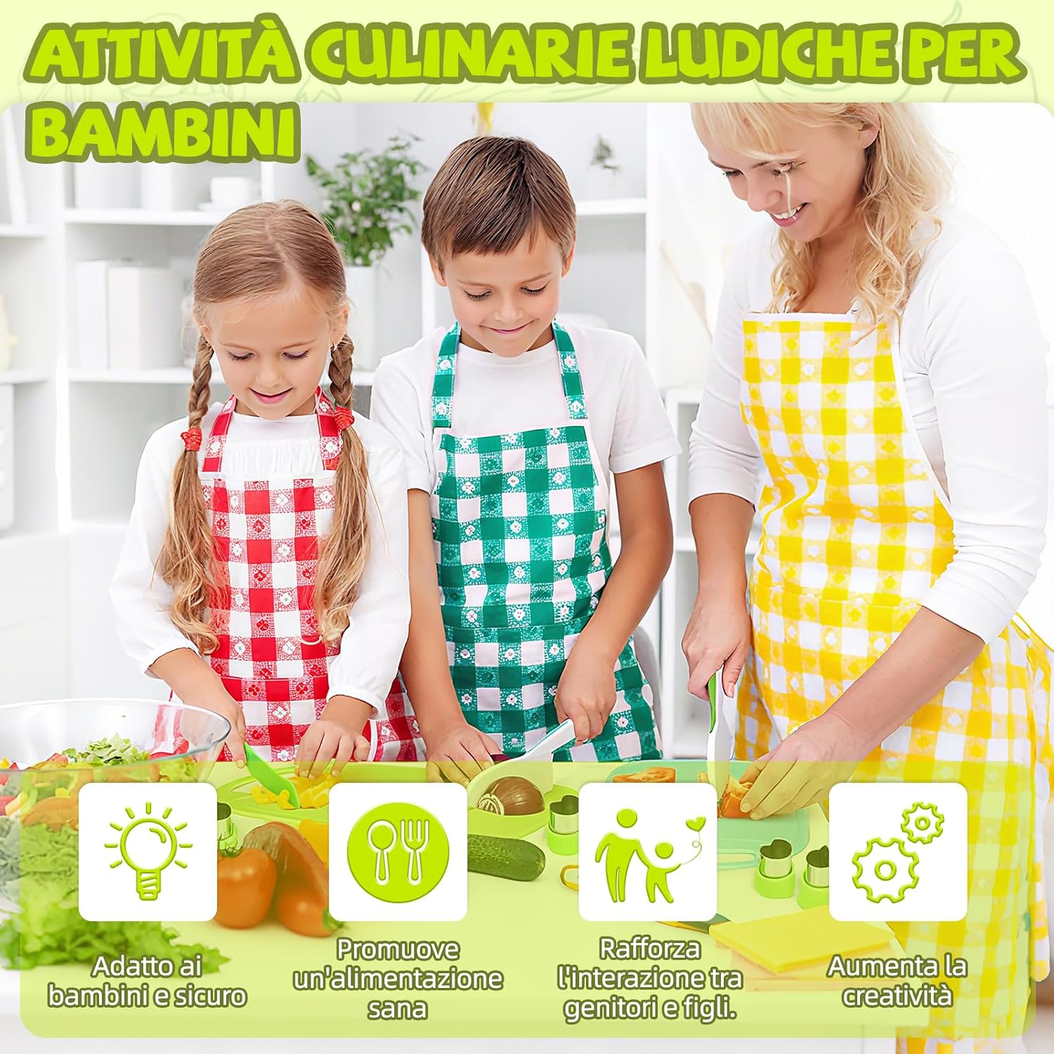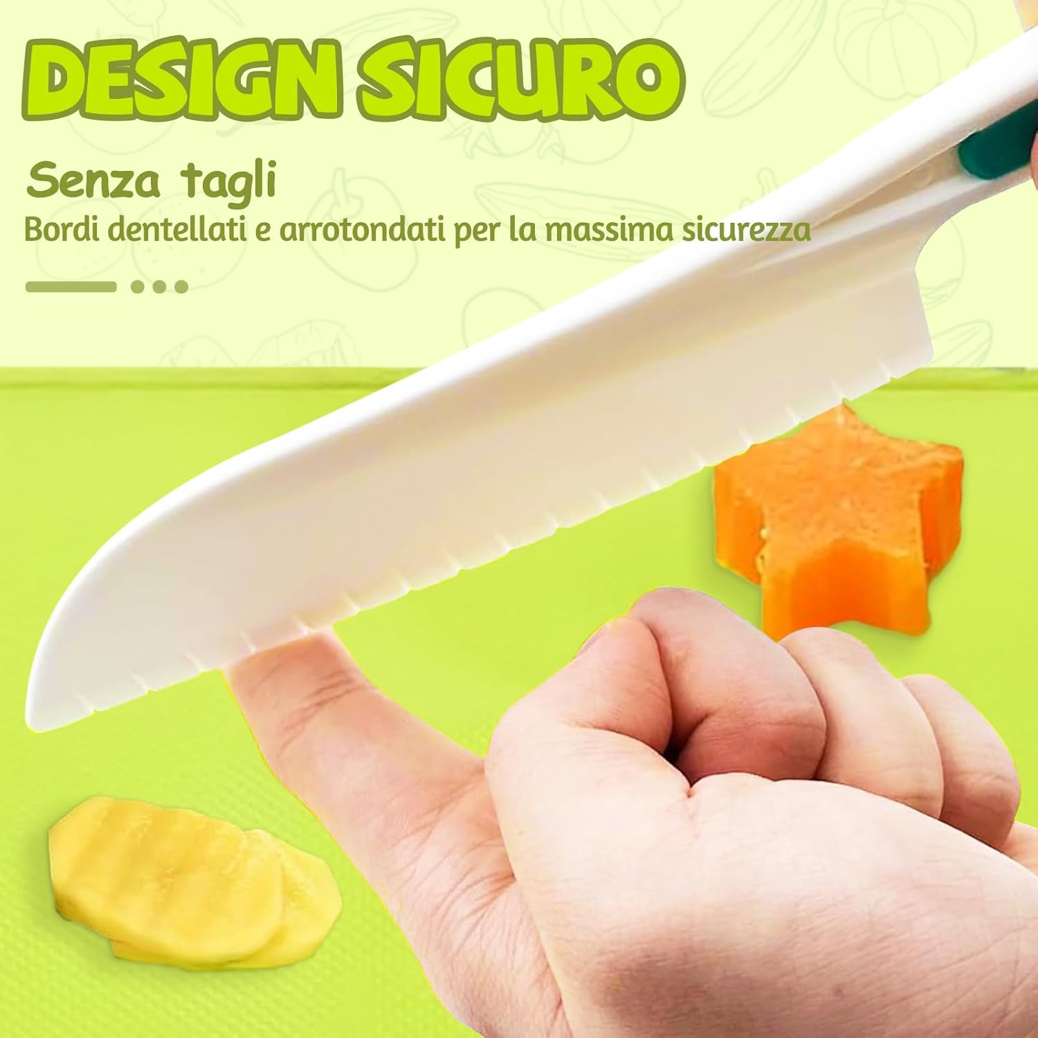 MATERIALI ROBUSTI: Ogni utensile è realizzato in materiale idoneo al contatto con alimenti, privo di BPA, resistente e senza odori. La superficie liscia e la lavorazione accurata permettono ai bambini di tagliare frutta e verdura in sicurezza, imparando a cucinare divertendosi come i grandi. SET COMPLETO: La confezione include 16 pezzi diversi: coltelli per bambini, pelapatate, coltello in legno, stampi per sandwich, pressa per toast, grembiule, copri maniche, tagliaverdure ondulato e tagliere. Ogni accessorio è studiato per insegnare i gesti base e rendere i bambini protagonisti in cucina. DESIGN A MISURA DI BAMBINO: Leggeri e decorati con motivi giocosi, gli utensili stimolano la curiosità dei più piccoli e li invogliano a partecipare. La lama seghettata taglia facilmente patate, carote, cetrioli o banane, mentre l’impugnatura ergonomica assicura comfort e sicurezza. STIMOLA LA CREATIVITÀ: Non è un semplice giocattolo: questo set trasforma la cucina in un ambiente educativo e divertente. I bambini sviluppano coordinazione, fiducia in sé stessi e creatività preparando le proprie ricette e vivendo esperienze indimenticabili. IDEA REGALO PERFETTA: Perfetto per compleanni, Natale, Halloween, feste o momenti in famiglia. Questo set entusiasma grandi e piccini, porta allegria e creatività in cucina e accende la passione dei piccoli chef in erba.