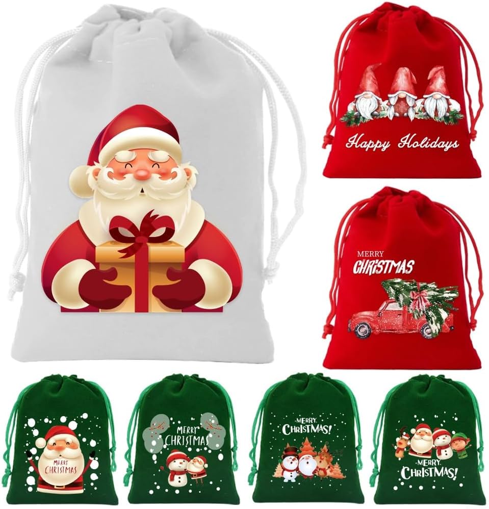 [Design natalizio] Presenta adorabili motivi natalizi e messaggi allegri che migliorano la festività di ogni occasione. [Chiusura con coulisse facile da usare] Progettato con un comodo cordoncino per un'apertura semplice e una chiusura affidabile, mantiene i tuoi oggetti al sicuro. [Set di sette sacchetti di diverse dimensioni] Include tre diverse dimensioni in sette sacchetti per soddisfare perfettamente tutte le tue esigenze di regalo. [Tessuto morbido e felpato] Realizzato con materiali delicati, comodi e ideali per l'uso durante le festività natalizie. [Multifunzionale per feste] per regali, decorazioni o dolci durante eventi festivi.