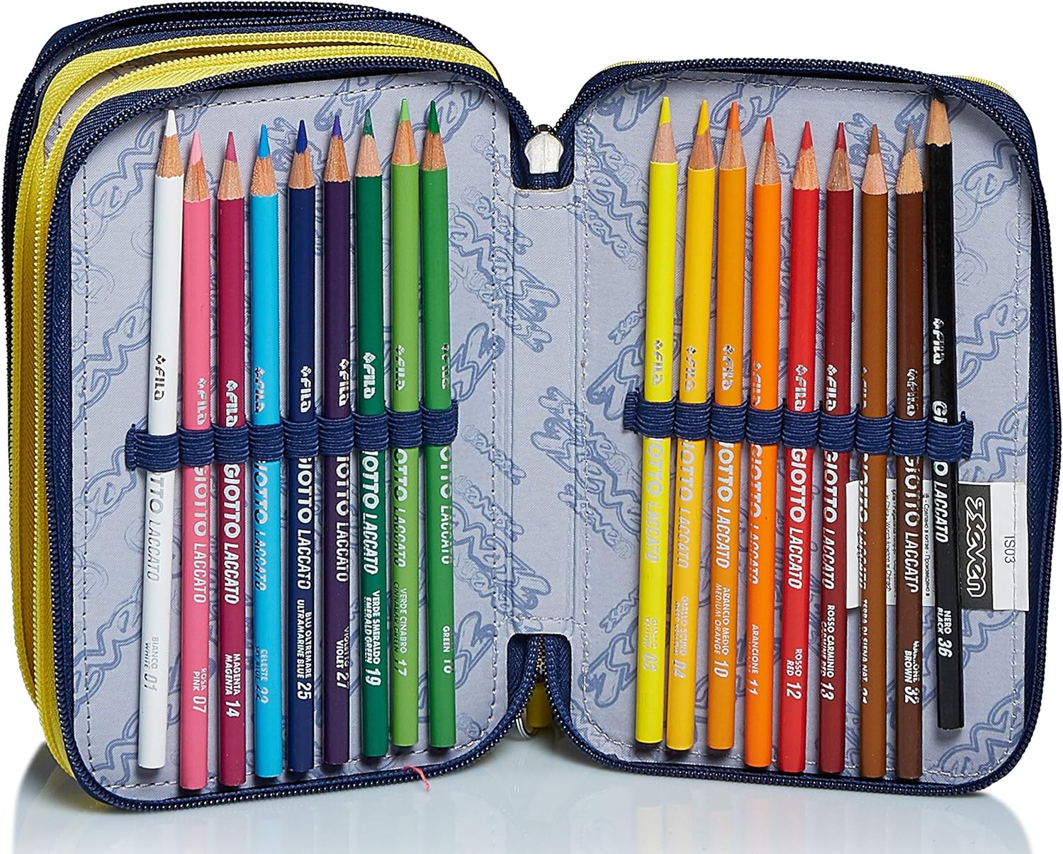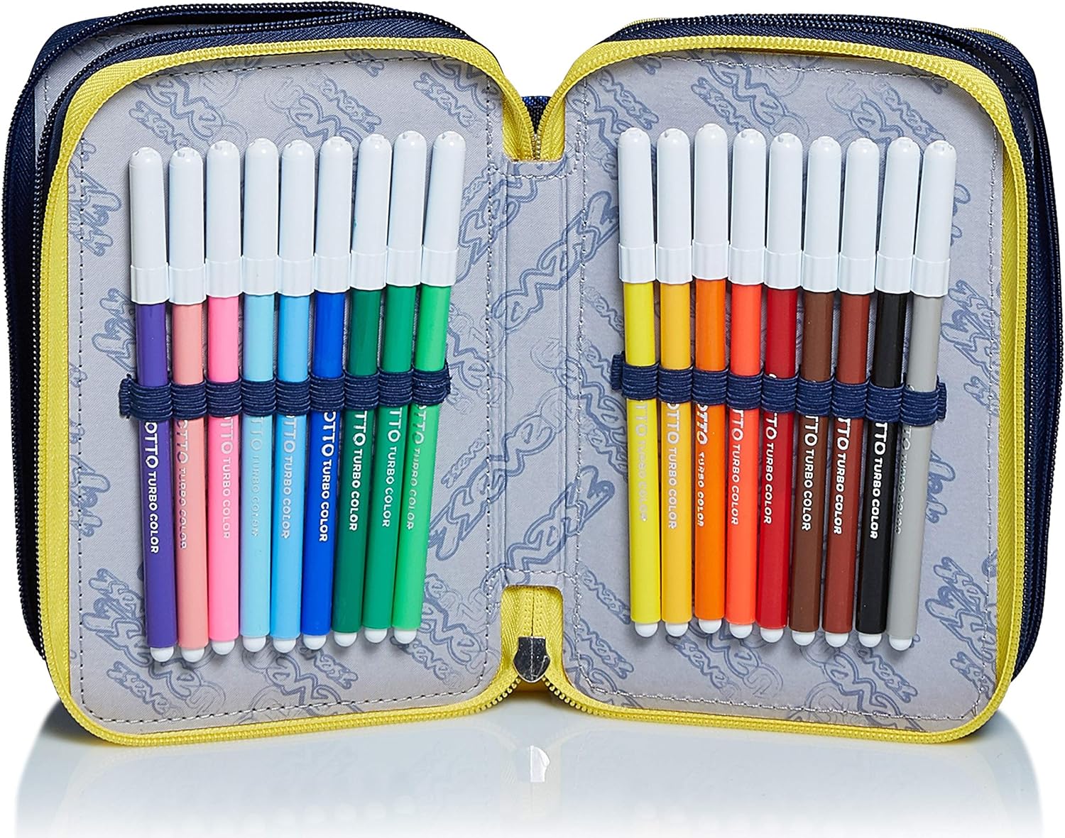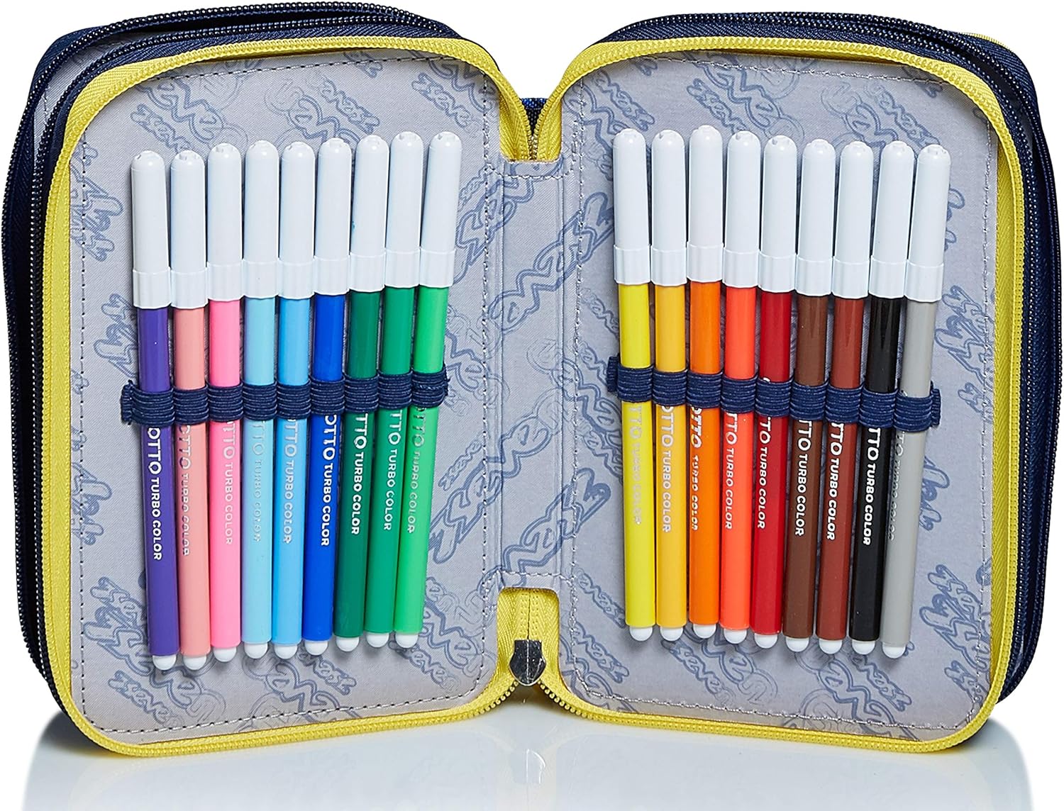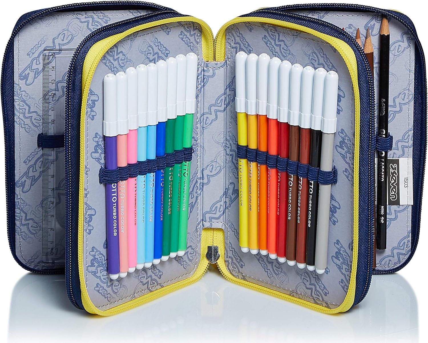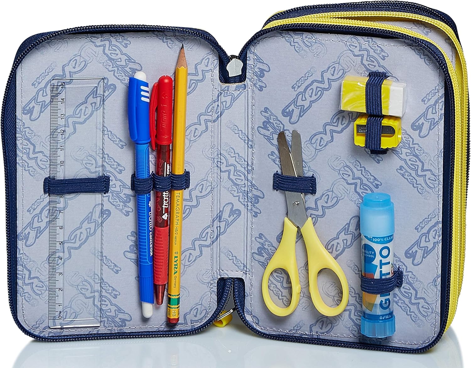Dimensioni: 20x12. 5x7 cm Contenuto: 1 penna cancellabile tratto cancellik. 1 penna rossa. 1 matita lyra temagraph. 1 gomma. 1 colla giotto stick. 1 temperino. 1 righello. 1 forbice. 18 pastelli. 18 pennarelli giotto turbo color Altre Caratteristiche: triplo scomparto; tirazip in silicone