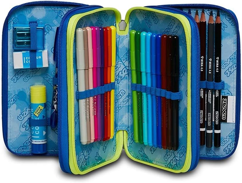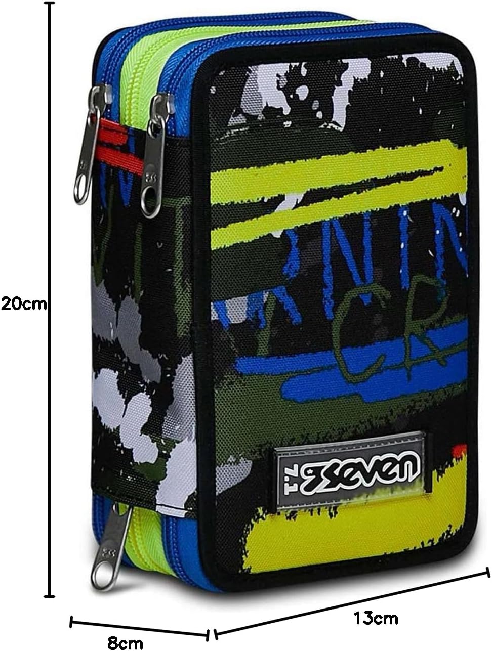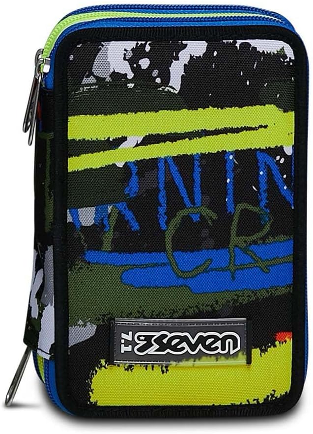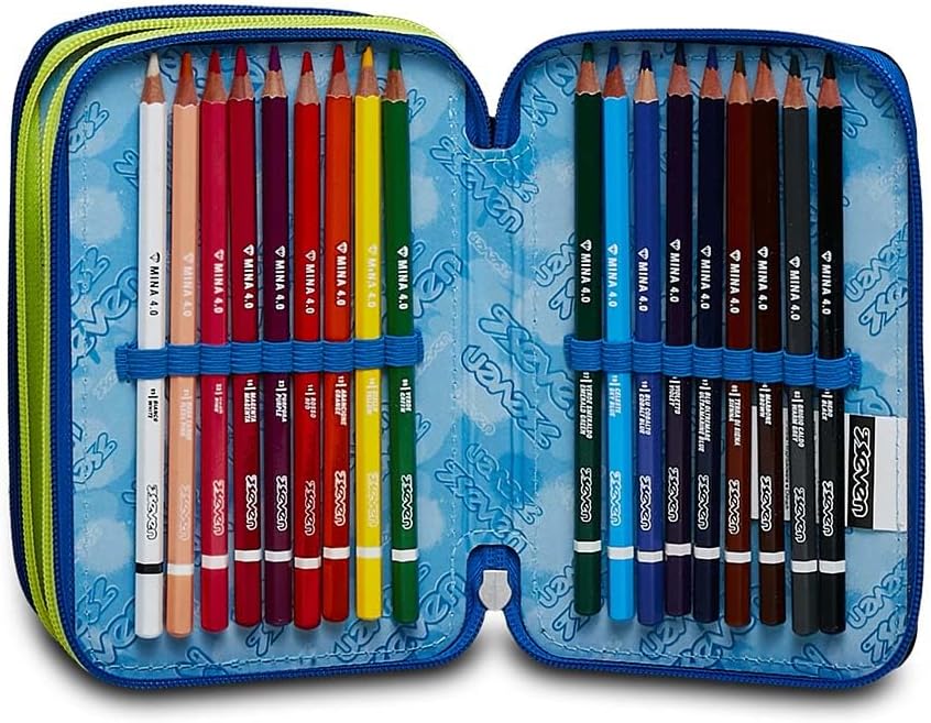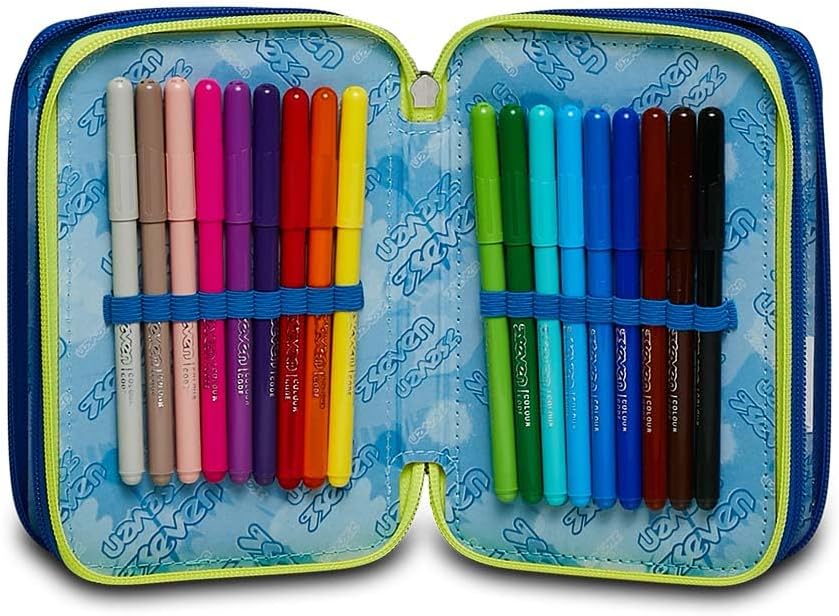DIMENSIONI: 12,5 x 20 x 7 cm ALTRE CARATTERISTICHE: CONTENUTO 46 PEZZI: 18 Pastelli a colori mina 4.0 Seven Colour Code, 18 Pennarelli lavabili Seven Colour Code, 1 Penna cancellabile blu, 1 Penna cancellabile rossa, 1 Matitone fluo bicolor giallo e arancio Colour Code, 1 Matita grafite Colour Code, 1 Gomma Colour Code, 1 Temperino barilotto a 2 fori, 1 Colla stick Colour Code, 1 Righello trasparente, 1 Goniometro trasparente, 1 Forbice in metallo con maniglia in plastica. TESSUTO: Poliestere TASCHE: Triplo scomparto