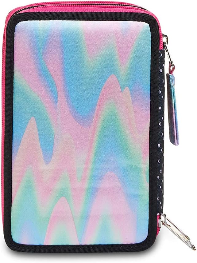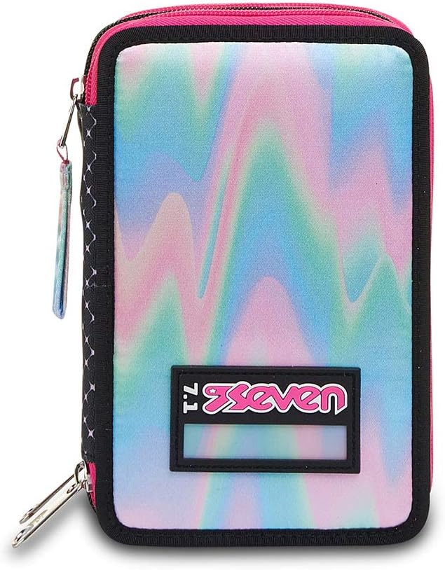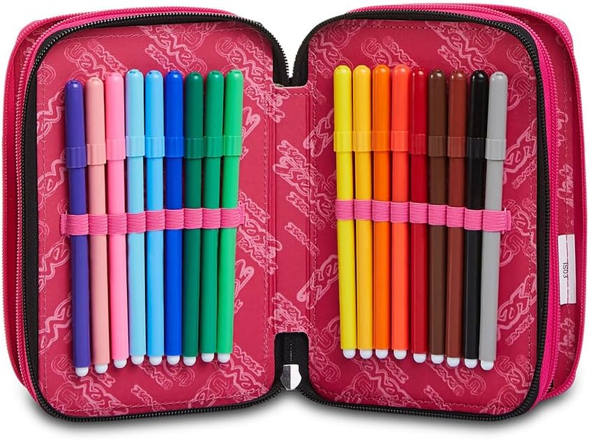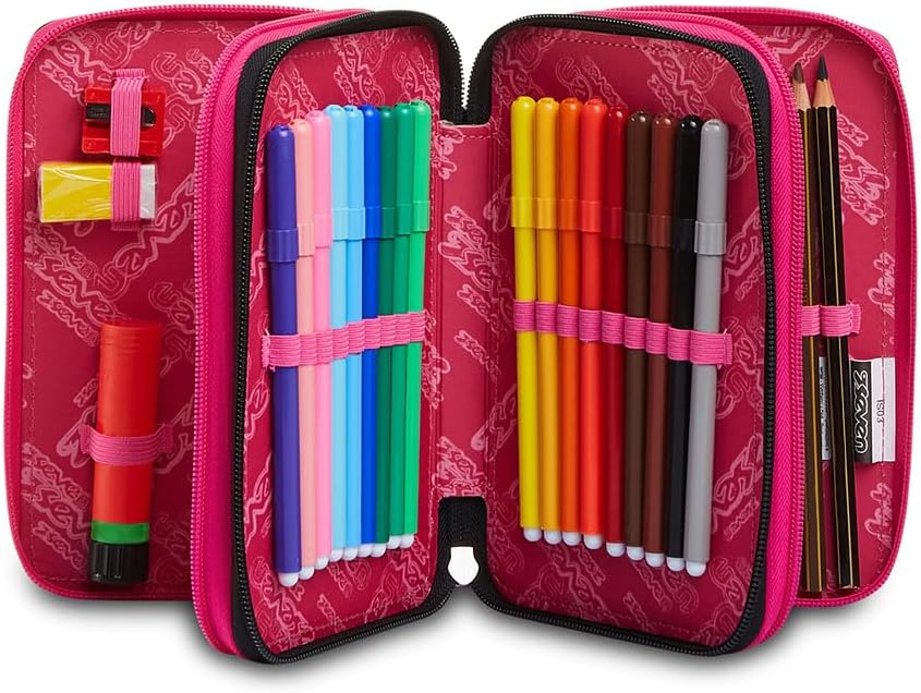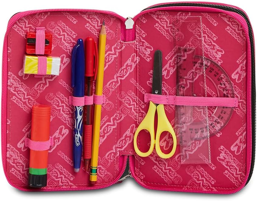 Dimensioni: 20 x 12.5 x 7 cm Altre caratteristiche: Contenuto di 45 pezzi: 1 penna cancellabile blu, 1 penna a sfera rossa, 18 pennarelli, 18 pastelli a colori, 1 matite grafite, 1 colla stick, 1 gomma, 1 temperino, 1 righello trasparente, 1 goniometro trasparente, 1 forbice in metallo con maniglia in plastica Tasche: Triplo scomparto Tessuto: Poliestere