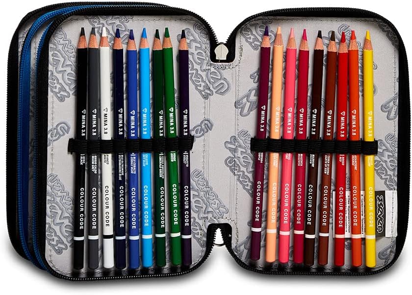 Dimensioni: 12,5x20x7 cm Tasche: 3 scomparti con chiusura zip Contenuto: 1 penna cancellabile TRATTO CANCELLIK - colore blu, 1 penna a sfera TRATTO 1UNO GREEN PLASTIC - colore rosso, 18 pennarelli GIOTTO TURBO COLOR, 18 pastelli a colori COULOR CODE, 1 matita grafite LYRA STUDIUM, 1 colla stick GIOTTO, 1 gomma, 1 temperino, 1 Righello trasparente, 1 forbice in metallo con maniglia in plastica. Tessuto Poliestere