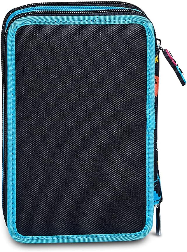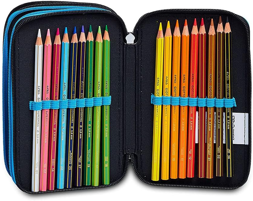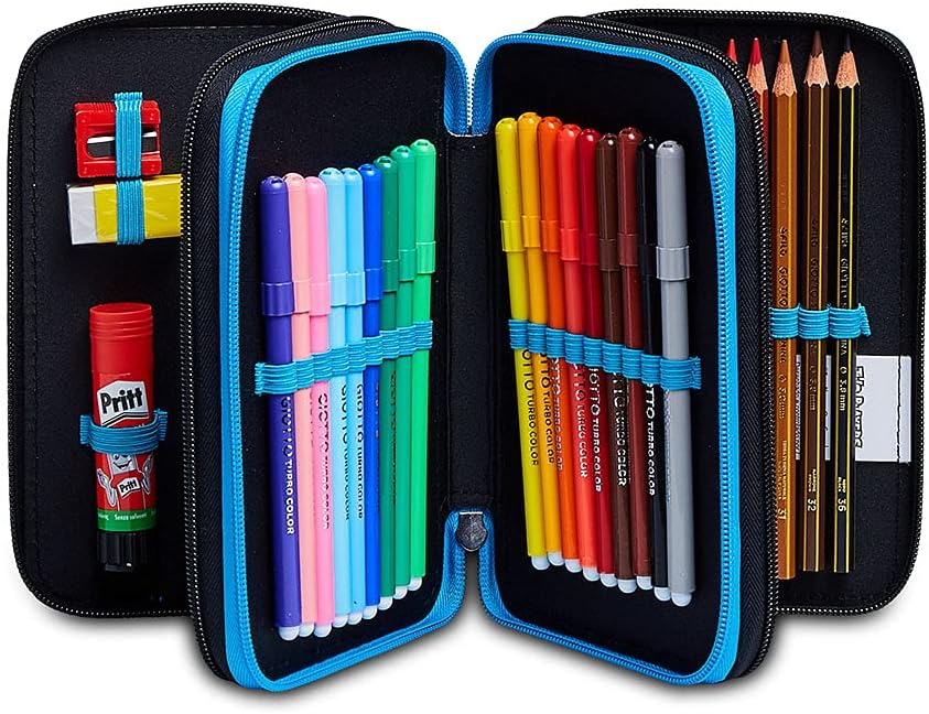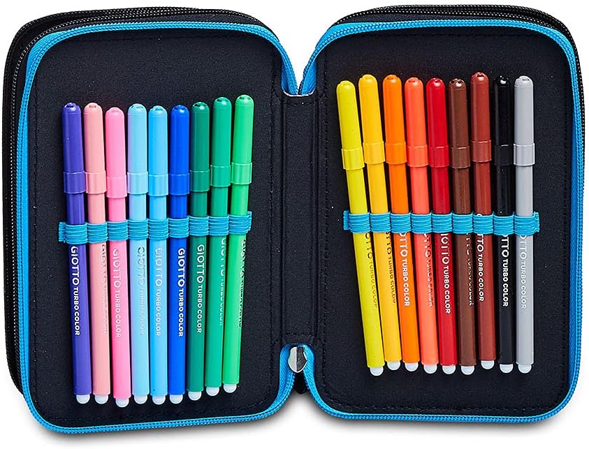 Dimensioni: 12. 5 x 19. 5 x 7 cm CONTENUTO: 1 penna cancellabile Tratto Cancellik - colore blu. 1 penna a sfera Tratto 1UNO - colore rosso. 18 pastelli Giotto Super mina. 18 pennarelli Giotto Turbo Color. 1 matita grafite Fila. 1 colla stick Pritt. 1 go mma. 1 temperino. 1 righello trasparente. 1 forbice in metallo con maniglia in plastica TASCHE: Triplo scomparto con zip ALTRE Caratteristiche: Apertura 3 scomparti con cer niera, tirazip go mmato personalizzato