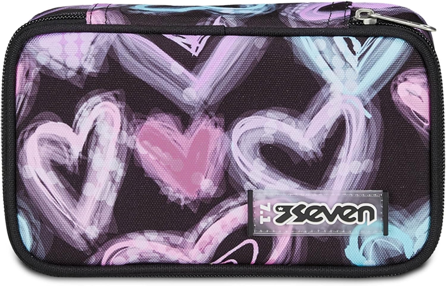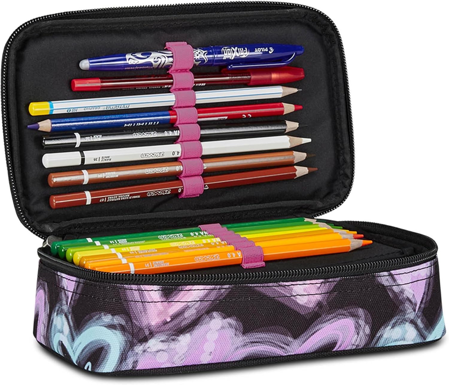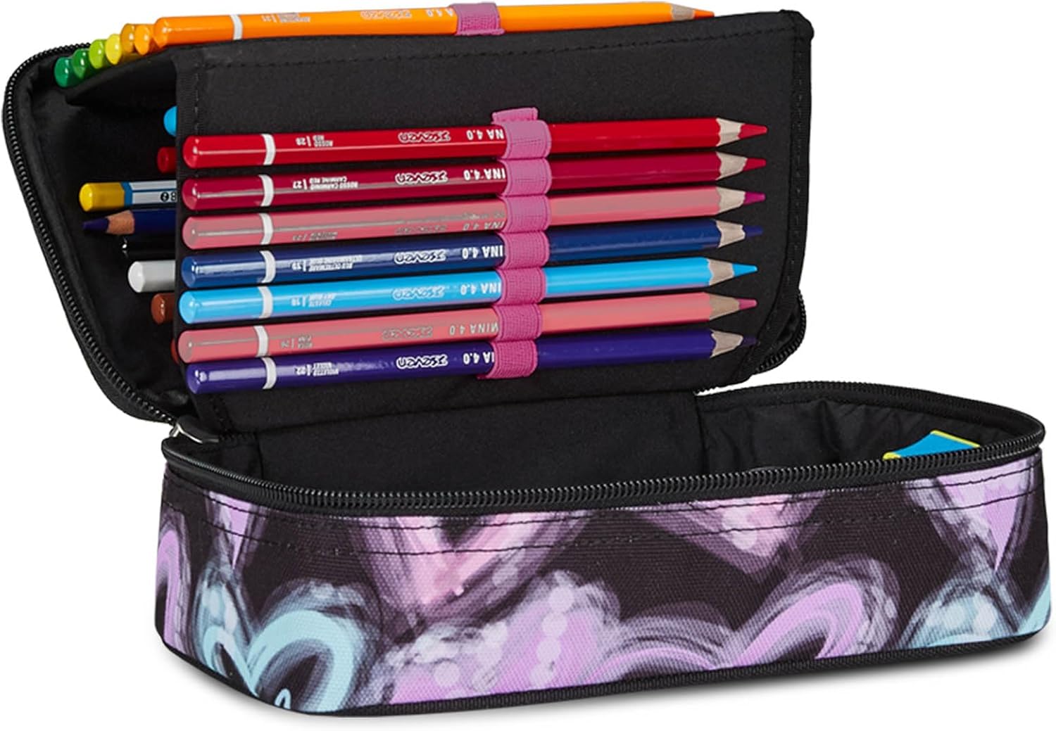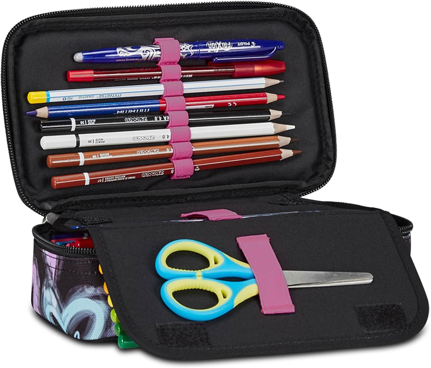 DIMENSIONI: 23,5 x 11 x 6 cm ALTRE CARATTERISTICHE: CONTENUTO 45 PEZZI: 1 Penna cancellabile blu, 1 Penna a sfera rossa, 18 Pastelli a colori, 18 Pennarelli, 1 Matita HB, 1 Colla stick, 1 Gomma, 1 Temperino barilotto due fori, 1 Righello, 1 Pastello tondo 4.0 bicolor, 1 Paio di Forbici in metallo TESSUTO: Poliestere