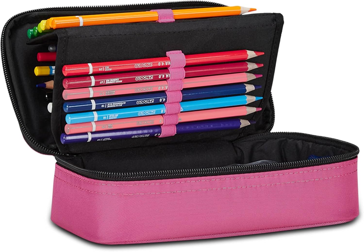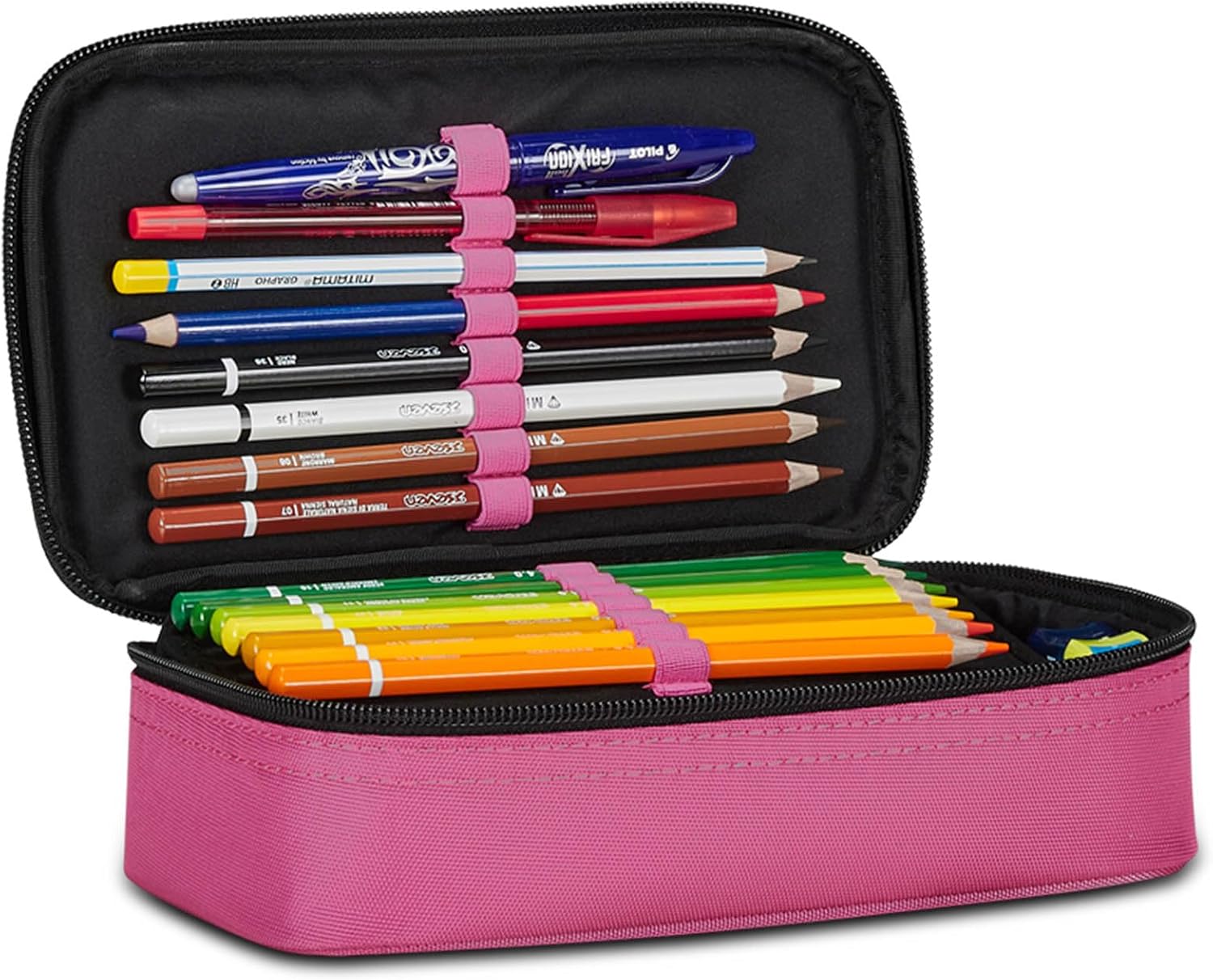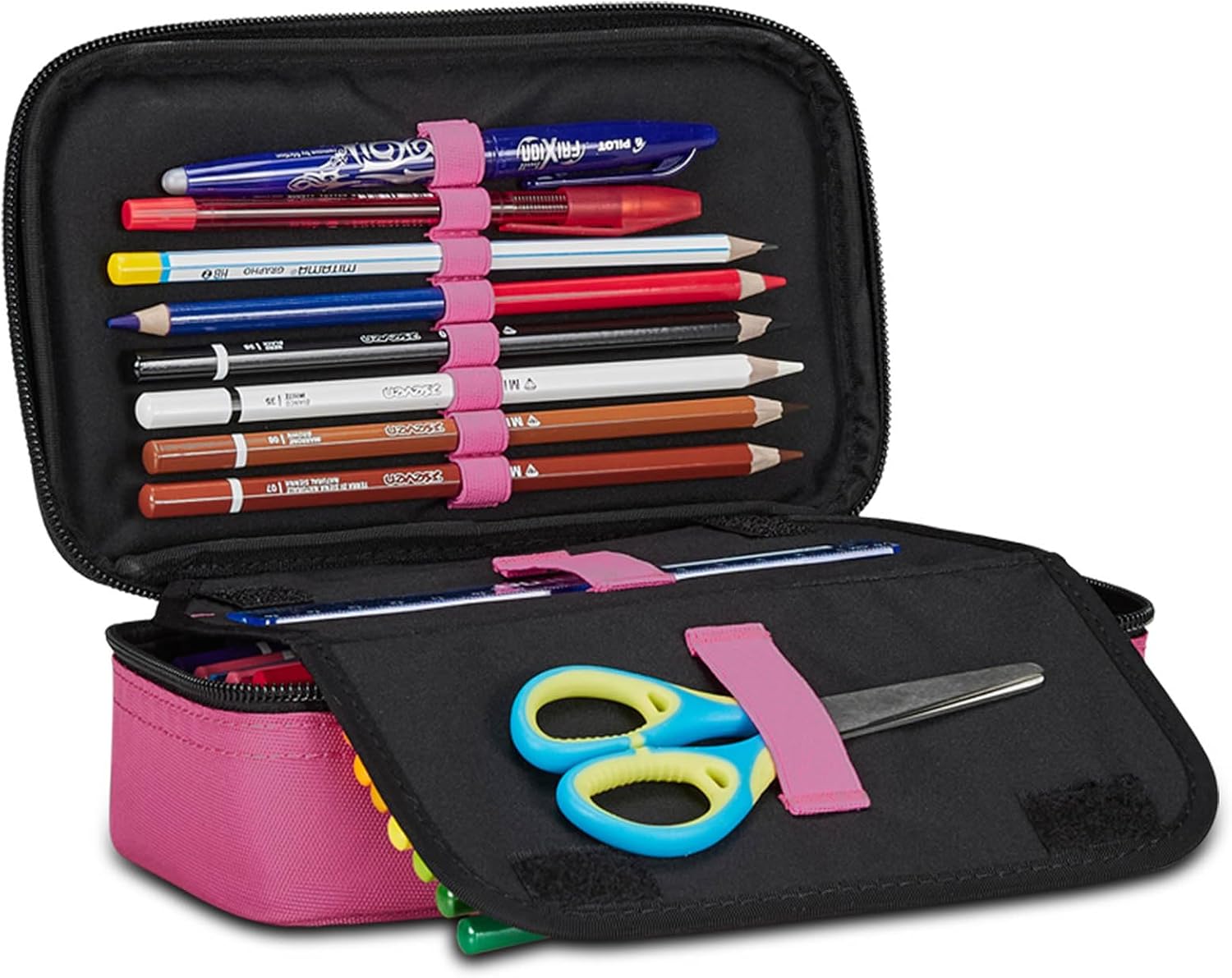 DIMENSIONI: 23,5 x 11 x 6 cm ALTRE CARATTERISTICHE: CONTENUTO 45 PEZZI: 1 Penna cancellabile blu, 1 Penna a sfera rossa, 18 Pastelli a colori, 18 Pennarelli, 1 Matita HB, 1 Colla stick, 1 Gomma, 1 Temperino barilotto due fori, 1 Righello, 1 Pastello tondo 4.0 bicolor, 1 Paio di Forbici in metallo TESSUTO: Poliestere