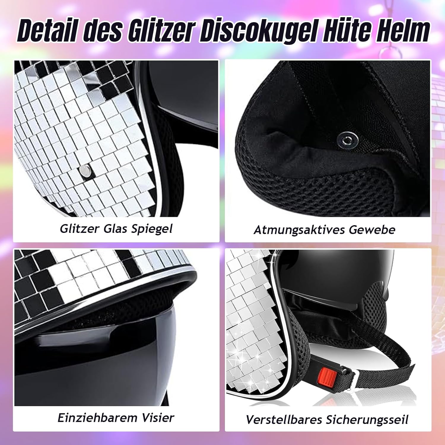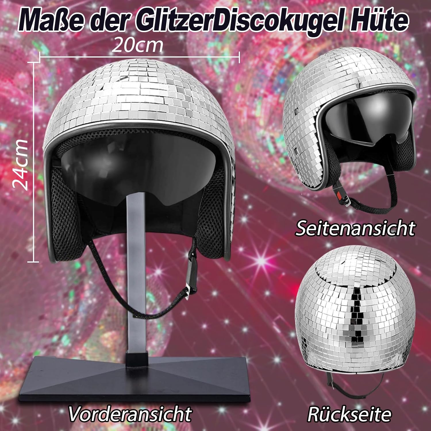 Materiale affidabile: poiché il casco da discoteca è realizzato in materiale ABS e vetro patch di alta qualità, è robusto e affidabile, leggero e durevole e può essere utilizzato a lungo Comodo da indossare: il cappello a sfera da discoteca in vetro con specchio glitterato non solo dispone di un parasole retrattile che protegge gli occhi dai dannosi raggi UV durante gli spostamenti, ma viene fornito anche con un sottogola sicuro e regolabile che il cappuccio si trova sulla testa così facilmente cade Design riflettente unico: con il design riflettente, il casco a sfera da discoteca con glitter argento può produrre tratti luminosi casuali in diverse condizioni di luce e angolazioni, rendendoti affascinante al sole. Distinguiti dalla folla Per molte occasioni: indossare un cappello da discoteca retrò anni '80, per feste di carnevale, palcoscenico e matrimonio. Il cappello contribuisce a illuminare l'atmosfera riflettendo la luce e creando una lucentezza incantevole. E il cappello d'argento si adatta ai tuoi vestiti, rendendoti più moderno e alla moda Atmosfera illuminante: il casco retrò da discoteca decora la lucentezza delle piastrelle di vetro, illumina l'atmosfera donando alla festa un riflesso della luce e creando così un'atmosfera allegra ed energica