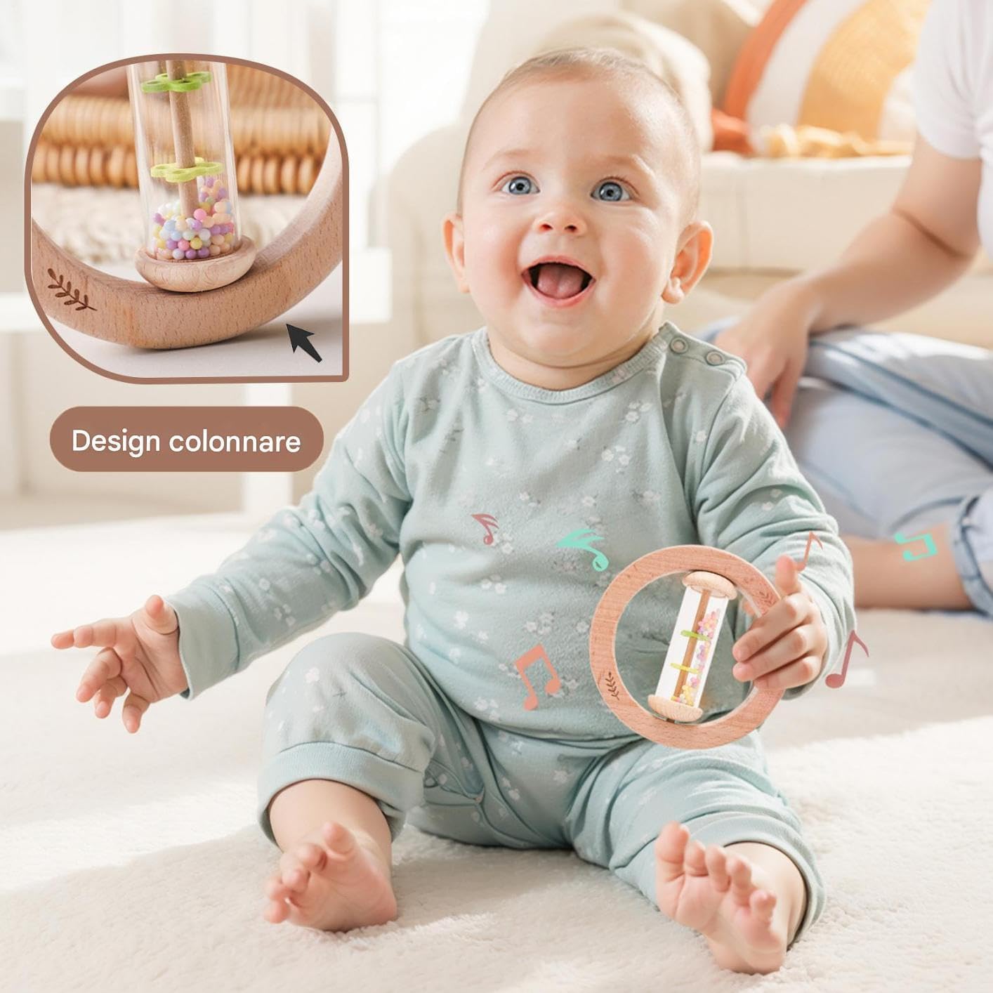 Design funzionale: Coinvolge attivamente i sensi del bambino attraverso combinazioni cromatiche stimolanti e suoni ritmici, rafforzando lo sviluppo delle capacità uditive, tattili e di presa durante le attività di gioco Divertimento Assicurato:Il sonaglio emette un piacevole fruscio allo scuotimento grazie a particelle acustiche integrate che riproducono suoni naturali, stimolando la curiosità e arricchendo l'esperienza sensoriale durante il gioco. Lunga Durata::Grazie alla costruzione in materiale antiscivolo resistente, il sonaglio mantiene integrità nel senza deformazioni, accompagnando il bambino in più fasi di sviluppo con sicurezza costante. 3. Design Sicuro: Angoli arrotondati e curvatura studiata prevengono urti e scivolamenti, offrendo una presa confortevole che risponde alle preferenze di presa dei bimbi durante il gioco. Sviluppo Cognitivo: Stimola lo sviluppo uditivo e affina la coordinazione occhio-mano con un design sonoro e facile da afferrare, potenziando le abilità cognitive precoci tramite applicazioni versatili