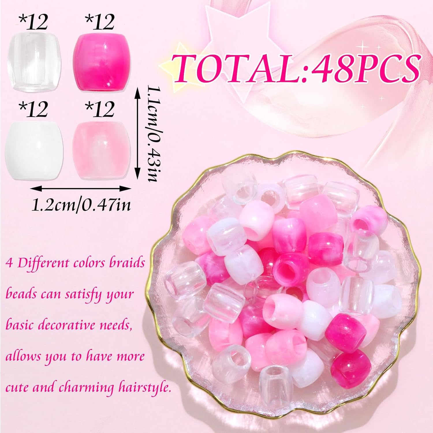 【Set di valori】 Una confezione contiene 48 perline intrecciate in quattro colori diversi. La superficie liscia e lucida rende queste perle perfette per la decorazione dei capelli. Una quantità sufficiente può soddisfare le diverse esigenze decorative.,Materiale: le nostre perle Loc sono realizzate in resistente plastica acrilica, che conferisce al nostro prodotto una superficie liscia e lucida, robustezza ed elevata durata. Possono essere utilizzati a lungo.,Facile da usare: queste graziose perle di dreadlock sono adatte per acconciature di bambini e ragazze. Hanno un grande foro perforato, puoi facilmente inserire i tuoi capelli intrecciati. Puoi anche combinare queste perle con i tuoi ciondoli e perline preferiti nel tuo design di gioielli per capelli fai-da-te, creando un punto culminante visivo nel tuo design e rendendo i tuoi gioielli più attraenti. 【Ampio utilizzo】 Queste perline intrecciate possono essere utilizzate in varie occasioni, come feste, vita quotidiana, scuola, vacanze, compleanni, servizi fotografici, ecc. Si abbinano ai tuoi diversi abiti e mettono in risalto il tuo aspetto. 【Ottimo regalo】 Le perle dreadlock sono un regalo speciale per mostrare il tuo amore e la tua cura. Questi accessori per capelli Loc ti rendono più eccezionale tra la folla e ti offrono un'esperienza diversa. Pertanto sono perfetti come regalo per le tue amiche e compagne di classe