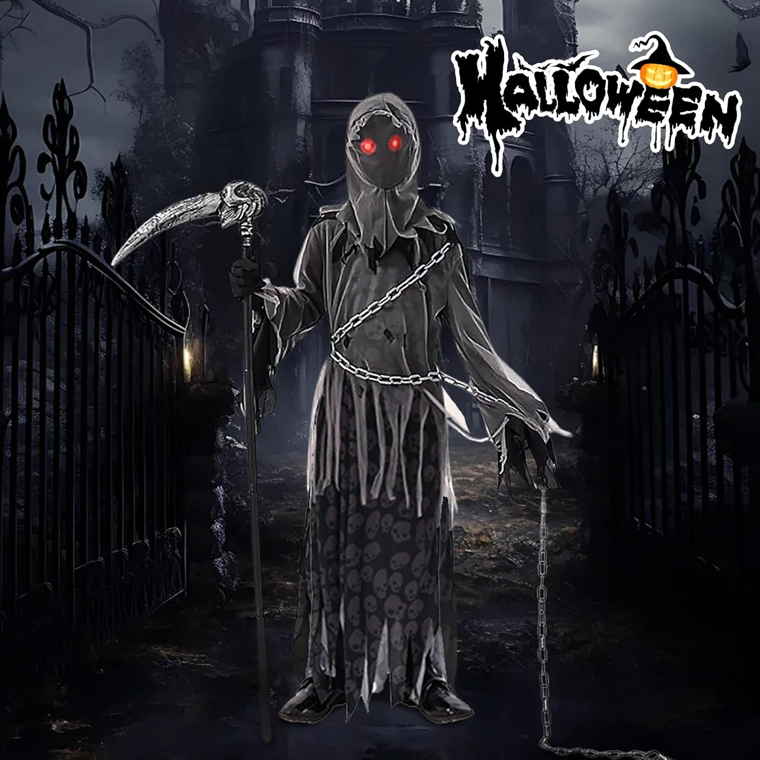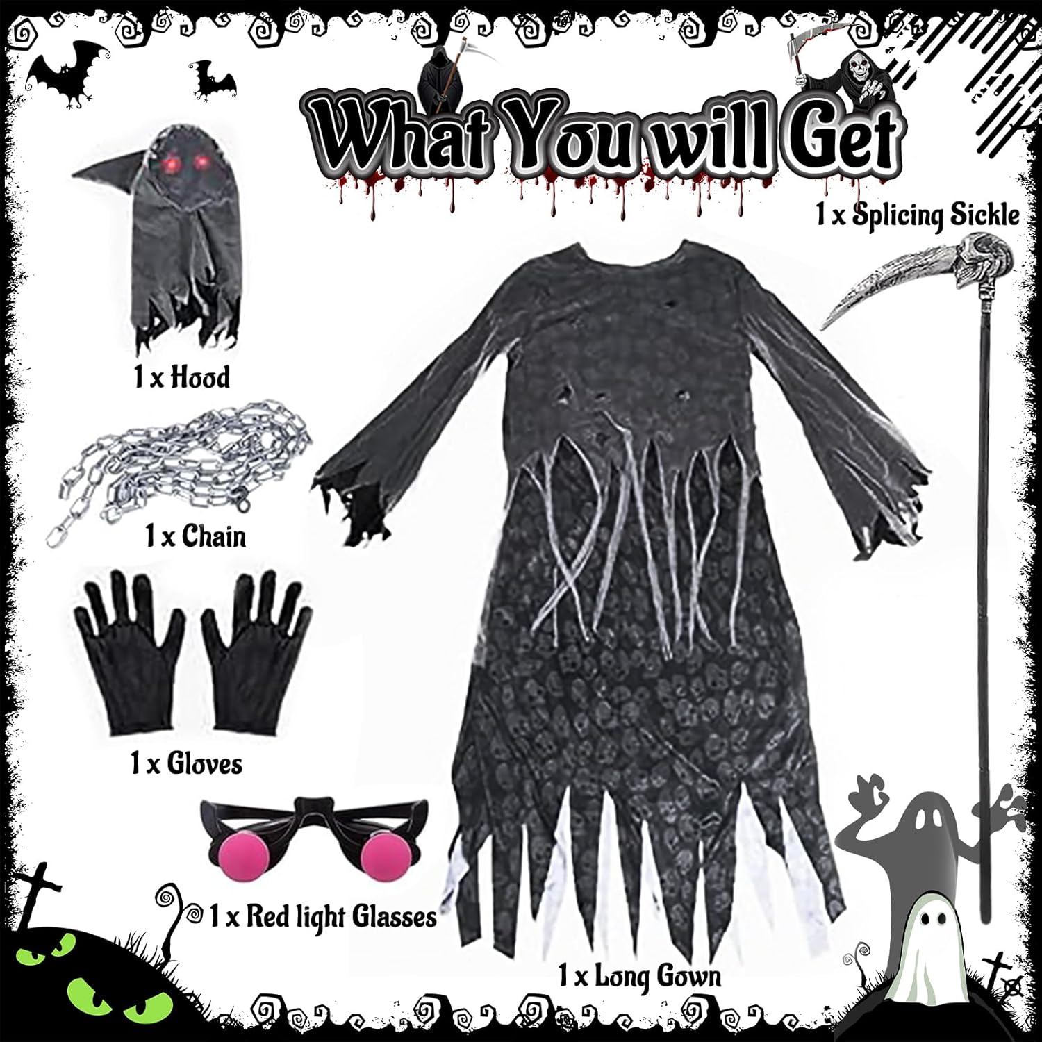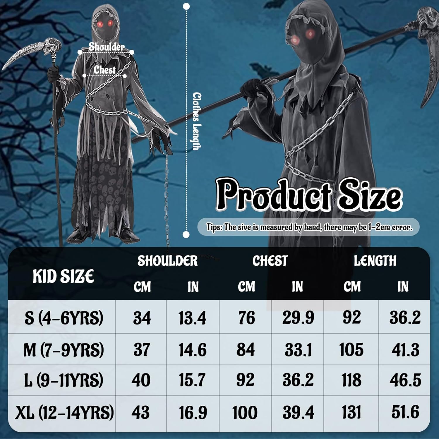 Confezione del prodotto: 1 x abito da Grim Reaper 1 x cappuccio senza volto 1 paio di guanti da Grim Reaper 1 x catena da Grim Reaper 1 x occhiali rosso vivo 1 x ascia da Grim Reaper Nota: 1. La falce nel costume da Grim Reaper per bambini è solo un accessorio decorativo. Si prega di non utilizzare la falce per attaccare altre persone. 2. A causa delle esigenze di trasporto, è normale che gli indumenti presentino delle pieghe. Appenderli o stirarli richiederà solo pochi giorni per appianare le pieghe. 3. Gli occhiali luminosi devono essere indossati all'interno del copricapo. (Indossare prima gli occhiali, poi il copricapo) 4. Le taglie degli indumenti sono misurate manualmente e possono essere soggette a determinati errori. 5. A causa dell'illuminazione e della visualizzazione, il colore del prodotto reale può differire leggermente dall'immagine.
