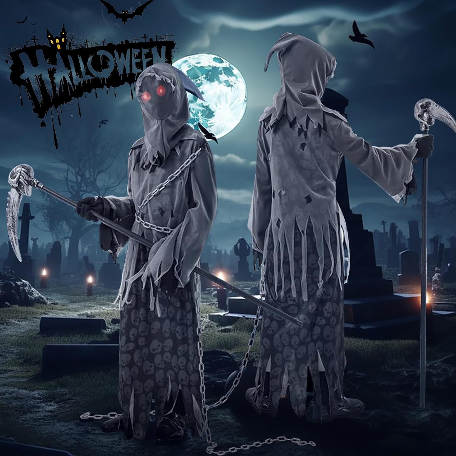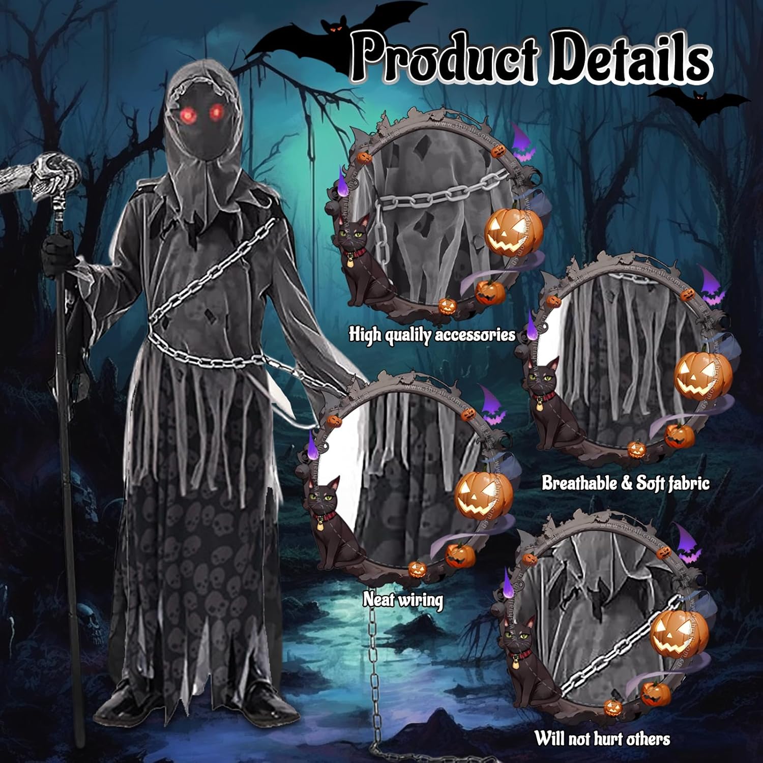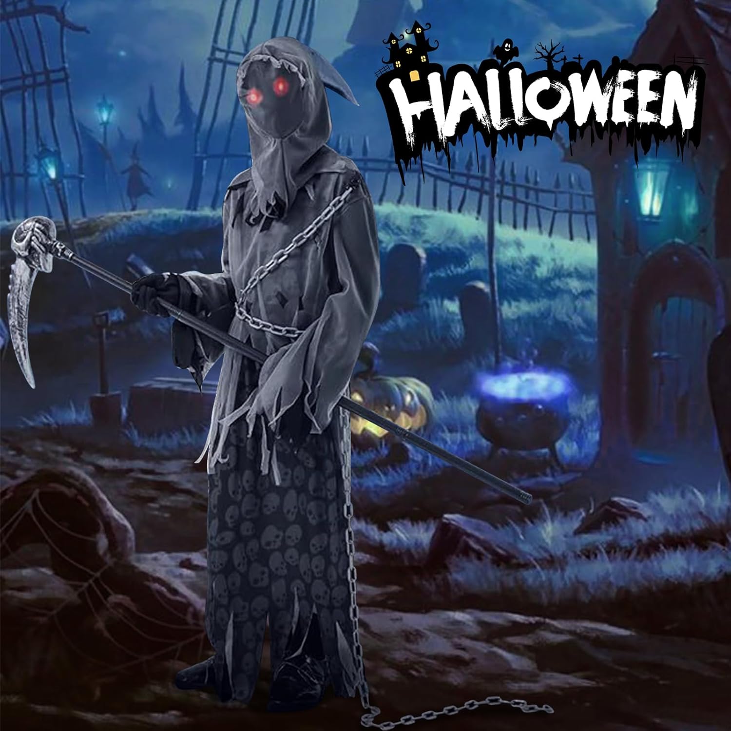 Confezione del prodotto: 1 x abito da Grim Reaper 1 x cappuccio senza volto 1 paio di guanti da Grim Reaper 1 x catena da Grim Reaper 1 x occhiali rosso vivo 1 x ascia da Grim Reaper Nota: 1. La falce nel costume da Grim Reaper per bambini è solo un accessorio decorativo. Si prega di non utilizzare la falce per attaccare altre persone. 2. A causa delle esigenze di trasporto, è normale che gli indumenti presentino delle pieghe. Appenderli o stirarli richiederà solo pochi giorni per appianare le pieghe. 3. Gli occhiali luminosi devono essere indossati all'interno del copricapo. (Indossare prima gli occhiali, poi il copricapo) 4. Le taglie degli indumenti sono misurate manualmente e possono essere soggette a determinati errori. 5. A causa dell'illuminazione e della visualizzazione, il colore del prodotto reale può differire leggermente dall'immagine.