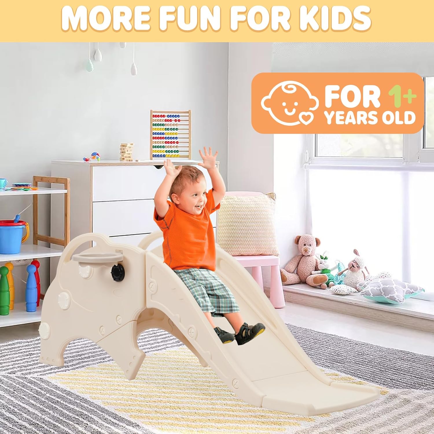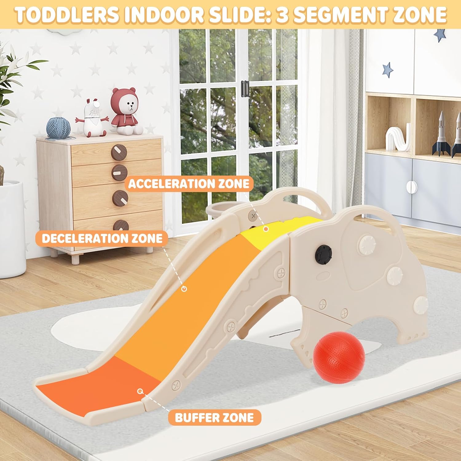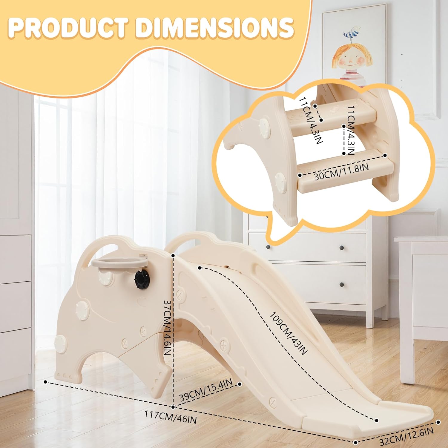 3 in 1 scivolo per bambini: combina uno scivolo, una scala, un cestino da pallacanestro e un design di elefante giocoso per innescare un gioco fantasioso, perfetto per giardini, asili per bambini o divertimenti all'interno. Materiali sicuri: lo scivolo per bambini piccoli è realizzato in materiale PE ecologico e non contiene sostanze nocive per garantire la sicurezza dei vostri bambini. Ogni singola parte di montaggio è completa, liscia e non ha bordi taglienti che non feriscano la pelle sensibile del bambino o graffiano il tessuto dei vestiti. Dimensione scientifica: La scivola offre una generosa area da gioco di 32 cm. La distanza di 11 cm tra ogni pedale antiscivolo, supporta l'arrampicata sicura del tuo bambino. Promuovere l'attività fisica: questo scivolo per bambini è un eccellente giocattolo che favorisce la corsa, l'arrampicata e il lancio. Migliora l'equilibrio e la coordinazione muscolare. I bambini che giocano regolarmente con lo scivolo diventano più agili, più attivi e hanno più piacere nelle attività sportive. Prodotto perfetto per i bambini: Vivente Elephant Design attira l'attenzione dei bambini e li fa più piacere. Questo scivolo indipendente multifunzionale offre più che semplicemente scivolare: favorisce l'arrampicata, il gioco e gli esercizi e contribuisce allo sviluppo fisico generale e alla motoria del bambino.