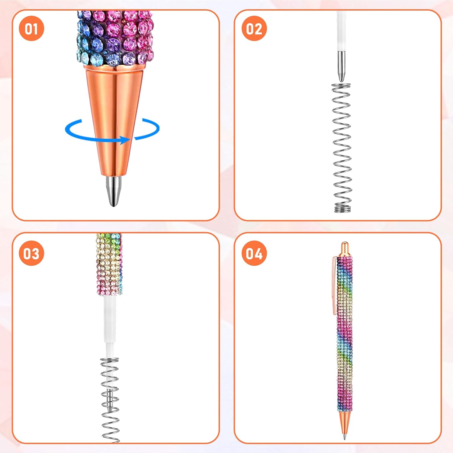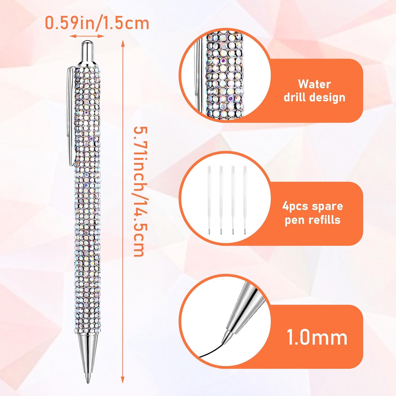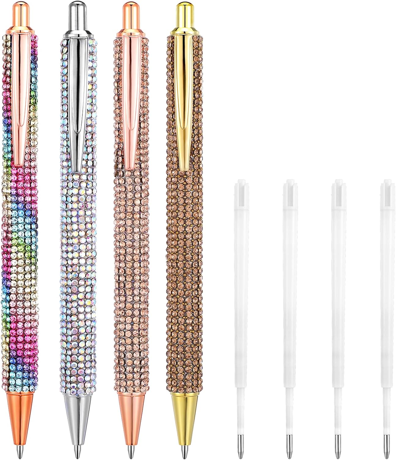 Design a penna con strass: questo set di penne brillanti presenta un corpo tempestato di strass che cattura la luce magnificamente, rendendolo un accessorio elegante per ogni occasione. Gli strass forniscono anche una presa antiscivolo, garantendo una scrittura comoda e stabile Durevole e affidabile: le penne con connettore sono realizzate in metallo di qualità, queste penne sono costruite per durare nel tempo. La struttura robusta garantisce uno strumento di scrittura di lunga durata in grado di resistere all'uso quotidiano. Gli strass sono fissati saldamente, aggiungendo bellezza e durata alla penna Dimensioni e ricariche perfette: penna fantasia misura circa 5,71 × 0,59 × 1,2 cm / 14,5 × 1,5 × 1,2 cm, queste penne sono della dimensione ideale per una scrittura confortevole. Il set include 4 penne e ricariche di inchiostro nero, assicurando di avere un sacco di inchiostro per continuare a scrivere senza interruzioni Penne a sfera scintillanti: le penne glitterate in cristallo presentano un comodo meccanismo a scatto per un facile utilizzo. L'inchiostro nero scorre in modo fluido e uniforme, fornendo una piacevole esperienza di scrittura senza sbavature o saltare. La comoda impugnatura e le linee chiare rendono la scrittura a mano una gioia Regalo ideale per ogni occasione: le eleganti penne a sfera sono un regalo perfetto per donne, amici, colleghi e familiari. Che si tratti di Natale, compleanni, matrimoni, vacanze, lauree o eventi aziendali, queste penne stupiranno e delizieranno sicuramente