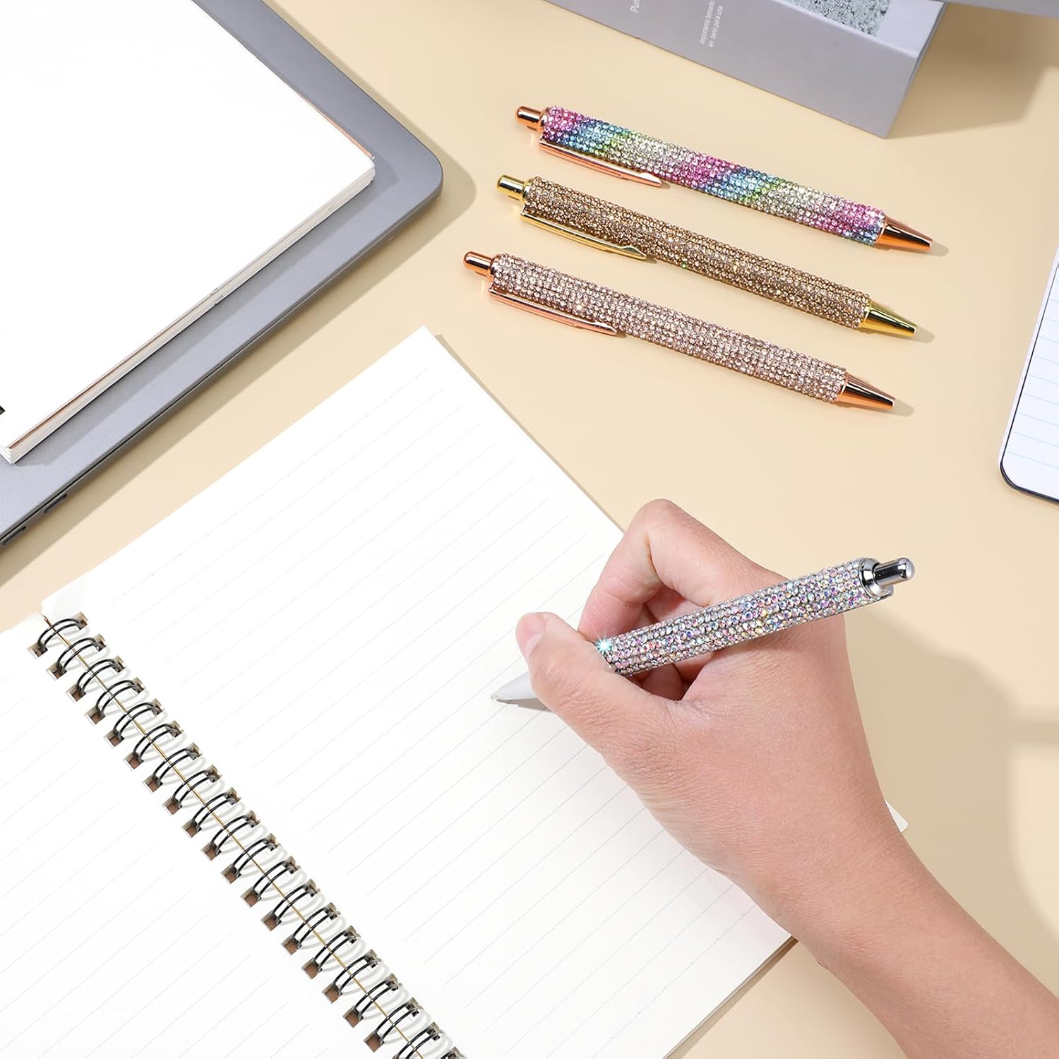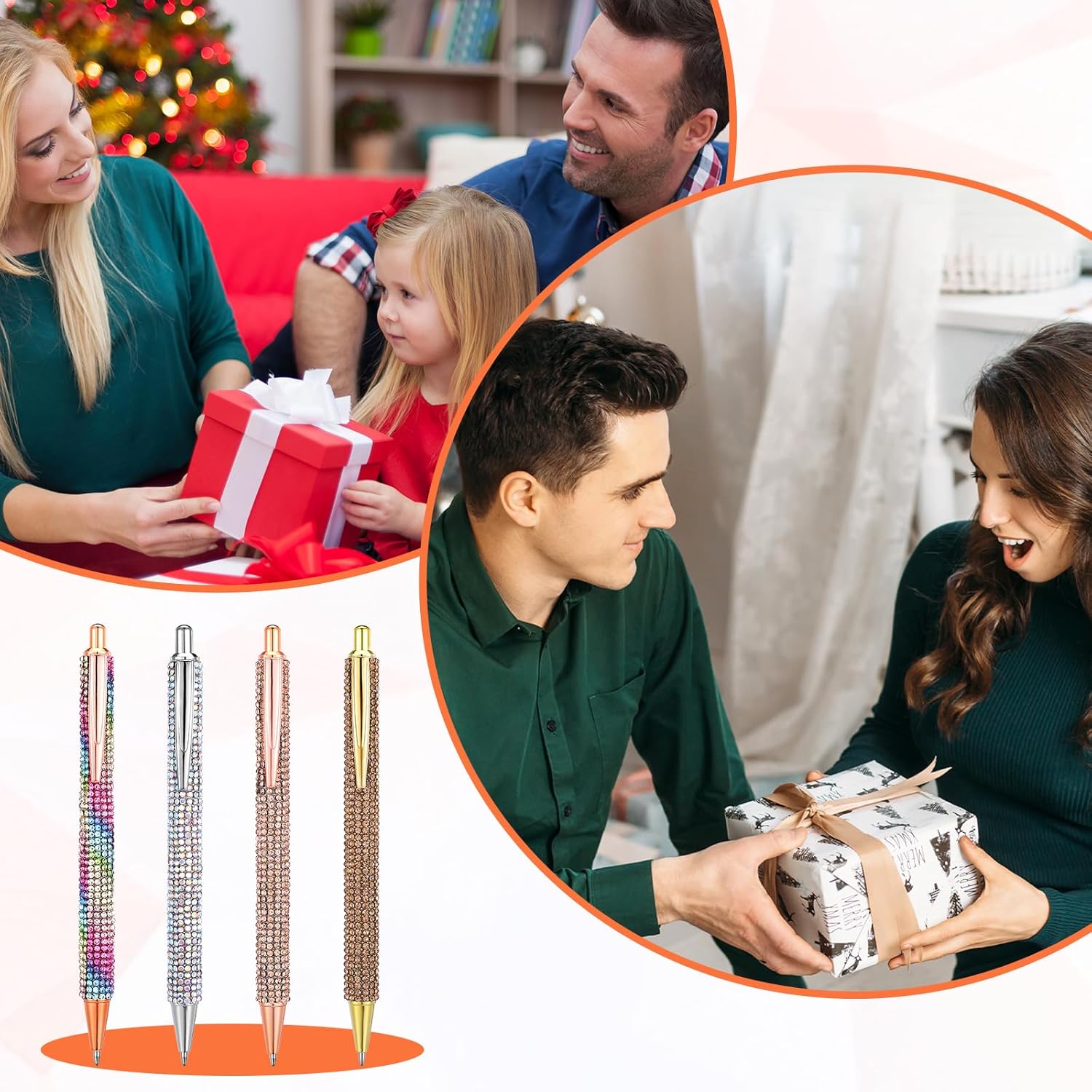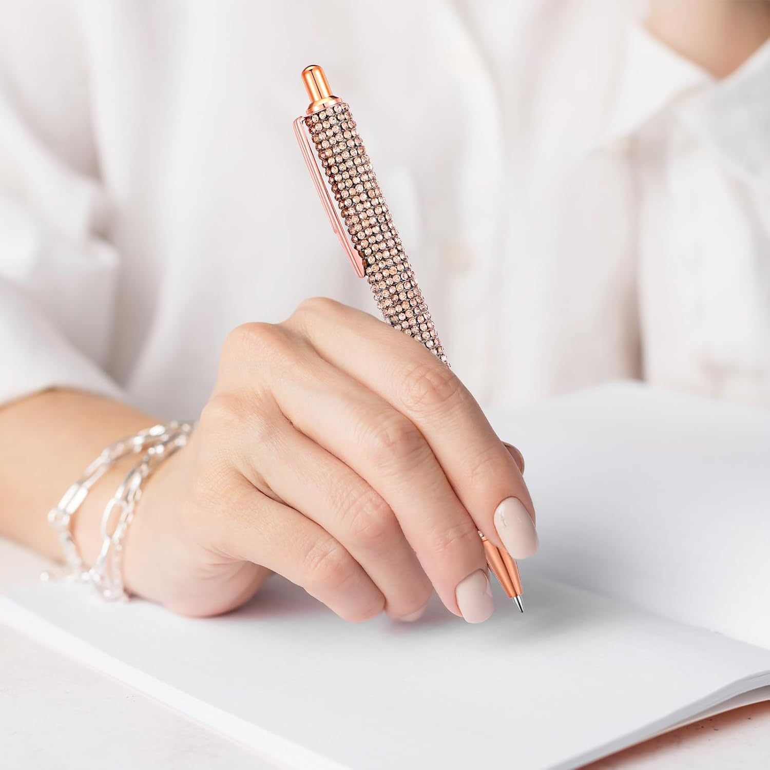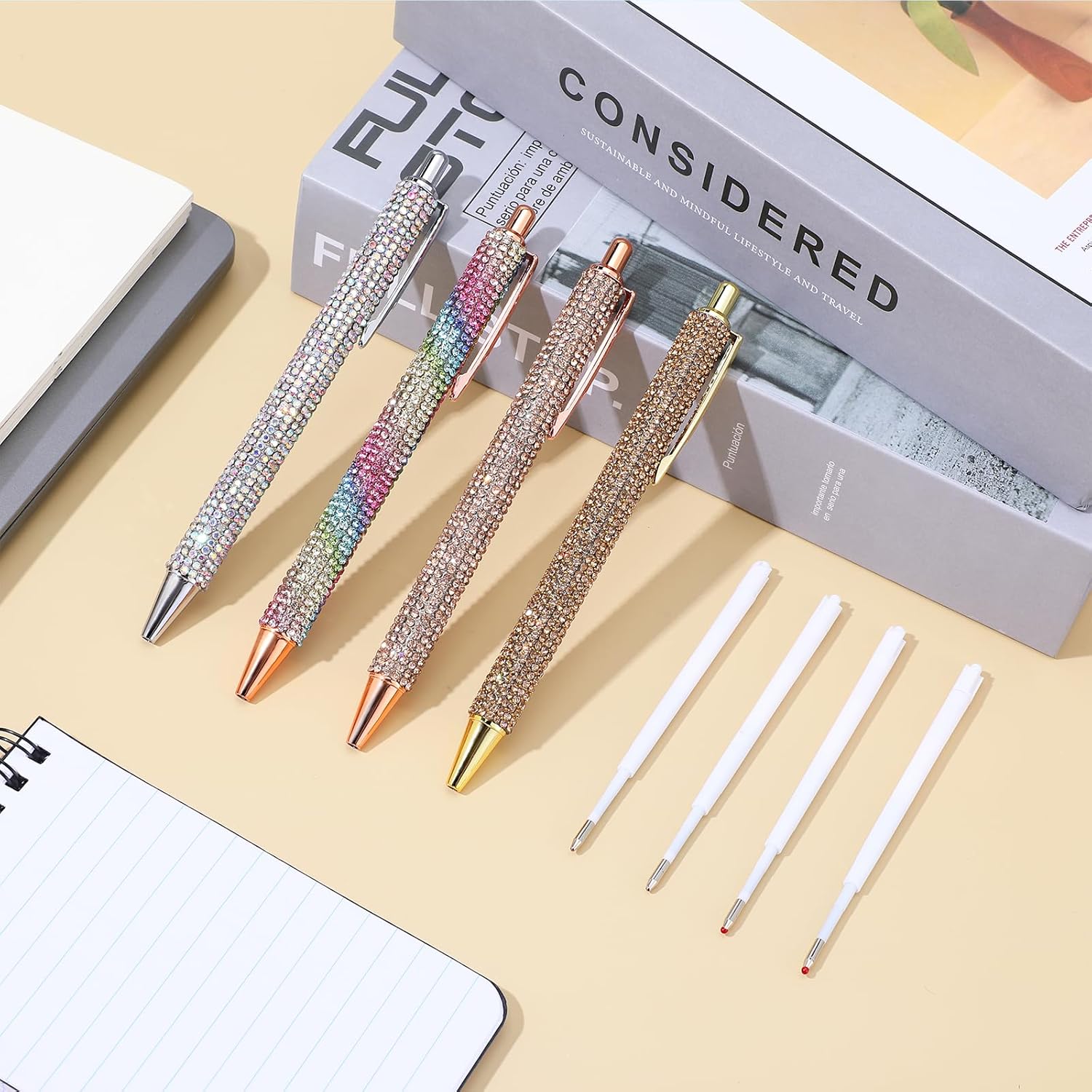 Design a penna con strass: questo set di penne brillanti presenta un corpo tempestato di strass che cattura la luce magnificamente, rendendolo un accessorio elegante per ogni occasione. Gli strass forniscono anche una presa antiscivolo, garantendo una scrittura comoda e stabile Durevole e affidabile: le penne con connettore sono realizzate in metallo di qualità, queste penne sono costruite per durare nel tempo. La struttura robusta garantisce uno strumento di scrittura di lunga durata in grado di resistere all'uso quotidiano. Gli strass sono fissati saldamente, aggiungendo bellezza e durata alla penna Dimensioni e ricariche perfette: penna fantasia misura circa 5,71 × 0,59 × 1,2 cm / 14,5 × 1,5 × 1,2 cm, queste penne sono della dimensione ideale per una scrittura confortevole. Il set include 4 penne e ricariche di inchiostro nero, assicurando di avere un sacco di inchiostro per continuare a scrivere senza interruzioni Penne a sfera scintillanti: le penne glitterate in cristallo presentano un comodo meccanismo a scatto per un facile utilizzo. L'inchiostro nero scorre in modo fluido e uniforme, fornendo una piacevole esperienza di scrittura senza sbavature o saltare. La comoda impugnatura e le linee chiare rendono la scrittura a mano una gioia Regalo ideale per ogni occasione: le eleganti penne a sfera sono un regalo perfetto per donne, amici, colleghi e familiari. Che si tratti di Natale, compleanni, matrimoni, vacanze, lauree o eventi aziendali, queste penne stupiranno e delizieranno sicuramente