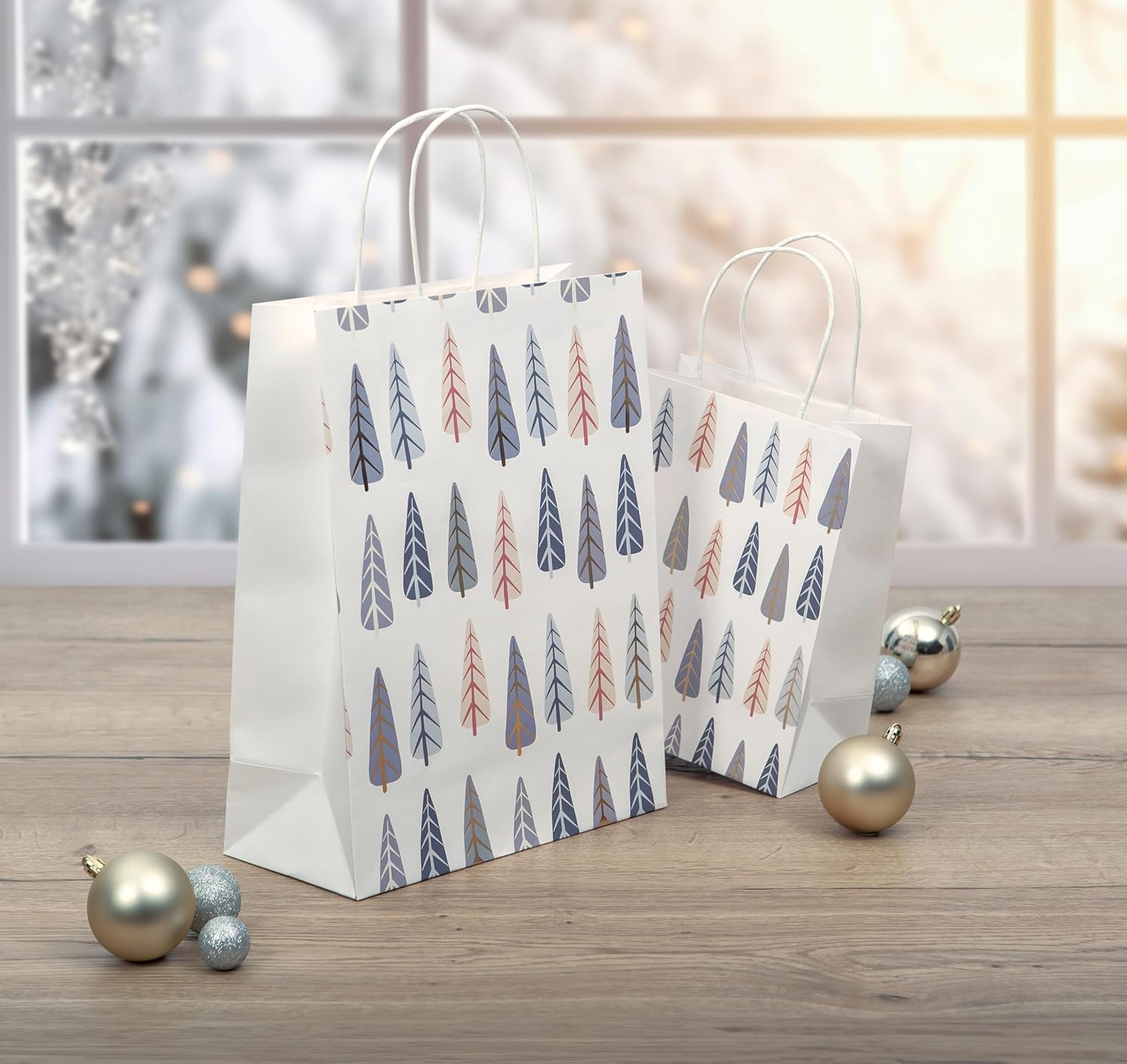 Con i pregiati sacchetti natalizi SIGEL dal design natalizio moderno ed elegante i regali di Natale vengono confezionati in modo rapido e decorativo. Sacchetti regalo medi "Pini" in carta opaca con pellicola lucida nel formato 18 x 23 x 10 cm in bianco/blu/oro, ottimi effetti grazie al motivo in pellicola in rilievo per un aspetto di classe. Borsa regalo con cordoncini di carta colorati abbinati, inserto base in cartone per una maggiore stabilità. Sostenibile: carta certificata FSC ecologica proveniente da fonti responsabili. Fornitura: 5 pezzi