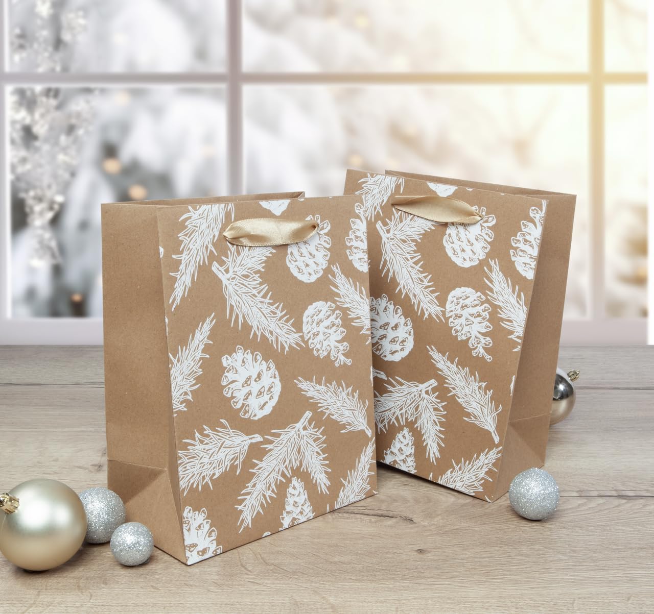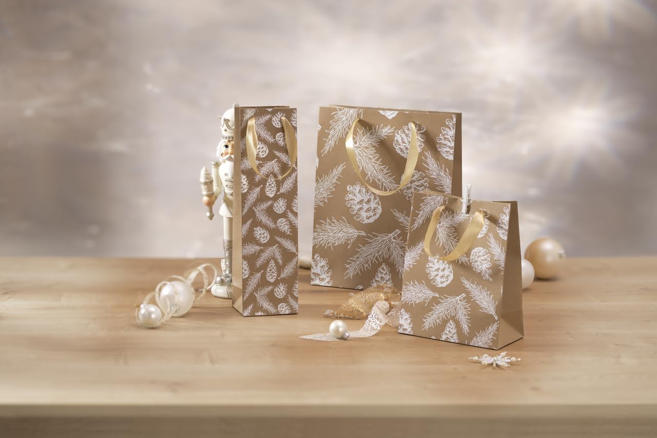 Con i pregiati sacchetti natalizi SIGEL dal design natalizio moderno ed elegante è possibile confezionare i regali di Natale in modo rapido e decorativo. Sacchetto regalo piccolo "Pigne e rami di pino" in carta opaca con stampa a vernice UV nel formato 18 x 23 x 10 cm in marrone/bianco Sacchetto regalo con manici in nastro di seta in tinta, inserto sul fondo in cartone per una maggiore stabilità Stampato su carta kraft marrone per un aspetto naturale Sostenibile: carta ecologica certificata FSC proveniente da fonti responsabili, contenuto della confezione: 5 pezzi