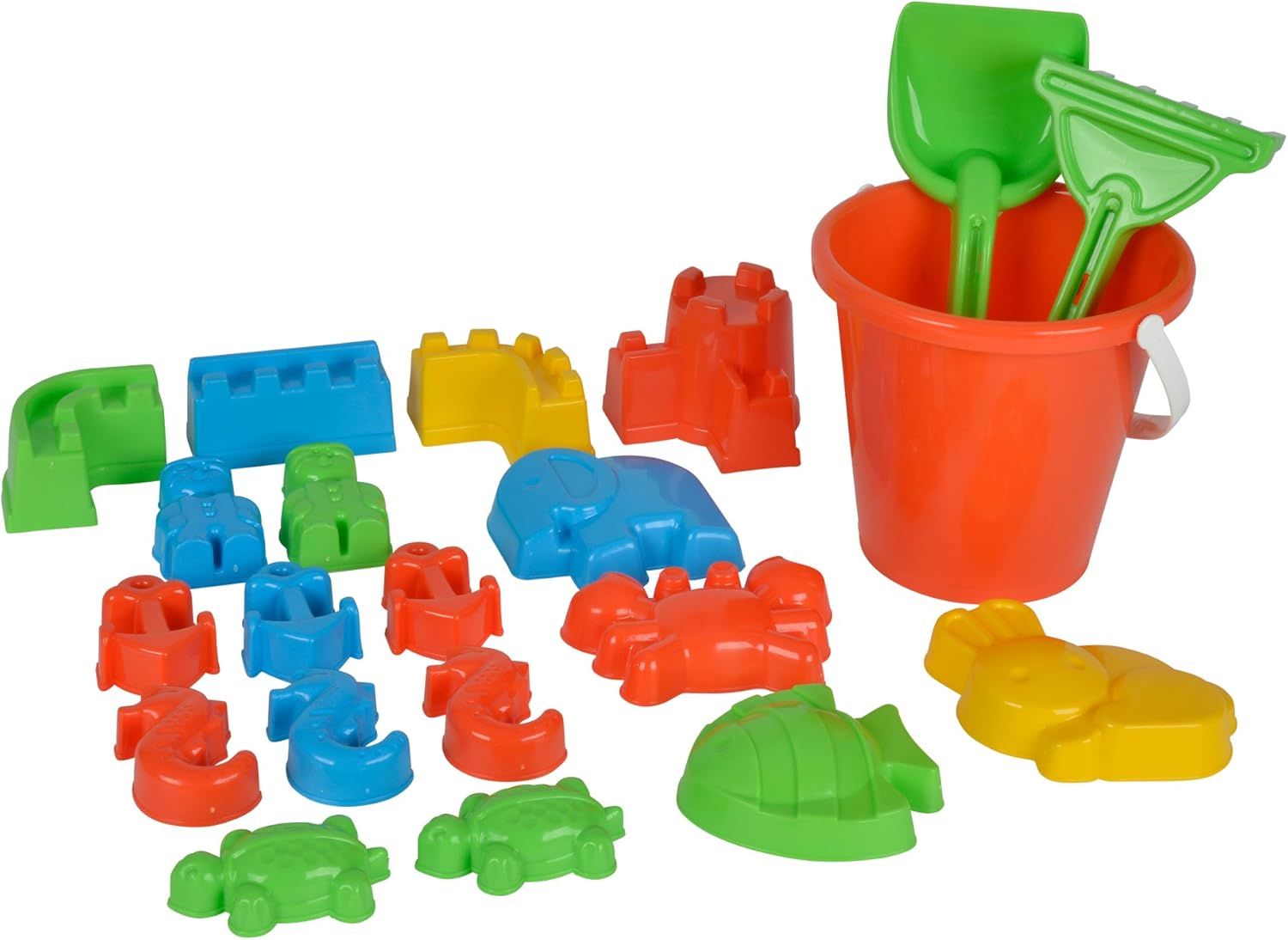 22 pezzi. Altezza: 17 cm Secchio da 18 stampini per sabbia, pala, rastrello, sacchetto. prodotti di alta qualità