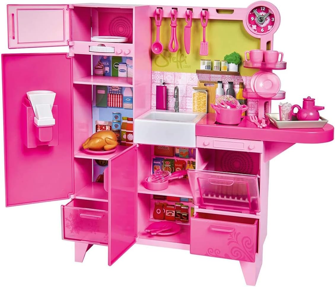 Scopri la Cucina di Steffi Love e divertiti a preparare con lei tanti gustosi pranzetti Nella cucina c'è tutto quello che serve: frigorifero, microonde, piano cottura con funzioni e tanti accessori Divertiti a cucinare con Steffi Love Fashion doll da 29 cm Adatto a partire dai 3 anni