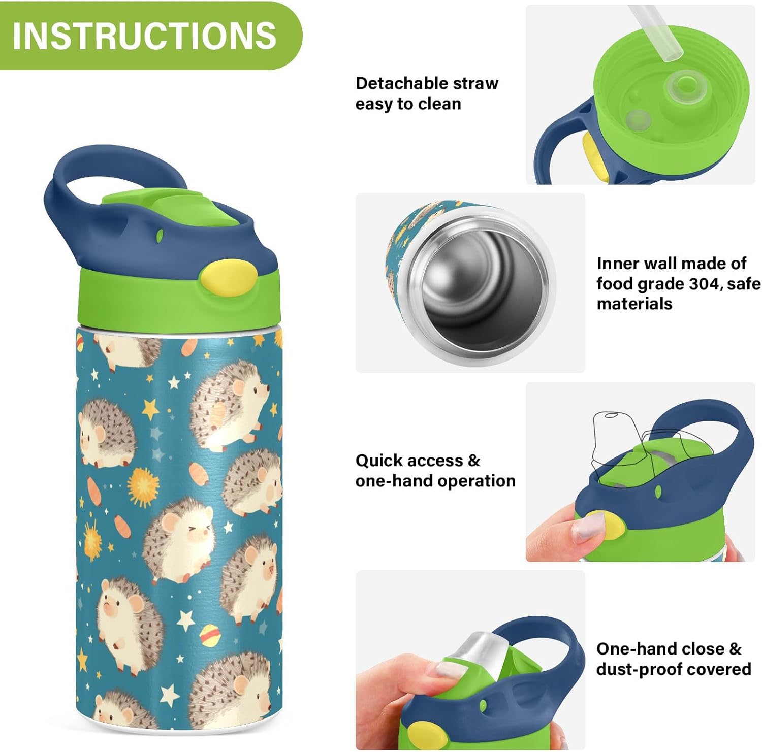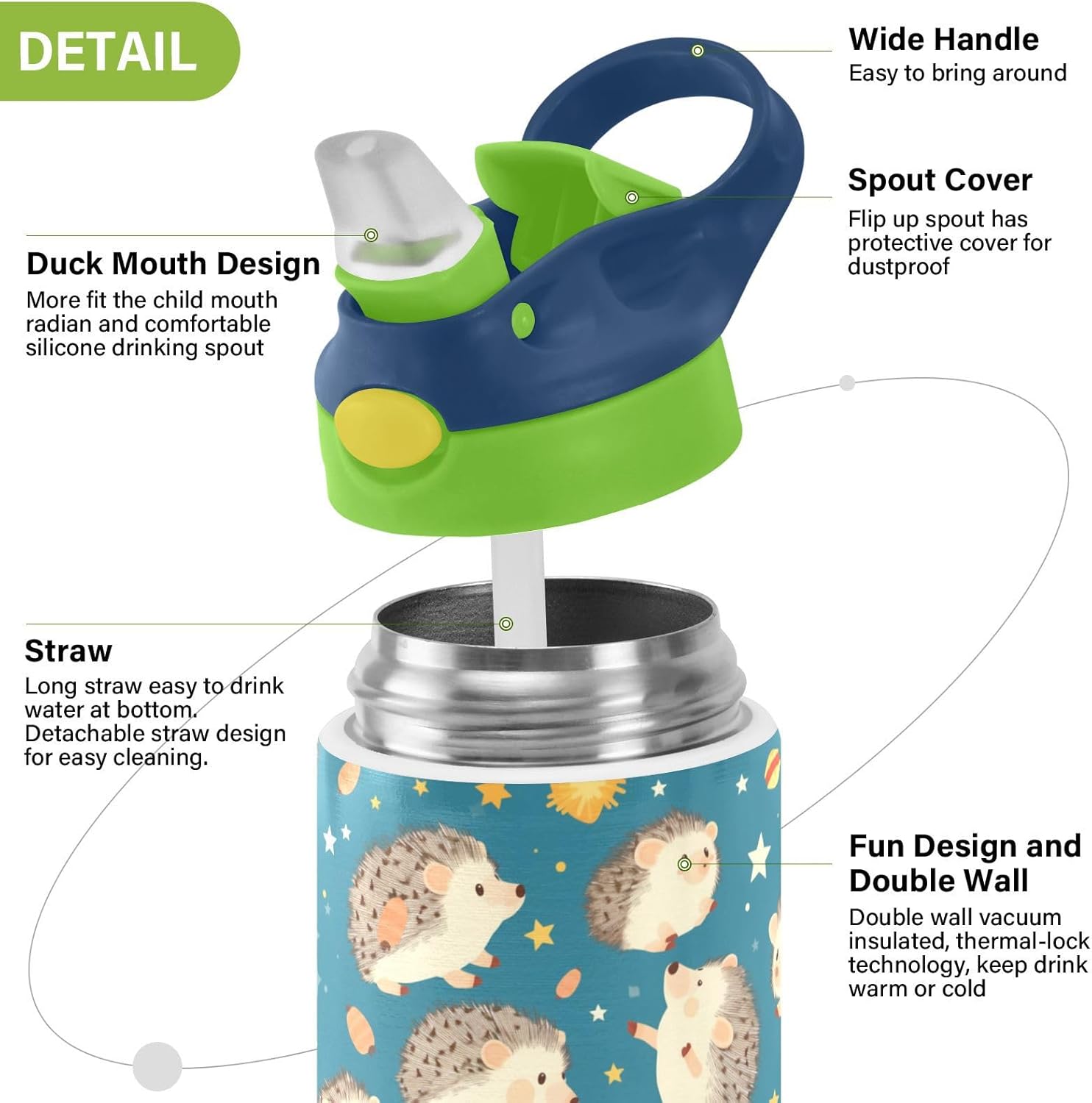 Materiale di sicurezza: il corpo in Tritan e il beccuccio in silicone alimentare garantiscono durata e sicurezza. Contiene 350 ml di acqua, perfetto per l'idratazione quotidiana. Non adatto a bambini di età inferiore ai 3 anni Comoda da trasportare: con un ampio manico per mani piccole e un gancio sul coperchio, la borraccia per bambini può essere appesa agli zaini. I bambini non faranno fatica a trasportarla durante le gite sul campo o le attività dopo la scuola. Funzionamento con una sola mano: il becco d'anatra si adatta alla bocca dei bambini, con una copertura antipolvere. L'interruttore a pulsante della borraccia sportiva è semplice da usare con una sola mano, in modo che i bambini possano bere mentre tengono una palla o un notebook. Blocco di sicurezza: il blocco del pulsante impedisce lo scoppio accidentale del becco d'anatra. Previene le perdite quando viene gettato nello zaino, mantenendo asciutti snack e compiti. Facile pulizia: tutte le parti della borraccia per bambini sono rimovibili per una pulizia accurata senza sporcare. Usa un detergente neutro e acqua calda: semplice per i genitori mantenere la pulizia per l'uso quotidiano.