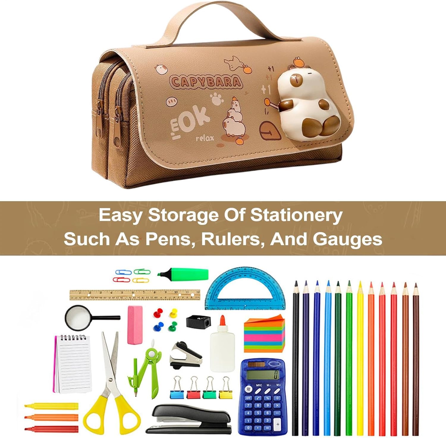 Compagno di riduzione della pressione: ideale per chi affronta compiti mentali impegnativi, questo strumento aiuta ad alleviare lo stress attraverso l'interazione tattile, promuovendo calma e concentrazione senza ulteriori distrazioni Struttura portatile e robusta: progettato con una cerniera affidabile e un materiale Oxford flessibile, questo astuccio portatile offre un accesso senza soluzione di continuità ai tuoi oggetti indispensabili garantendo al contempo una lunga durata per prestazioni quotidiane costanti Soluzione di archiviazione intelligente: include tre scomparti di grandi dimensioni per riporre le penne separatamente, migliorando l'efficienza di stoccaggio, grazioso astuccio per bambini, evitando la miscelazione disordinata e rendendo la posizione degli oggetti facile e veloce Design organizer adattabile: serve vari scopi, da un astuccio a un organizer per cosmetici, perfetto per classe, posto di lavoro, grazioso astuccio per penne panda, viaggi e uso quotidiano con ampio spazio per oggetti indispensabili Ispirazione regalo per le vacanze: il delizioso design panda capibara migliora sia i rituali di studio che di lavoro, offrendo una speciale miscela di funzionalità e stile che lo rende una perfetta opzione regalo per le vacanze