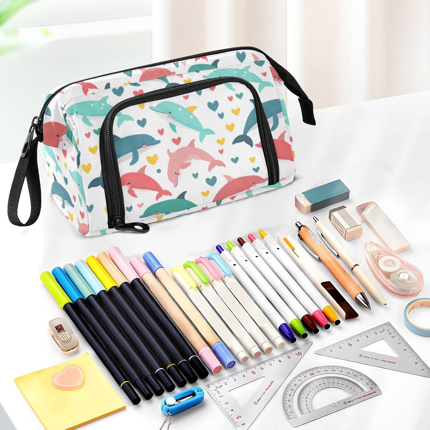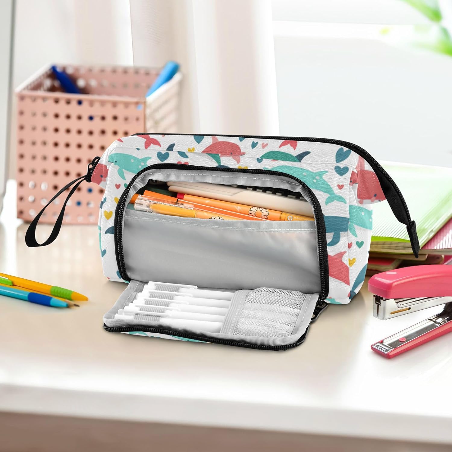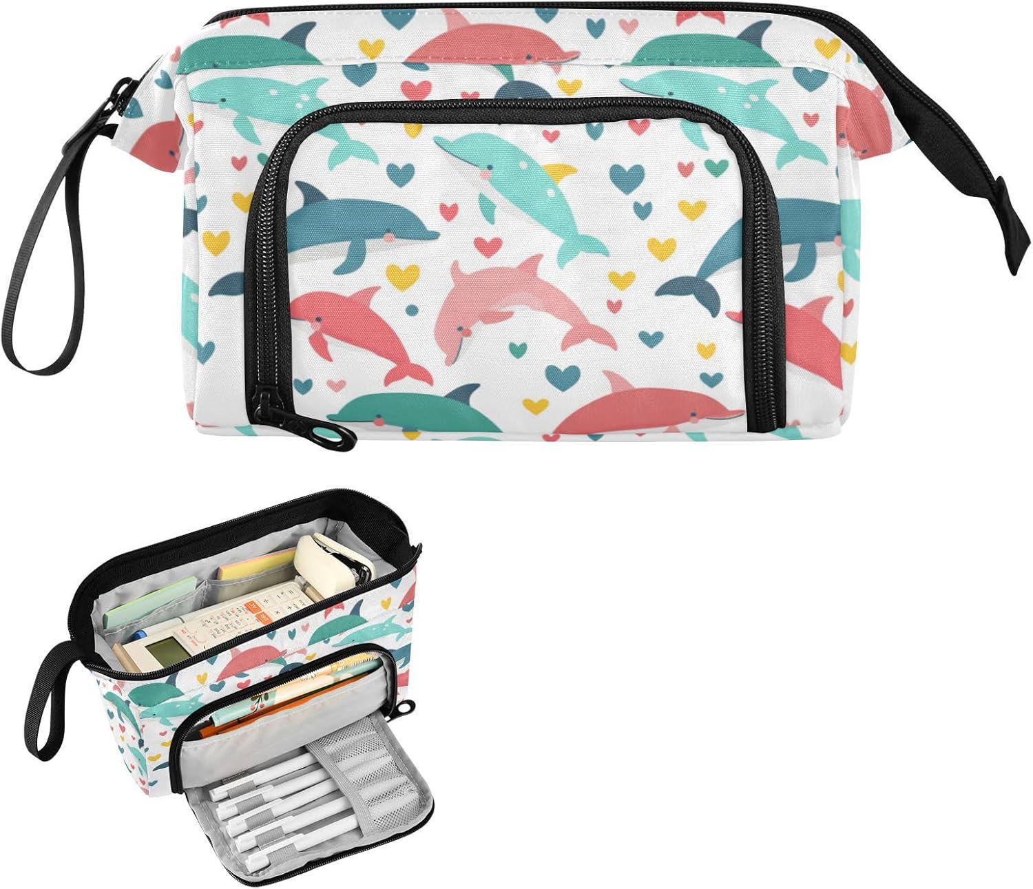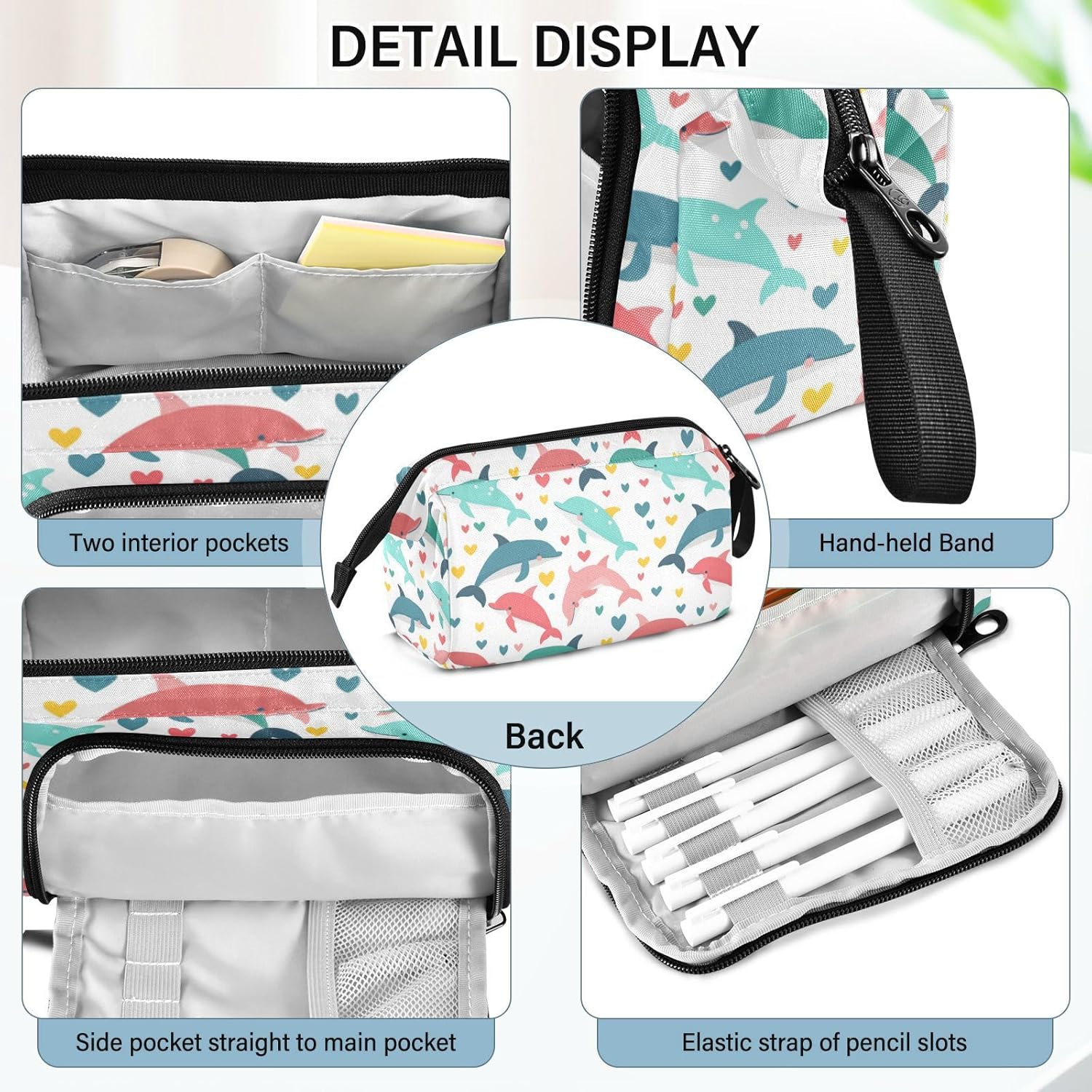 Materiale resistente: il nostro astuccio organizer è realizzato in nylon di alta qualità e cerniera liscia, che lo rende robusto, resistente all'usura, resistente ai graffi e facile da pulire. (Non adatto a bambini di età inferiore ai 3 anni!) Grande capacità: misura 24 x 9,5 x 15 cm. L'astuccio può contenere facilmente 40-60 penne o matite nel suo ampio scomparto, fornendo abbastanza spazio per i tuoi oggetti essenziali di cancelleria. Due tasche interne sono spazio per le piccole necessità quotidiane o materiale scolastico, come carte, contanti, chiavi, gomme, nastri, foglietti adesivi per trovarli facilmente e rapidamente. Design portatile e pratico: con funzionalità leggere e un'ampia fascia per tenere in mano, gli astucci possono essere messi facilmente nello zaino o tenuti in mano senza sforzo. L'apertura superiore e laterale aggiunge più comodità nella tua vita. Puoi controllare o prendere la tua cancelleria molto chiaramente dall'alto e raccogliere le tue matite preferite dagli slot fissi laterali. Scenario applicabile: l'astuccio non è solo un astuccio, ma può anche essere utilizzato per altri scopi. È adatto per occasioni come studio, ufficio, gite, viaggi, uscite e così via. Inoltre, può essere utilizzato come astuccio per penne, matite o pennelli, borsa per il trucco, ufficio personale e custodia per forniture scolastiche. Materiale lavabile: l'intero astuccio è lavabile. Il modo corretto di lavare è a mano; il lavaggio in lavatrice non è supportato. Non aggiungere candeggina durante la pulizia.
