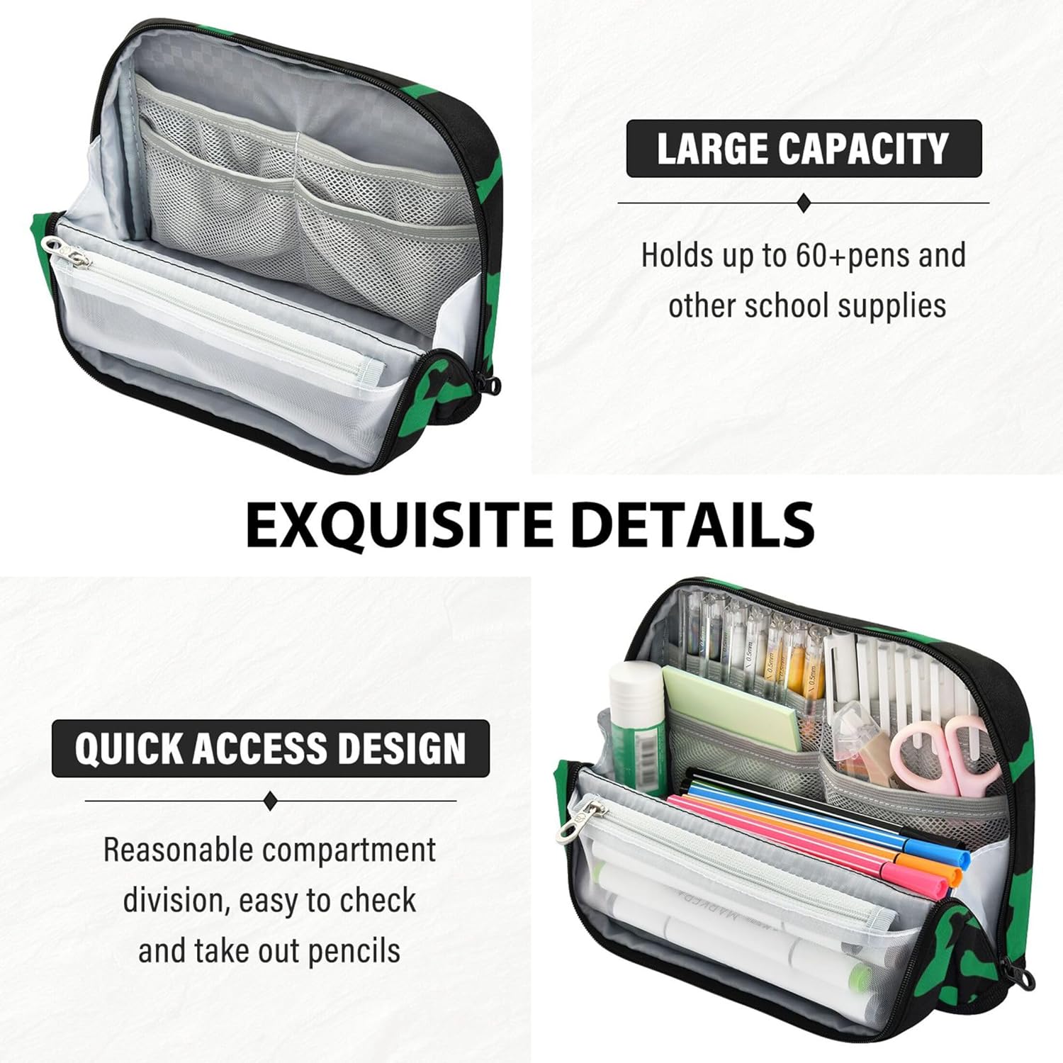Versatile funzionalità in piedi: l'astuccio si apre piatto e si ripiega saldamente per creare un contenitore autoportante, mescolando portabilità con comodità sulla scrivania Scelta del materiale di alta qualità: gli accessori per matite utilizzano nylon robusto che resiste all'abrasione, resiste agli strappi e rimane pulito con il minimo sforzo, ideale per studenti impegnati e creativi Design versatile con scomparti: l'astuccio ti aiuta a rimanere organizzato con un interno spazioso con aree distinte per tutti i tuoi articoli di cancelleria, strumenti o cosmetici Non solo per cancelleria: l'astuccio è pronto per contenere materiale scolastico, oggetti essenziali da viaggio o prodotti di bellezza, adattandosi perfettamente a ogni stile di vita Ideale come regalo: sia per un giovane studente, un artista o un amico in viaggio, l'organizzazione e la conservazione in classe possono essere personalizzati con testo o immagini per creare un ricordo memorabile