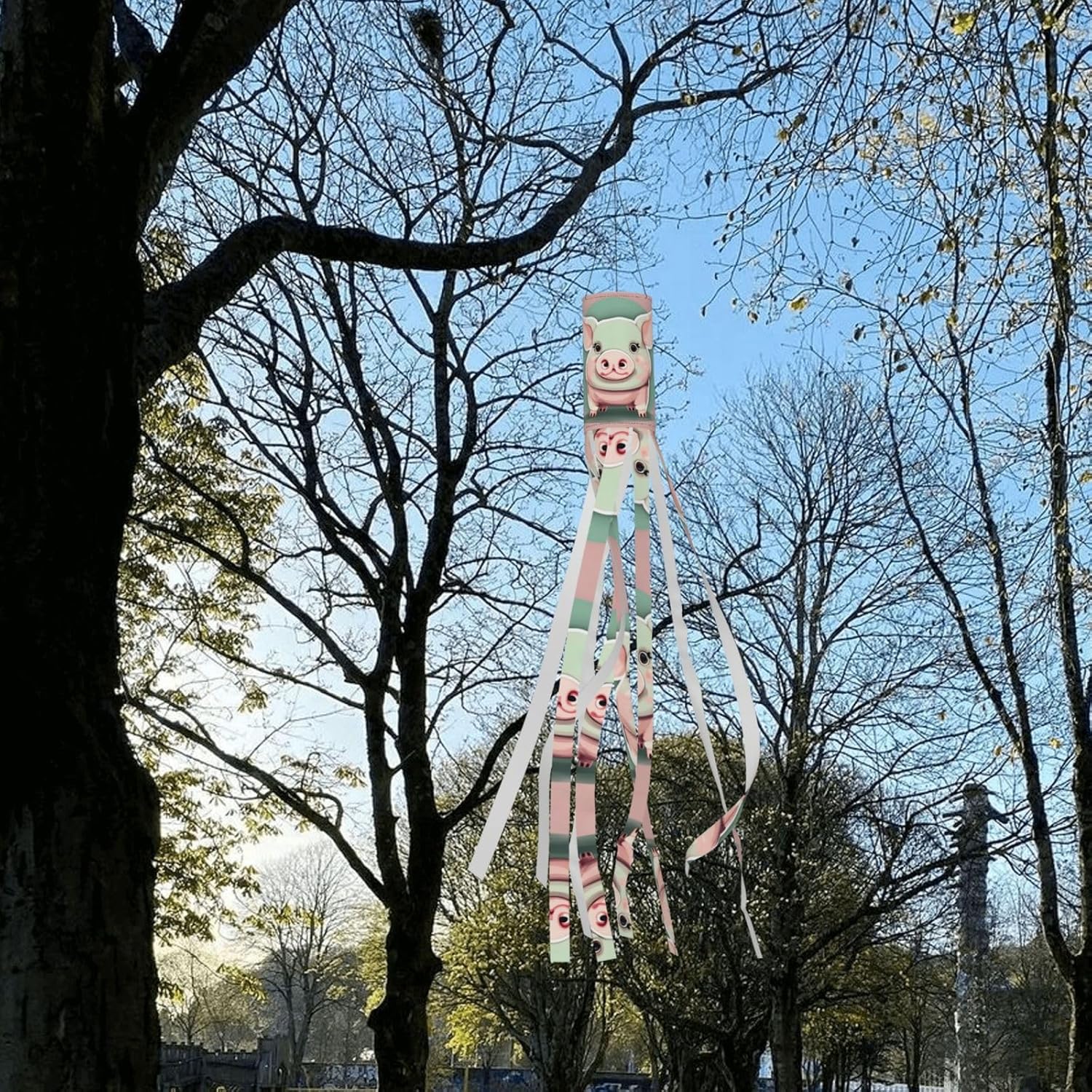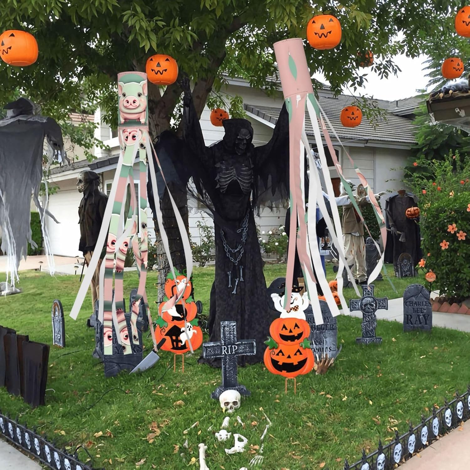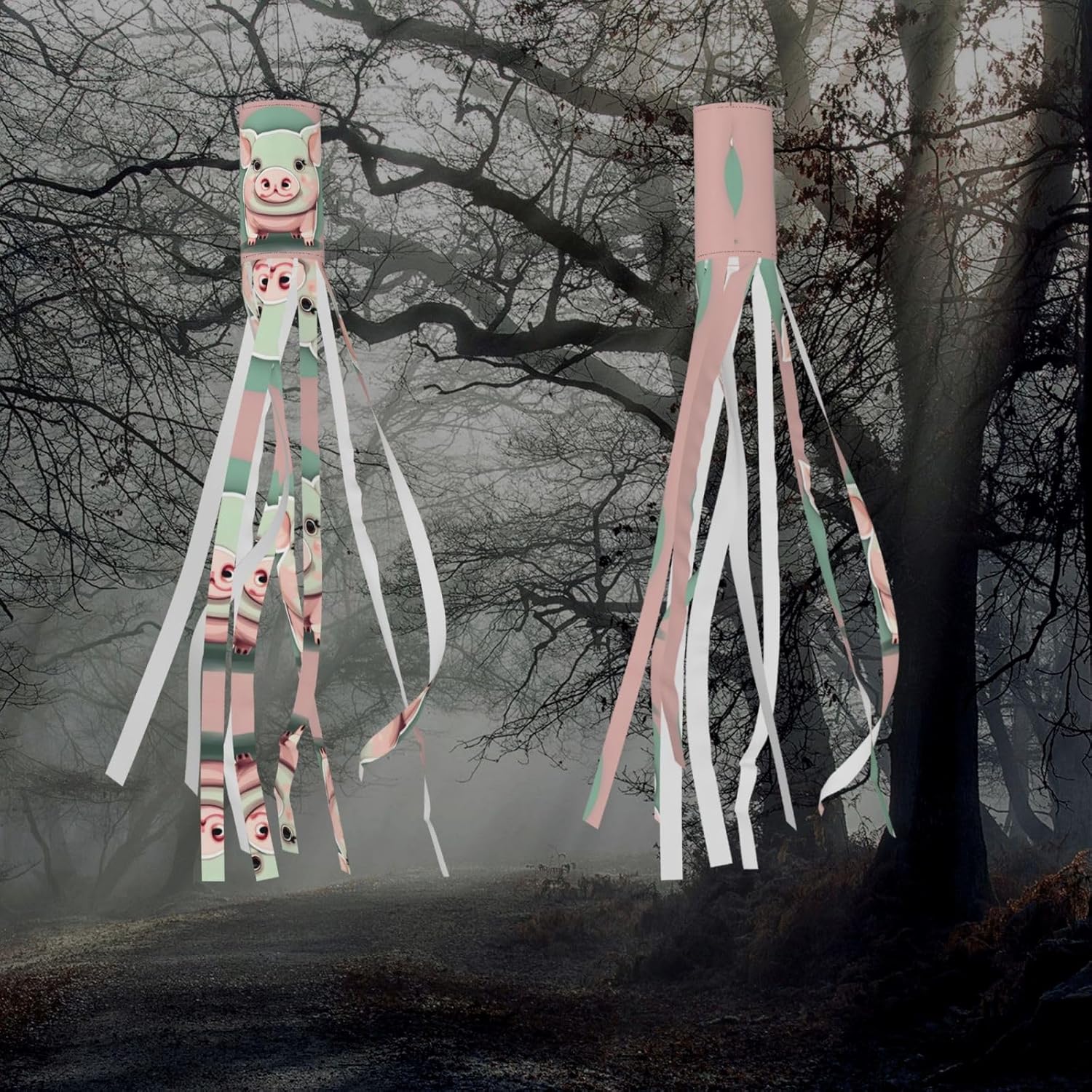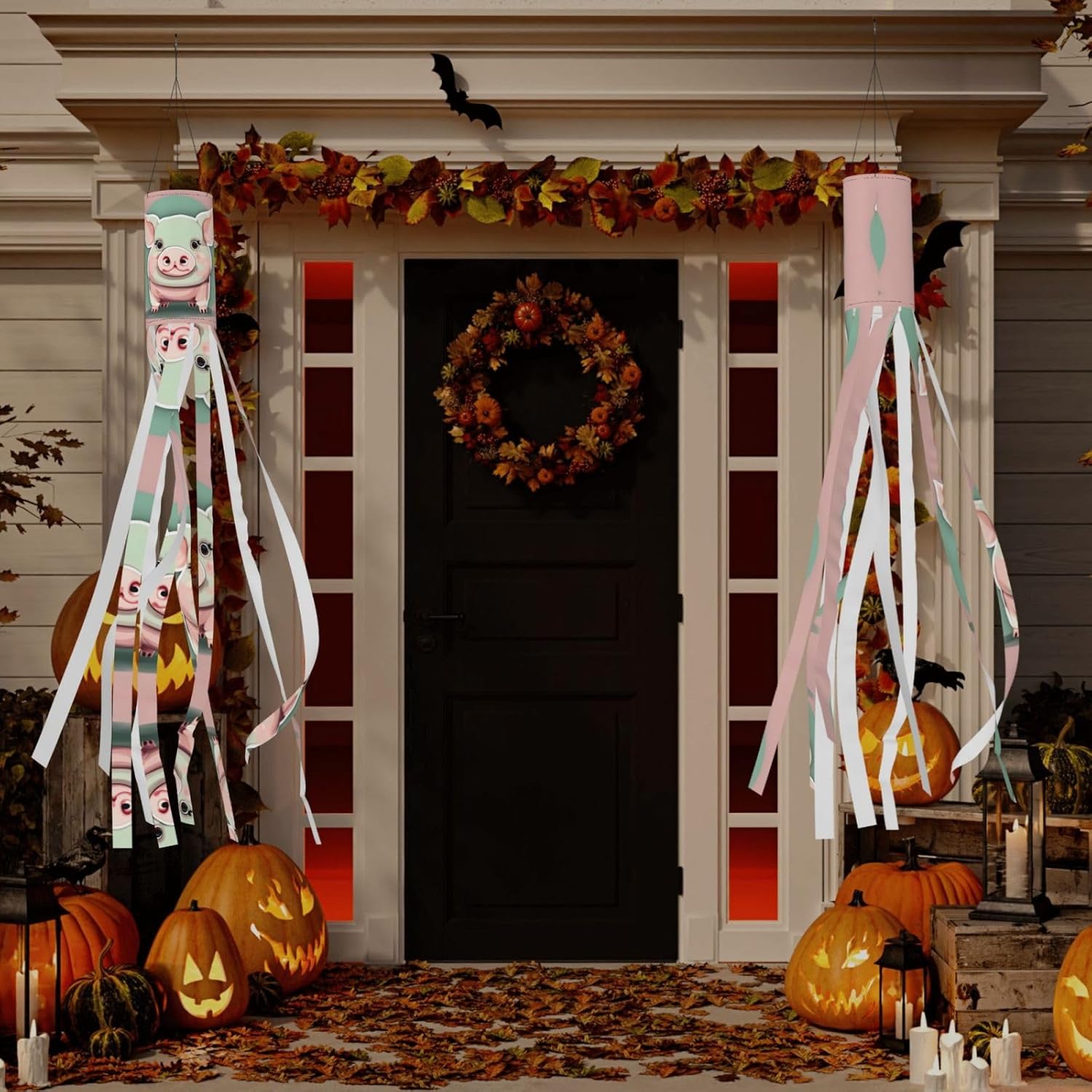 Simpatico maialino con orecchie lunghe, decorazione trascendente per le vacanze: Halloween e calze a vento da strega per avvincenti feste all'aperto