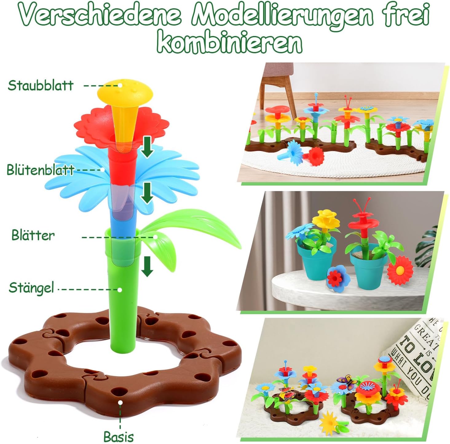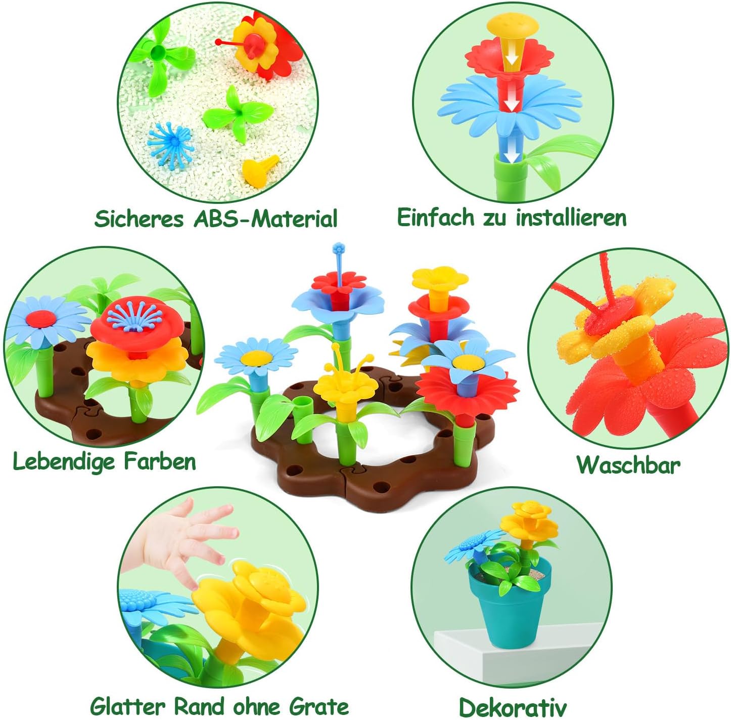 | Lernziel | Lernen Sie mehr über Pflanzenteile, verbessern Sie die Hand-Augen-Koordination und die Feinmotorik, entwickeln Sie Kreativität und Phantasie |