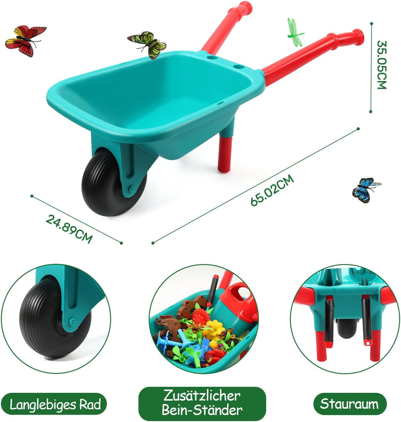 🌸 Incredibile 𝐒𝐩𝐢𝐞𝐥𝐳𝐞𝐮𝐠 𝐒𝐞𝐭 𝐮𝐧𝐝 𝐁𝐥𝐮𝐦𝐞𝐧-𝐁𝐚𝐮𝐬𝐚𝐭𝐳: questo set da 71 pezzi contiene tutto ciò di cui il tuo bambino ha bisogno per esplorare la natura: una carriola a misura di bambino, un annaffiatoio, una pala, 54 componenti di fiori fai da te, 12 figure di insetti e vasi di fiori. Il set di attrezzi da giardino aiuterà i tuoi bambini a esplorare la natura e si divertirà moltissimo! 🛒 𝐒𝐩𝐚ß-𝐒𝐜𝐡𝐮𝐛𝐤𝐚𝐫𝐫𝐞:Questa carriola è tanto funzionale quanto divertente. Le maniglie sono ideali per le mani dei più piccoli, facili da spingere e incoraggiano i bambini ad aiutare nel giardinaggio. Dopo le attività all'aperto, i bambini possono riporre i loro attrezzi nella carriola. Dimensioni del prodotto (L×L×A): 67 cm × 25 cm × 35 cm - consigliato per bambini di età superiore a 3 anni. 🌱 𝐁𝐢𝐥𝐝𝐮𝐧𝐠𝐬-𝐒𝐩𝐢𝐞𝐥𝐳𝐞𝐮𝐠 𝐟ü𝐫 Facile da usare: basta impilare i componenti del fiore e assemblarli. I bambini possono utilizzare le parti per creare diverse forme di fiori e conoscere le parti di una pianta. Ciò promuove la coordinazione occhio-mano, le capacità motorie e sviluppa la creatività e l'immaginazione dei bambini. 🌞 I bambini possono giocare con gli attrezzi da giardino all'aperto nella terra o nella sabbia o costruire un giardino nella sabbiera o sulla spiaggia. Possono anche giocare di ruolo in ambienti chiusi, il che prevede l'interazione fisica con amici e familiari. Un fantastico giocattolo per il tempo in famiglia. 🌍 Alta qualità: tutte le parti sono realizzate in plastica ecologica di alta qualità, inodore e durevole. Sono abbastanza robusti da poter giocare con il terreno o con il terreno del giardino e hanno bordi lisci sicuri per i bambini. Un fantastico regalo per Natale, feste di compleanno o altre occasioni speciali. Sorprendi i tuoi piccoli con questo colorato set di attrezzi da giardino!
