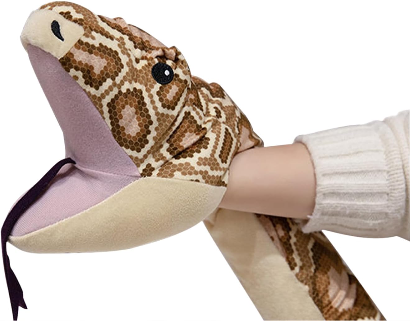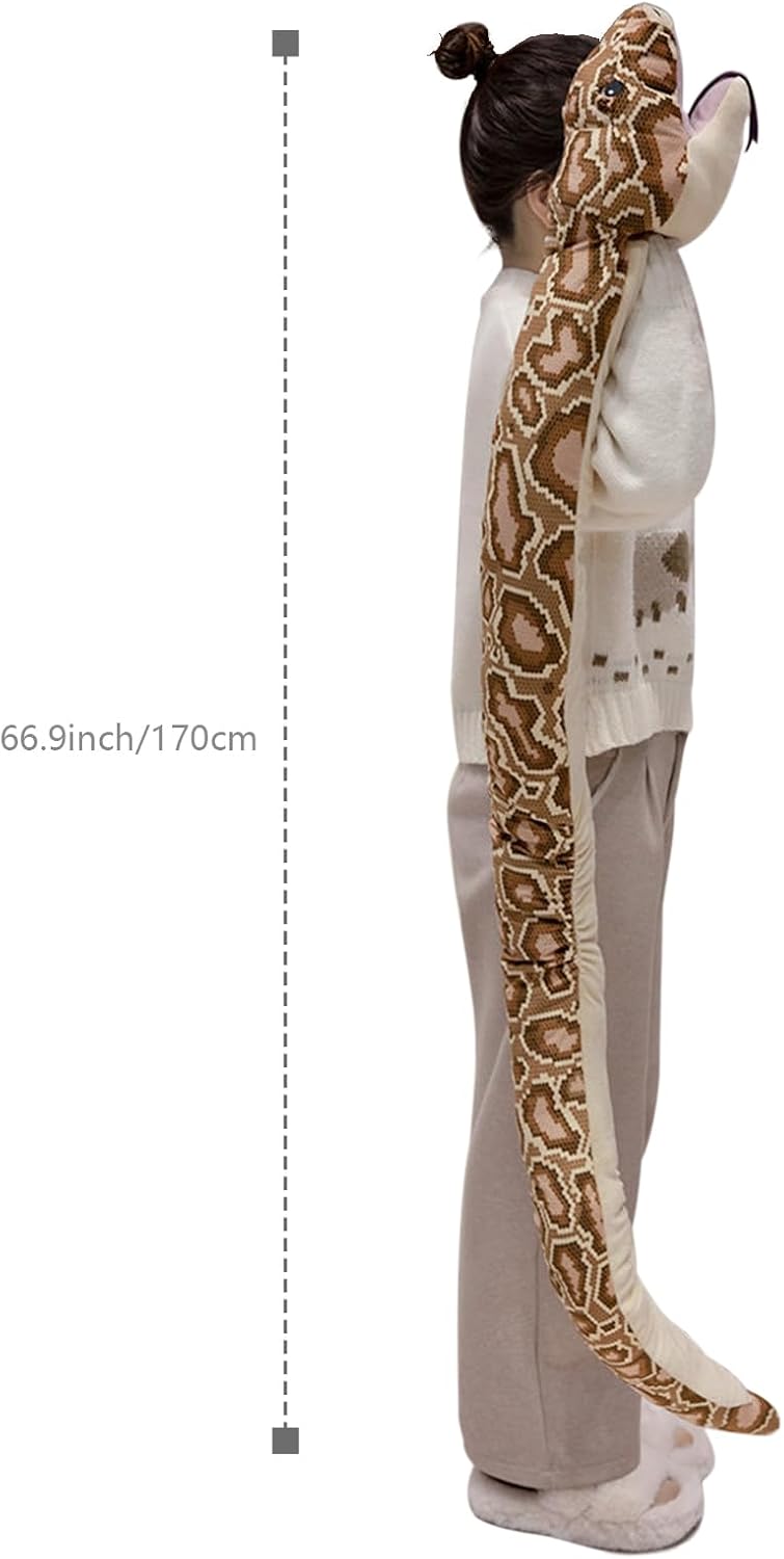 MATERIALE SUPER MORBIDO: Lo strato esterno della bambola di peluche serpente è realizzato in tessuto morbido e corto e soffice, e la parte interna è riempita con cotone PP di alta qualità, che rende la bambola soffice e carina, e il tocco è morbido e confortevole, che ti fa amare. DESIGN DELLA MANO INSERIBILE: La testa della bambola del serpente marrone ha un design unico, puoi inserire la mano al suo interno per far muovere la testa e la bocca, il che rende il serpente più vivace e realistico con cui giocare. MODELLAZIONE REALISTICA: il peluche serpente ha un aspetto realistico di pitone, puoi vedere chiaramente la lingua del pitone e così via. Dettagli realistici e forma carina. Usalo per abbellire la tua stanza o decorare una festa, può attirare l'attenzione di tutti. DIMENSIONE PERFETTA: questa marionetta in pitone è lunga 170 cm, leggera e facile da trasportare e posizionare. Puoi posizionarlo sul divano, sul letto o sul pavimento, rendendolo una decorazione e un giocattolo unici. Questi grandi serpenti sono perfetti da coccolare! REGALO ORIGINALE: Questa bambola di pitone può essere utilizzata come decorazione della stanza, come peluche per bambini, o come decorazione per feste, film o teatri, o come oggetto di scherzo nei giochi, rendendola un regalo molto originale.