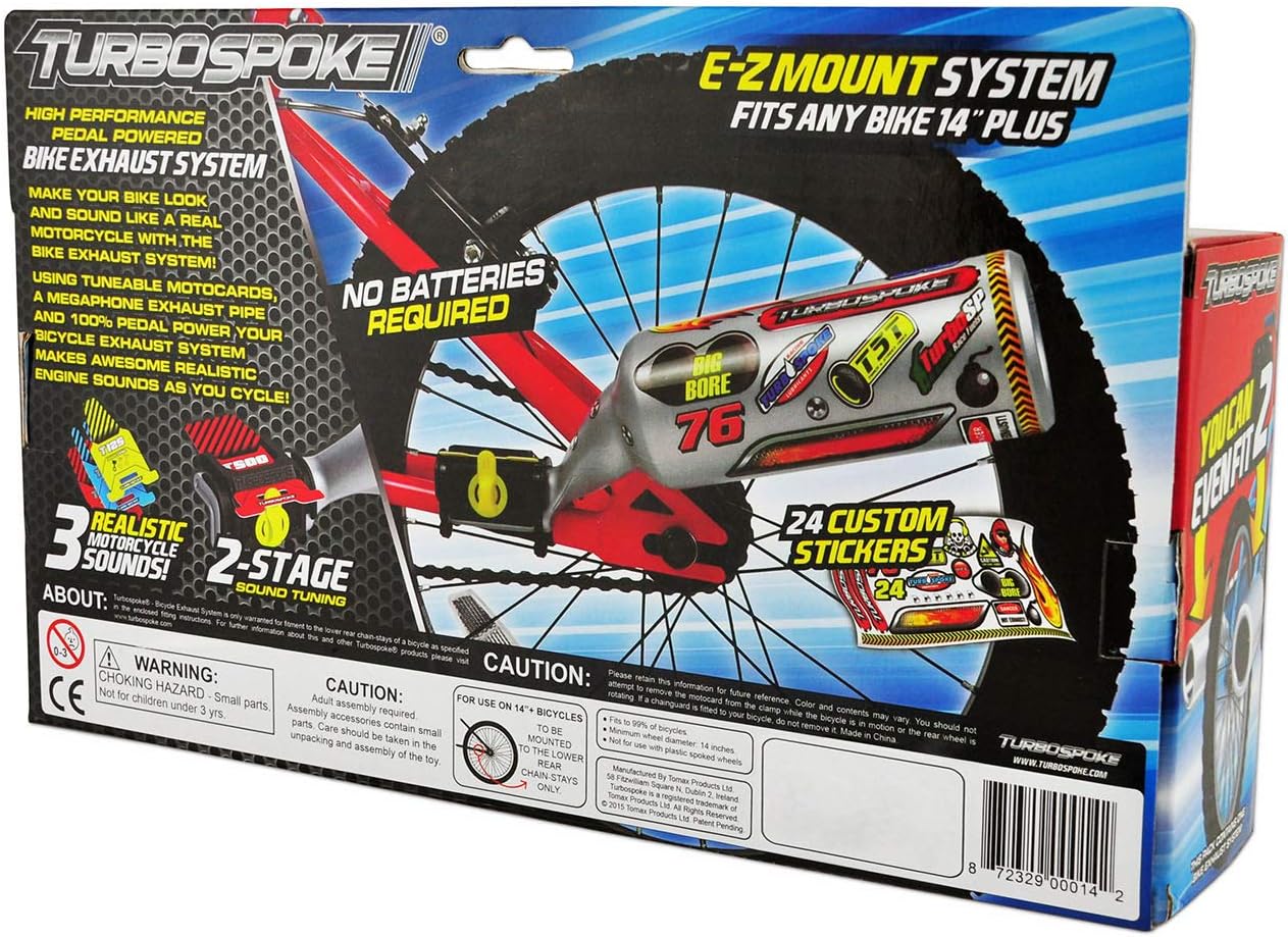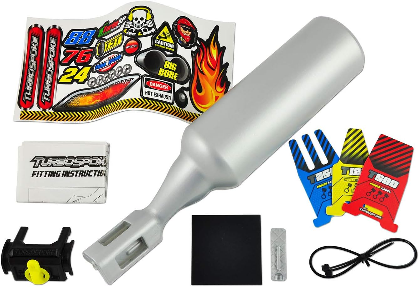 Il TurboSpoke è ideale per personalizzare la bici del tuo bambino Ha 3 suoni del motore e 24 adesivi per lo scarico Il rumore funziona con la frizione dei raggi della bici Il Turbospoke si adatta al 100% delle bici e si può installare su entrambi i lati Adatto a bambini dai 5 anni