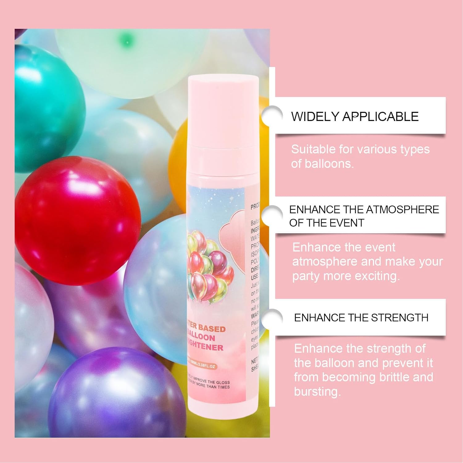 [Ambiente vivente] Aumenta l'umore di ogni evento con palloncini luminosi e belli. [Robusto e luminoso] rafforza i palloncini e migliora il suo aspetto brillante. [Magia portatile] Usalo ovunque per ottenere una luminosità immediata ed eleganza dei tuoi palloncini. [Sicuro ed efficace] contiene ingredienti sicuri che possono essere facilmente eliminati senza sprechi. [Usa tutte le occasioni] Per matrimoni, compleanni e celebrazioni per le vacanze in modo che i palloncini sembrino impressionanti.