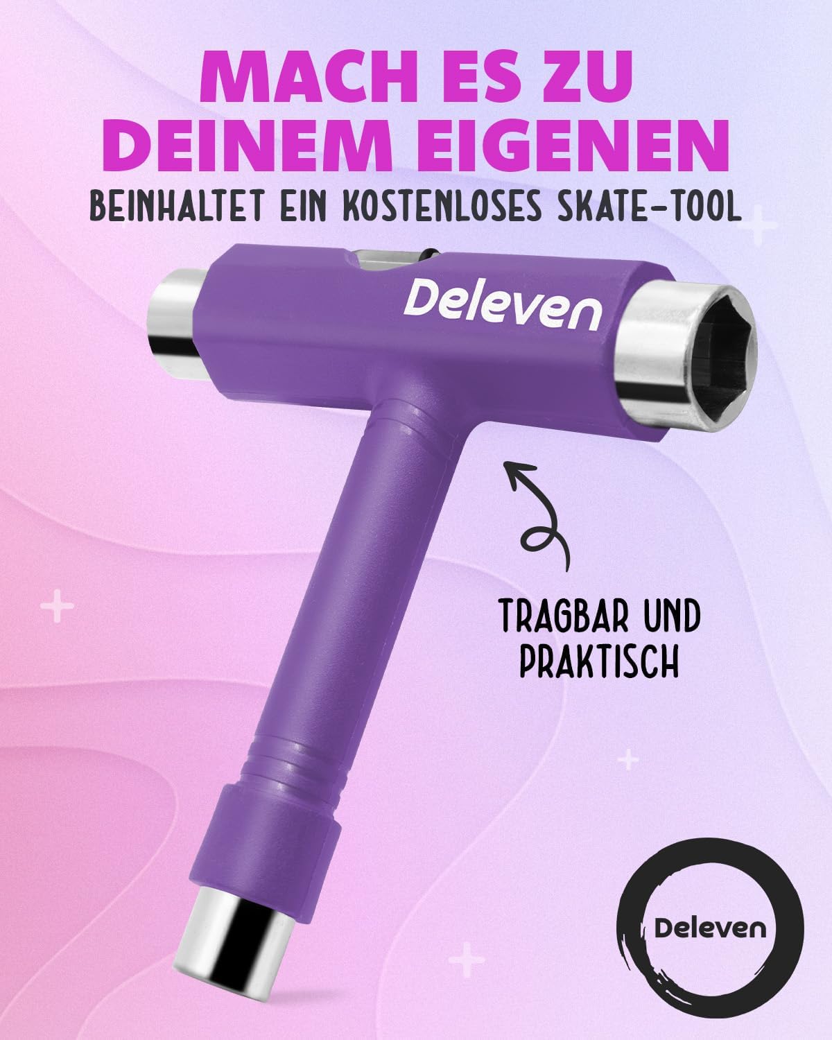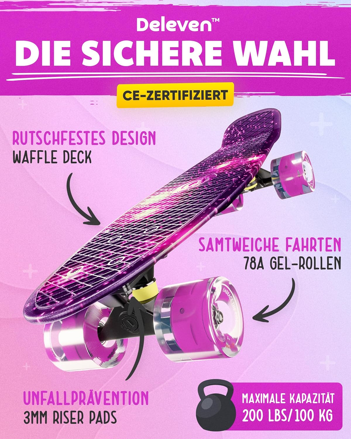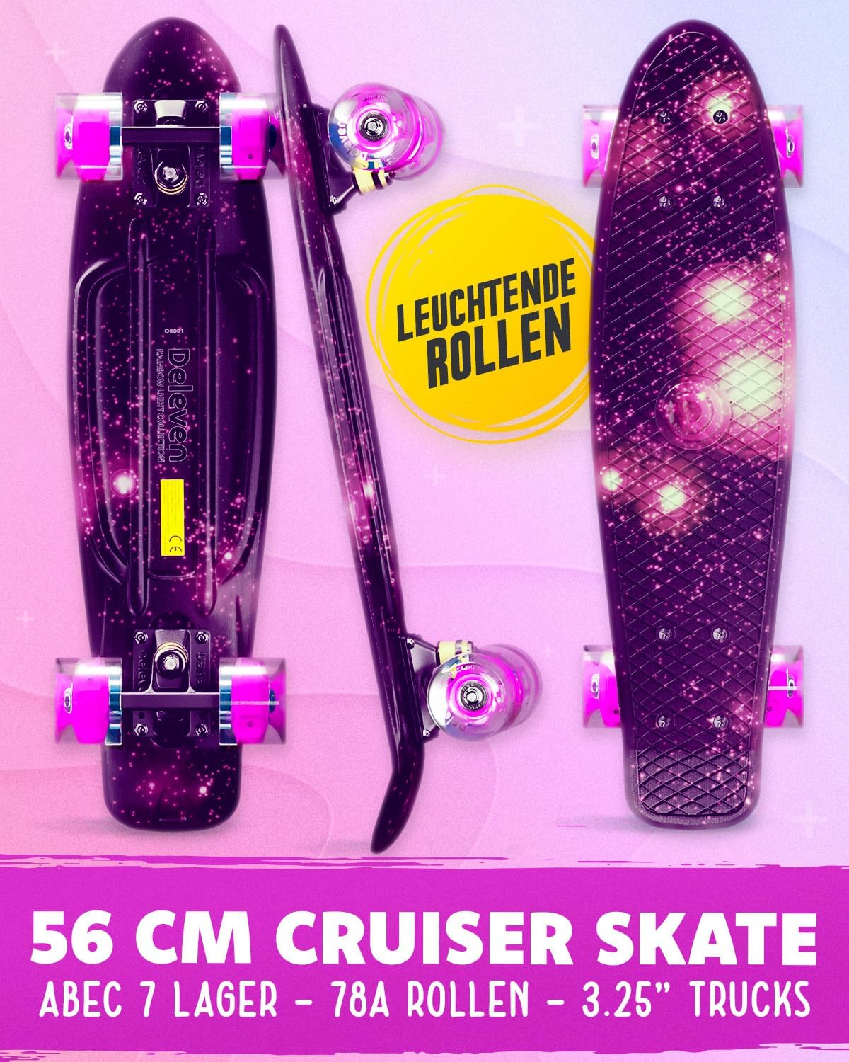 Luce brillante: lo skateboard è dotato di ruote a LED, divertenti sia per i bambini che per gli adulti. Ti farà risaltare e stupirà gli altri! Non sono necessarie batterie, continua a brillare! Componenti di alta qualità: selezionati con cura per garantire la migliore esperienza. Cuscinetti ABEC-7, ruote LED 78PU da 60 mm, sospensioni con boccole in PU 85A per controllo ed equilibrio senza sforzo. I nostri Skateboard Mini sono divertimento sullo skateboard per tutti! Il regalo perfetto: puro entusiasmo! Mini skateboard Deleven per tutti: bambini, adulti, ragazzi e ragazze. Disegni unici, divertimento indimenticabile. Affidati alla qualità e alla sicurezza olandesi. Include uno strumento per skateboard: il nostro skateboard completo viene fornito completamente assemblato e ogni mini skateboard cruiser include uno strumento per skate T-tool. Utilizza lo strumento per personalizzare il tuo skateboard in base alle tue preferenze Soddisfazione garantita - Non sei soddisfatto? Rimborso! Se hai problemi con il tuo acquisto, contattaci e risolveremo la questione. Acquista con fiducia il nostro skate board Galaxy Star originale