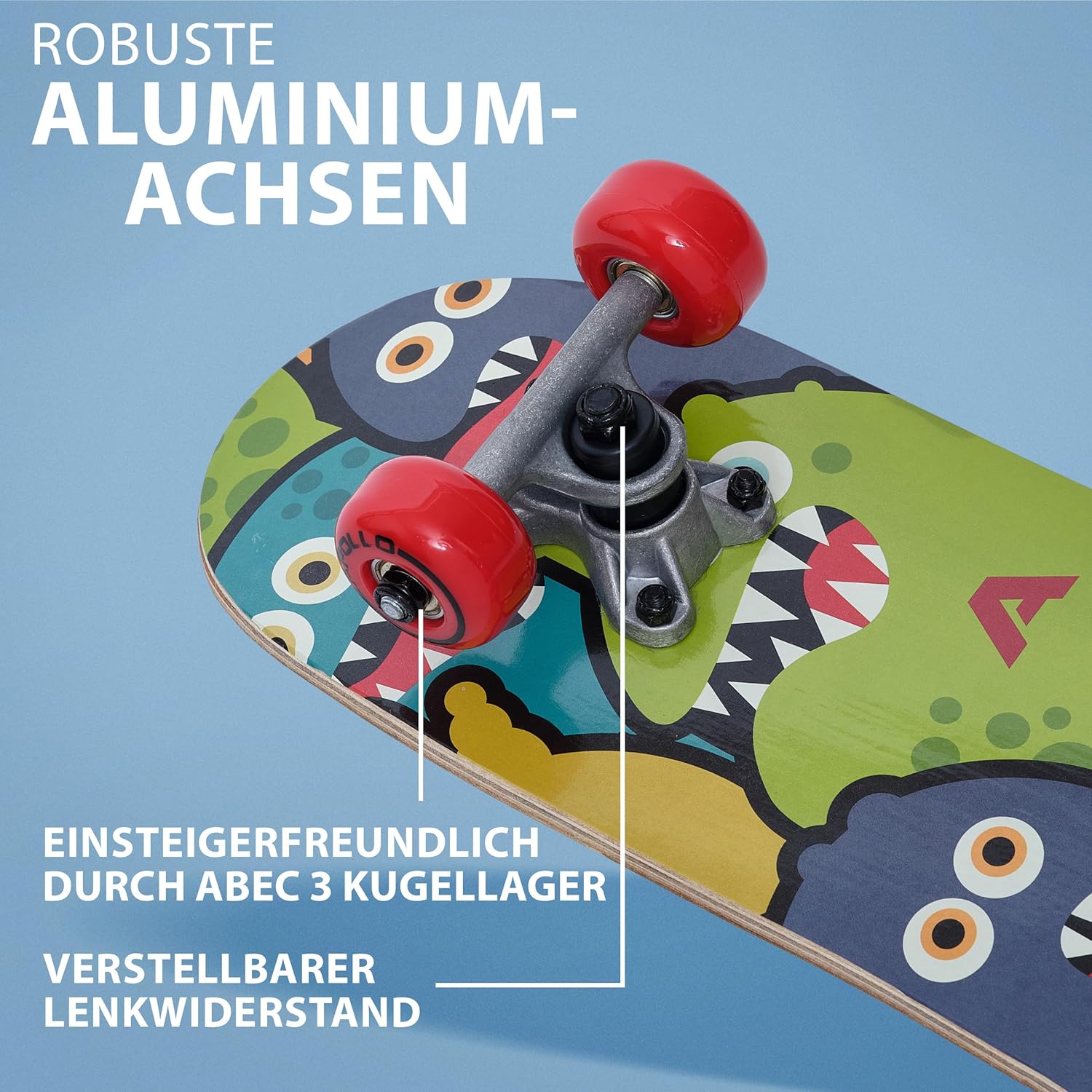 SKATEBOARD PER BAMBINI! - tavola elegante. I bambini più piccoli possono iniziare i primi esercizi di pattinaggio su questa tavola con l'aiuto dei genitori. Trasforma anche i bambini più grandi dai 5 anni in piccoli pattinatori! PROGETTO! Le nostre tavole sono caratterizzate da design accattivanti e buona qualità. Che si tratti di ragazzi o ragazze, per ognuno c'è il giocattolo da esterno giusto. I motivi colorati entusiasmeranno anche gli adolescenti. ALTA QUALITÀ! Tavola da skateboard per bambini in struttura in legno multistrato, carrelli da skateboard in alluminio, cuscinetti a sfera ABEC3 - massima qualità per tutti i piccoli e grandi skater che vogliono iniziare bene. PRODOTTO MARCHIATO! Ogni skateboard Apollo per bambini dai 3 anni in su è accuratamente testato e, secondo la classificazione ufficiale, può sostenere fino a 20 kg (testato fino a 50 kg). Viene consegnata come tavola completamente assemblata, pronta per l'uso immediato per bambini felici. FANTASTICHE IDEE REGALO! Regali di compleanno, regali di Natale, regali per bambini. Uno skateboard Apollo per bambini si adatta sempre. Stai cercando un regalo? Assicurati che questo skateboard delizierà i bambini dai 6 anni in su in ogni occasione.