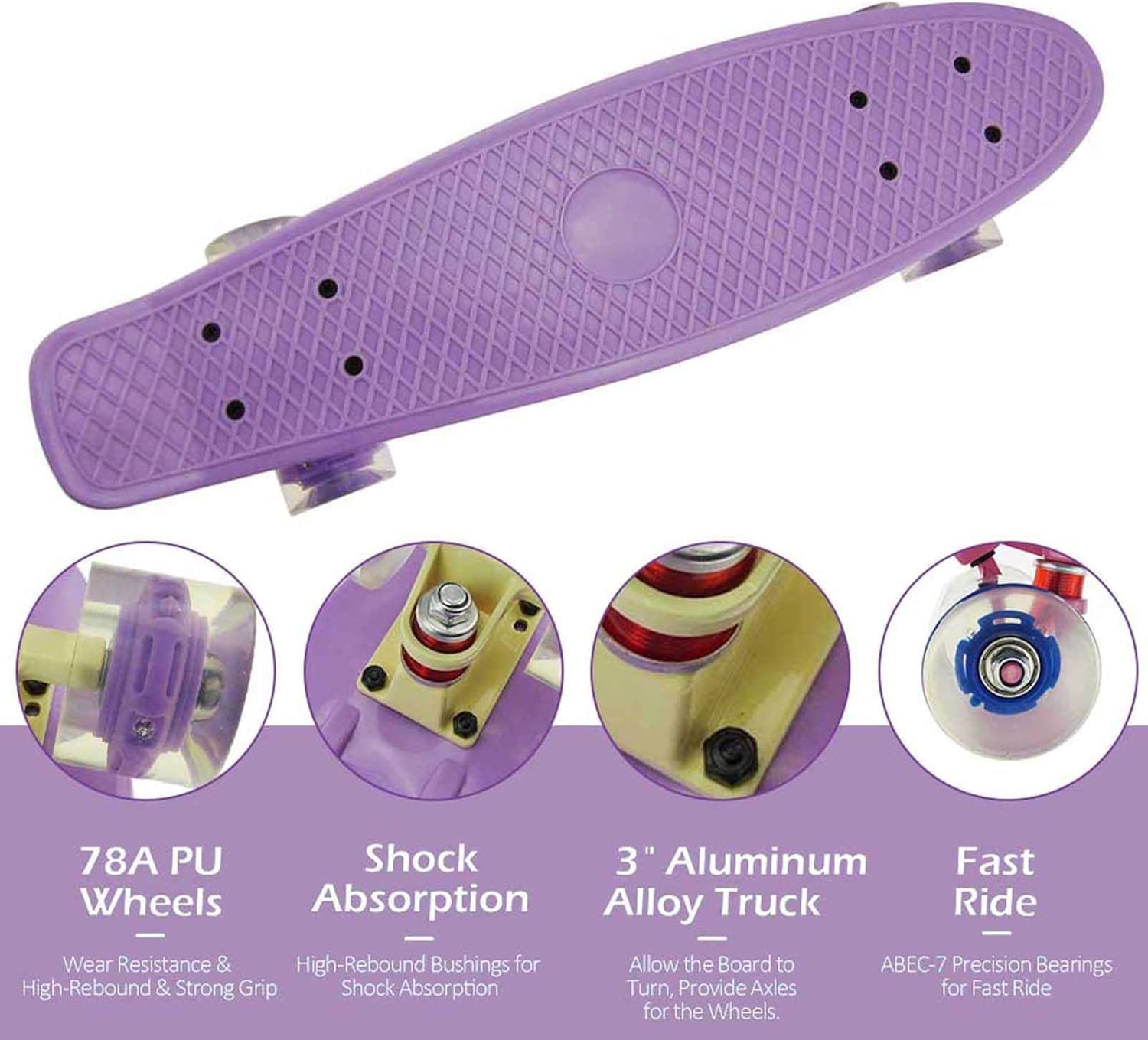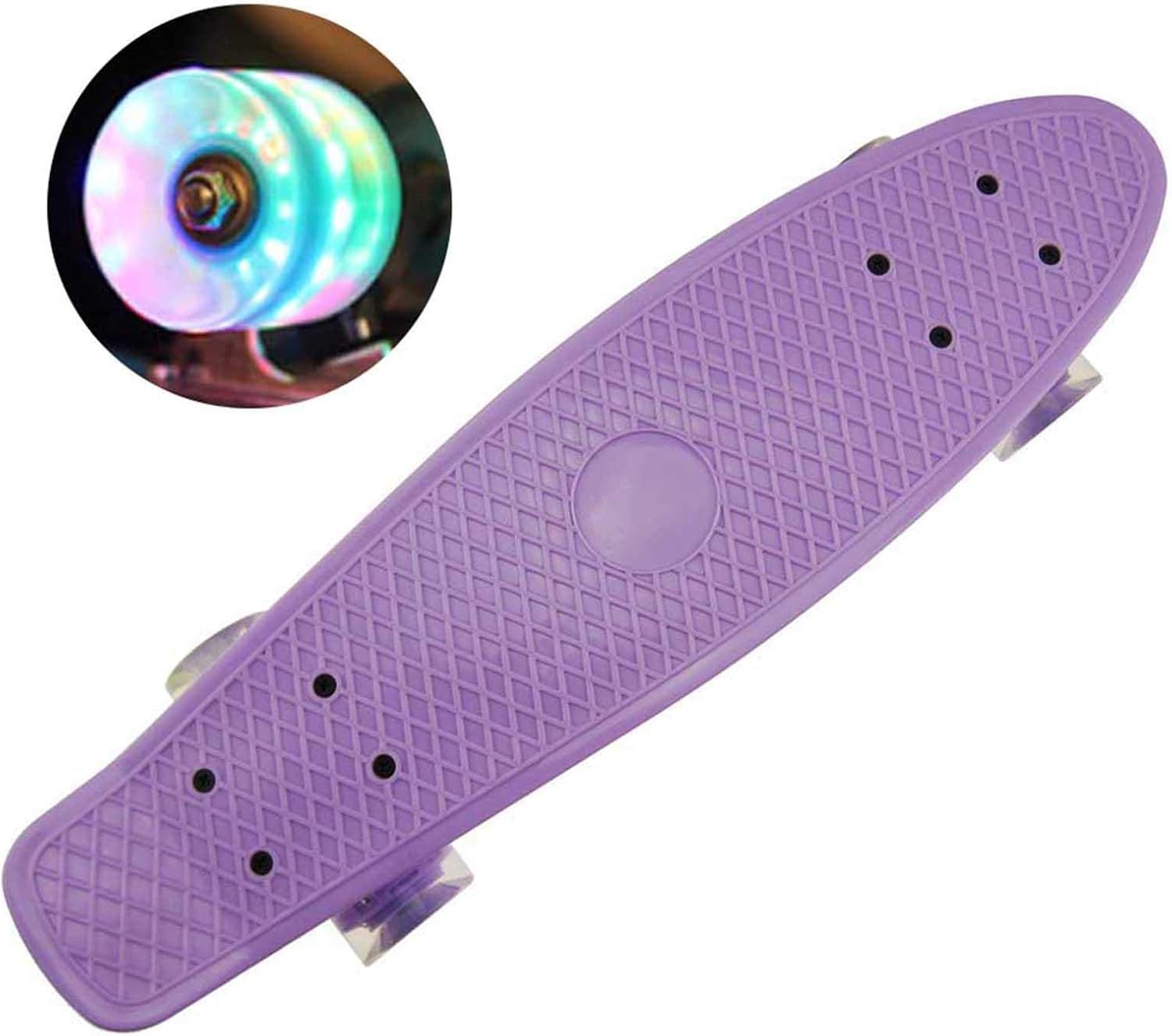 Facile da trasportare: il nostro mini skateboard completo è completamente assemblato e pronto a godersi il viaggio con questo incrociatore completamente assemblato. Design semplice e diretto, lo skateboard ha una dimensione di (circa) 22" di lunghezza x 6 pollici di larghezza. lo skateboard pesa 3,8 libbre, facile da trasportare, che si adatta facilmente a un bagaglio o nello zaino. Skateboard illuminato: lo skateboard è dotato di ruote illuminate per una crociera seriamente fresca, le luci sulla ruota quando guida è luminosa e colorata, aggiungono un ulteriore elemento di divertimento. Inoltre, non devi preoccuparti di caricarlo o sostituire le batterie, che si accendono sempre mentre stai guidando. Robusto e durevole: lo skateboard è realizzato in polipropilene, resistente e durevole, e supporta il ciclista fino a 220 libbre. Lo skateboard cruiser viene fornito con camion in alluminio da 3,25 pollici (circa) di spessore per la massima velocità e controllo. E lo skateboard è perfetto per varie manovre. Tavola antiscivolo per una maggiore sicurezza. Ruote morbide: la tavola da crociera è dotata di ruote in poliuretano morbido, cuscinetti ABEC-7 ad alta velocità e assorbimento degli urti di alta qualità. E la tavola cruiser viene fornita con uno skate T-Tool all-in-one per soddisfare le tue esigenze. ✿✿✿ Perfetto per i principianti: lo skateboard per principianti è progettato per bambini, adolescenti o adulti che vogliono divertirsi o spostarsi in città con un manico morbido e confortevole. Perfetto per andare al negozio o su una strada tortuosa alberata e per persone di una vasta gamma di età