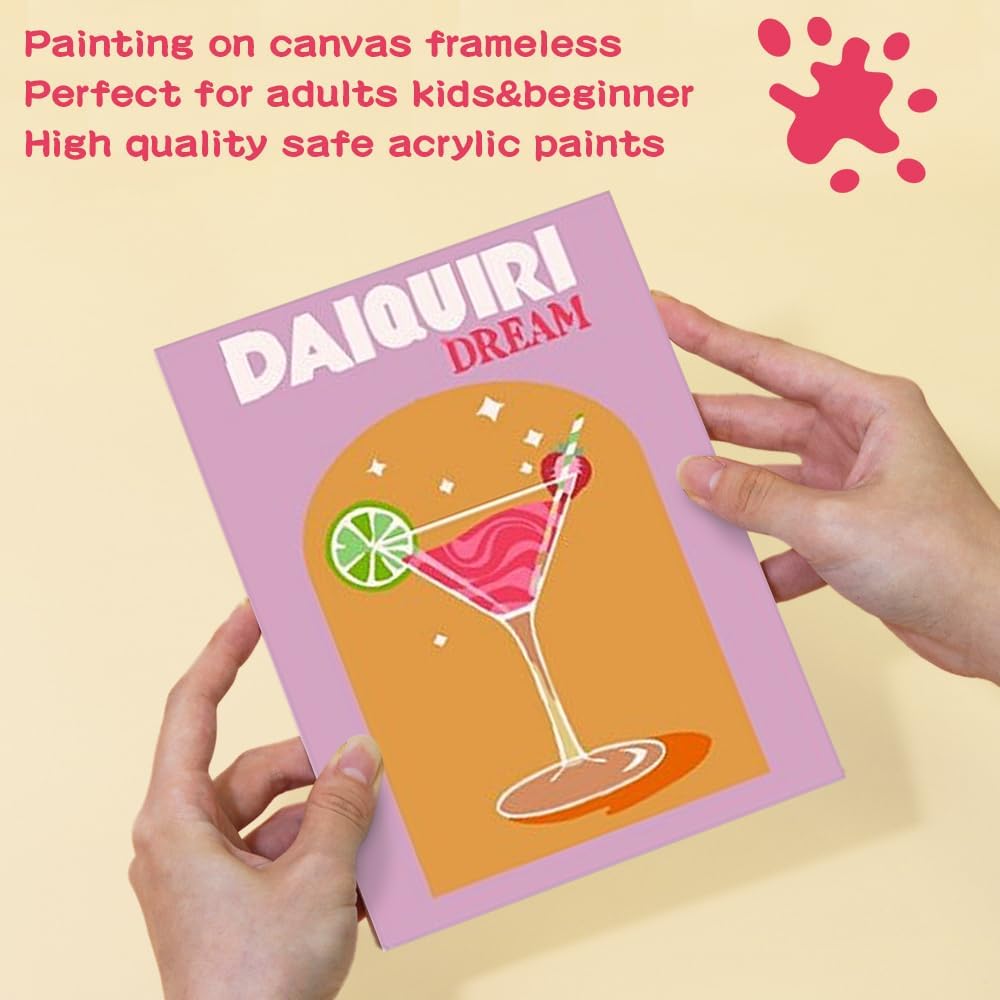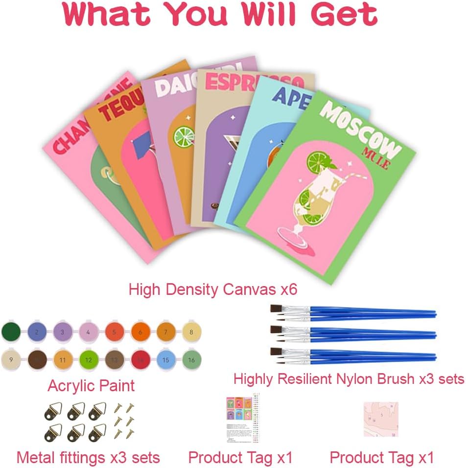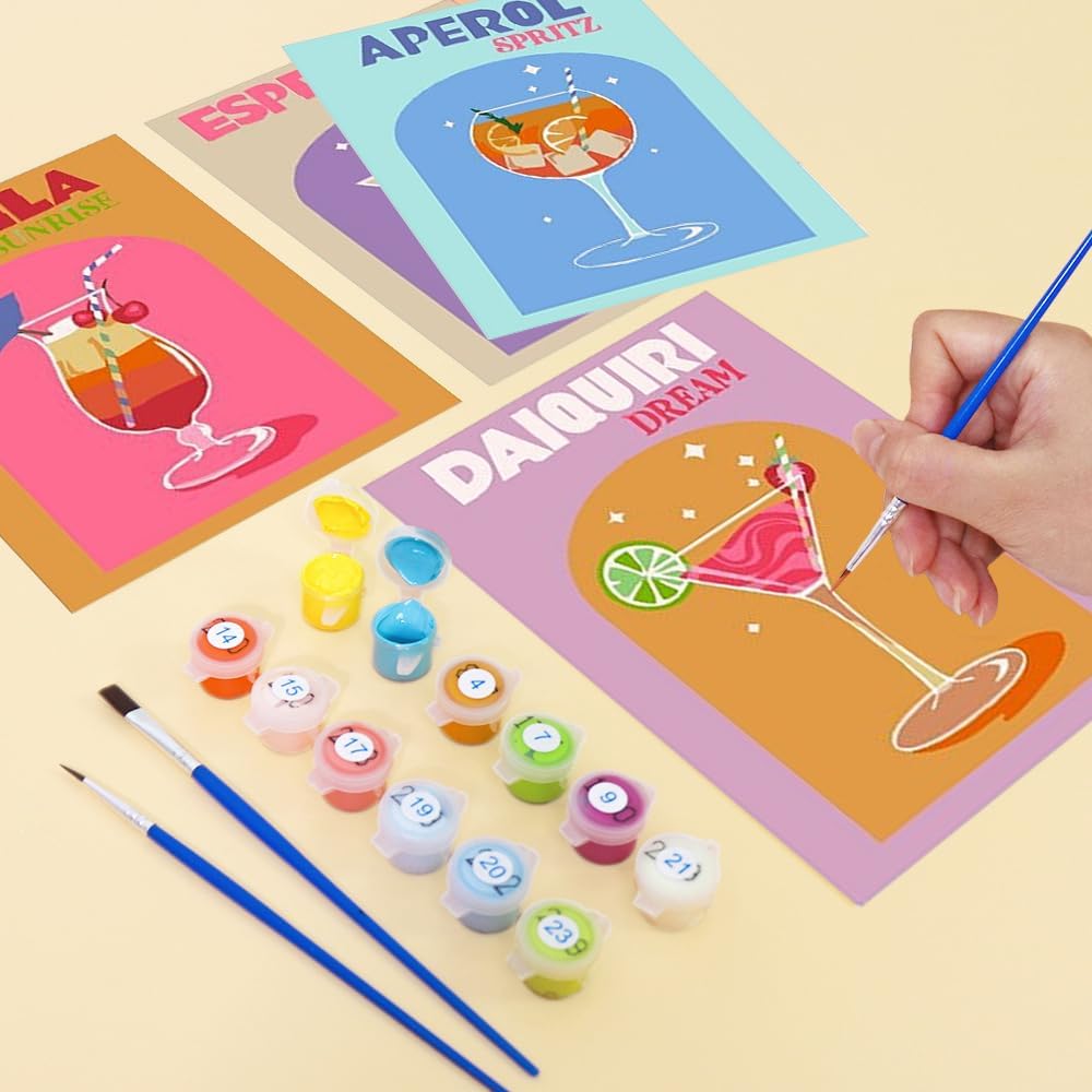 Set di accessori: Questo kit da 6 pezzi per dipingere con i numeri include 6 tele prestampate di 20 x 30 cm con moderni motivi a tema cocktail, 3 pennelli e colori a sufficienza per un'esperienza completa. Fai da te: Questo kit per dipingere con i numeri è adatto ad adulti, bambini e principianti di tutte le età. Da soli o in compagnia di familiari e amici, goditi il piacere di dipingere e il tempo creativo dedicato al fai da te. Rilassamento e sollievo dallo stress: Questo kit per dipingere con i numeri ti immerge in un'attività rilassante e creativa che aiuta ad alleviare stress e ansia. Attraverso la pittura, puoi alleviare efficacemente lo stress del lavoro e della vita, rilassare corpo e mente e godere della gioia che l'arte porta con sé. Facile da dipingere: Questo kit da 6 pezzi per dipingere con i numeri non richiede conoscenze di base. Grazie al manuale di istruzioni incluso, puoi creare facilmente opere d'arte di grande impatto e provare il divertimento di un pittore professionista. Perfetto per decorazioni per la casa e regali: Questo set da 6 pezzi per dipingere con i numeri è una combinazione perfetta di divertimento e arte. Che si tratti di un compleanno, di una festa di formazione o di una festività importante come il Natale, è la scelta regalo perfetta.