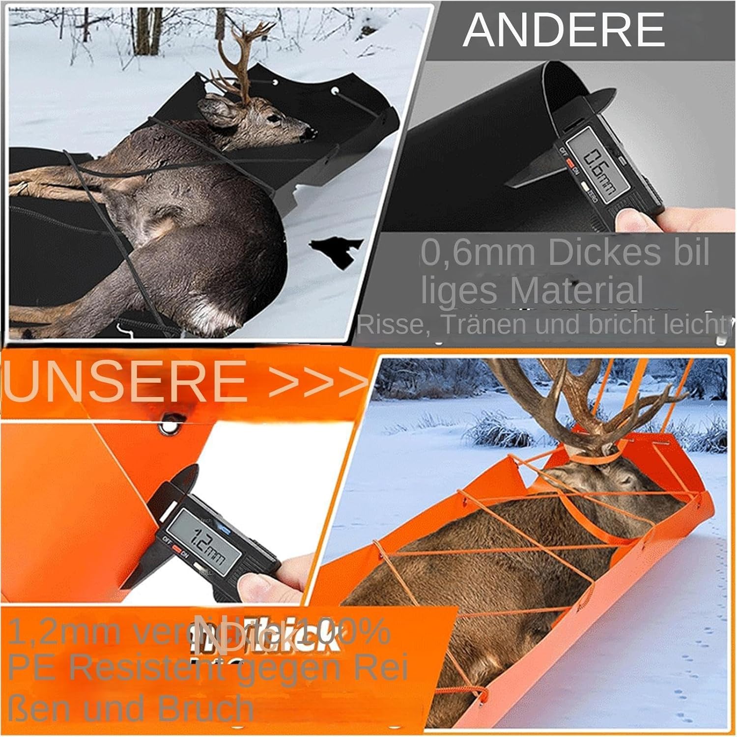 Ben realizzato: la slitta trainata da cervi è realizzata in materiale composito in PVC resistente e spesso 1,2 mm, che supera le prestazioni del tradizionale materiale spesso 0,6 mm. Ideale per la navigazione su vari terreni come erba, fango, sabbia, neve e neve. L'accattivante design arancione brillante aumenta la visibilità anche nell'erba profonda. Grandi fori per la corda: rivoluziona la tua esperienza di caccia con la nostra slitta Deer Drag, progettata con sei fori più larghi nella parte superiore per consentire un facile passaggio della corda da trasporto inclusa. Carica, scarica e trascina rapidamente la tua attrezzatura su vari terreni con facilità Facilità d'uso: Misurando 72,8 x 22,8 pollici e capacità di carico fino a 500 libbre, questa slitta offre spazio e stabilità sufficienti per la maggior parte dei trasporti di selvaggina, garantendo facilità d'uso Design multiuso: Progettato con molteplici funzionalità che garantiscono un facile trasporto e stoccaggio di oggetti come legna da ardere e attrezzatura da caccia, rendendolo essenziale per gli appassionati di outdoor Efficiente in termini di tempo: Rendi la caccia più facile e meno complicata con il nostro set di slitte trainate da cervi. Include una robusta slitta, una corda da traino larga 13,1 piedi e due corde lunghe 16,4 piedi per trascinare la preda in diagonale. Risparmia tempo ed energia e goditi più piacere di caccia con questo set robusto e affidabile