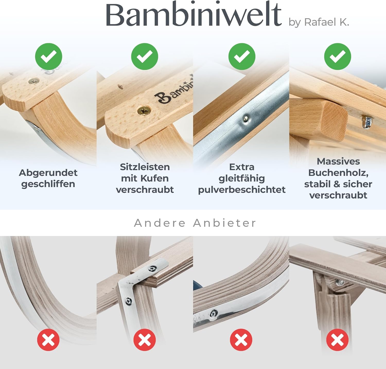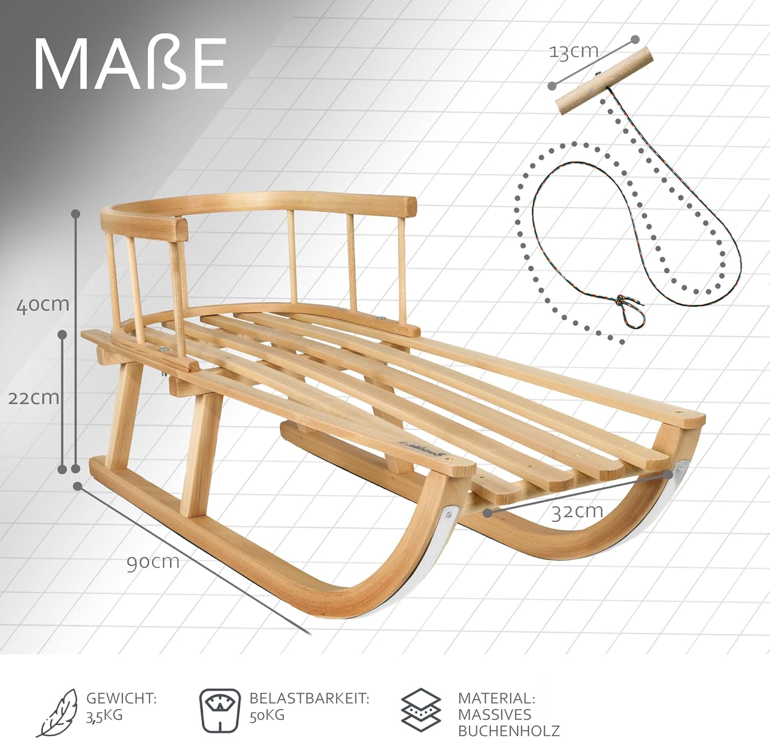 DIVERTIMENTO INVERNALE SICURO – La slitta in legno con schienale garantisce una posizione seduta stabile. Anche i bambini piccoli a partire dai 12 mesi si siedono in modo sicuro e confortevole, così tutta la famiglia può slittare in tutta tranquillità. ROBUSTO E DUREVOLE - Realizzato in legno massello di faggio, con doghe del sedile avvitate per una maggiore stabilità. Questa slitta resisterà per molti anni al divertimento invernale senza perdere la qualità. ELEVATA CAPACITÀ DI CARICO - Le guide in faggio lamellare sono particolarmente elastiche e resistenti. I raccordi di guida in acciaio arrotondati e scorrevoli garantiscono un'esperienza di guida leggera e dinamica. PRATICO E PREmuroso - Dotato di robusta fune da 5 mm e robusta maniglia in legno. Grazie alla vernice protettiva a base d'acqua, la slitta rimane protetta in modo affidabile anche in caso di gelo, neve e umidità. FAMIGLIA AMICA – Perfetto per le gite sulla neve. La combinazione di schienale, struttura robusta e maneggevolezza confortevole rende lo slittino il compagno ideale per bambini e genitori.