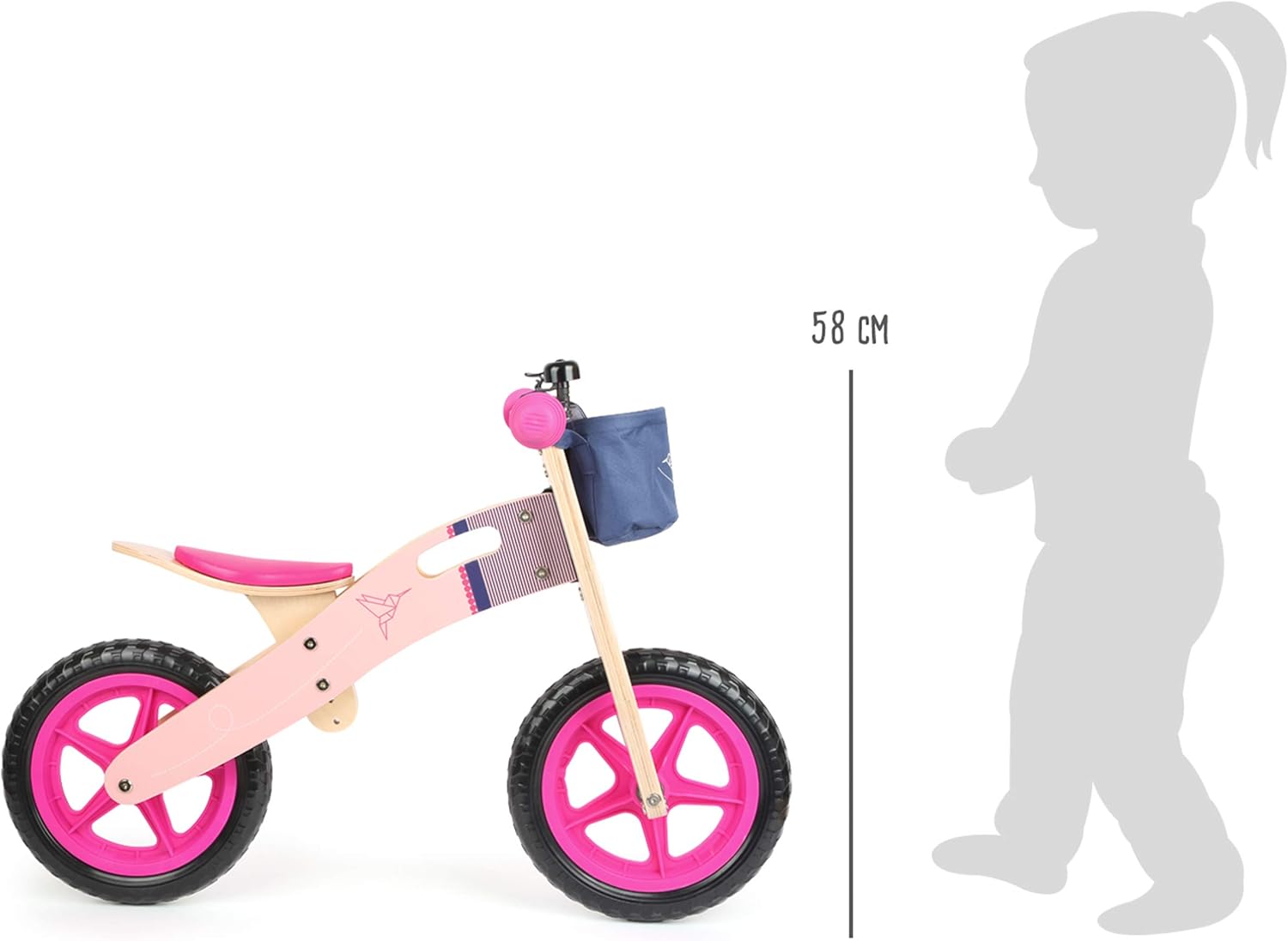 Realizzato in legno robusto e di alta qualità, compreso un cestino per biciclette in tessuto resistente, che viene fissato al manubrio con chiusure in velcro, ed un campanello per biciclette Questa biciclettina allena a stare in bilico ed il senso d'equilibrio del bambino, il quale si prepara già ad andare in bicicletta senza le rotelle. la biciclettina cresce con il bambino: la sella può essere regolata in altezza su tre livelli. Inclusa la cinghia per il trasporto che può essere fissata rapidamente alla biciclettina e che permette agli adulti di trasportare comodamente la biciclettina in lla. le impugnature presentano una limitazione nello sterzo, evitando che le dita rimangano incastrate e schiacciate in caso di caduta.