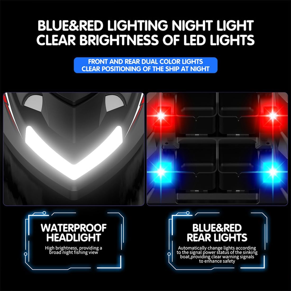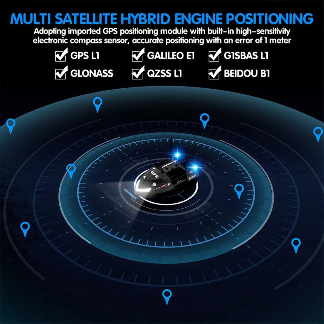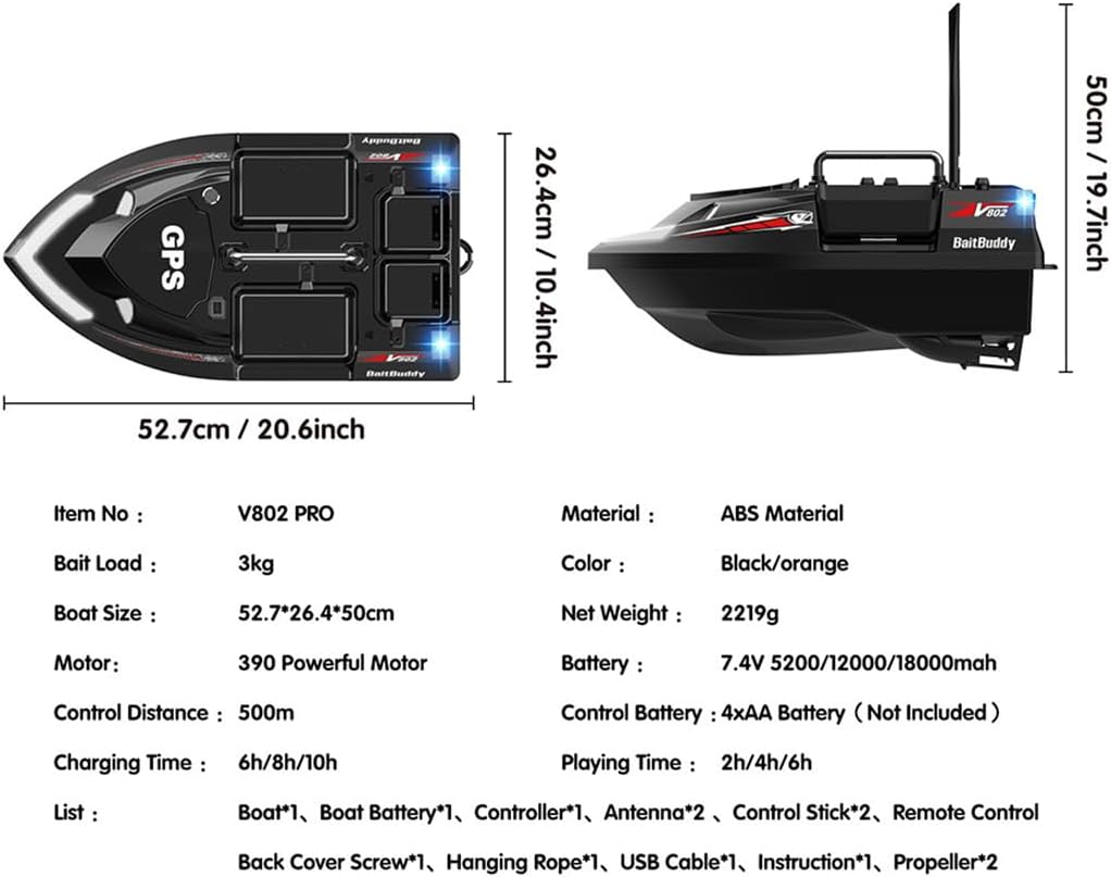 Design indipendente a 4 esche Hopper: quattro scomparti per esche controllati individualmente consentono un'esca precisa multi-punto, trasportando fino a 3 kg di esca, perfetta per mirare a punti diversi senza dover ricaricare Navigazione intelligente con correzione automatica: naviga con precisione utilizzando i controlli avanti/indietro, sinistra/destra, giroscopio integrato per la correzione dell'imbardata e le modalità di crociera (velocità costante di crociera). Pianificazione intelligente del percorso anche in acque complesse RC affidabile a lungo raggio: le doppie antenne ad alto guadagno forniscono un controllo stabile fino a 500 metri. Supporta la trasmissione a distanza in tempo reale, la consegna della lenza tramite attacco a gancio e l'integrazione opzionale del cercatore di pesci per il massimo controllo della pesca Funzionamento notturno con doppia batteria: dispone di due linee di alimentazione per alimentazione ininterrotta, avvisi di batteria scarica e luci di navigazione luminose con indicatori anteriori e posteriori. Due modalità di illuminazione (fissa/lampeggiante) rendono la pesca notturna sicura ed efficace Sistema GPS avanzato con memoria multi-punto: il sistema Beidou + GPS integrato supporta 4 zone di pesca e fino a 160 punti di esca, con caratteristiche come ritorno a un tasto, ritorno della batteria scarica, ritorno della perdita di segnale e ritorno limitato per una maggiore sicurezza e convenienza